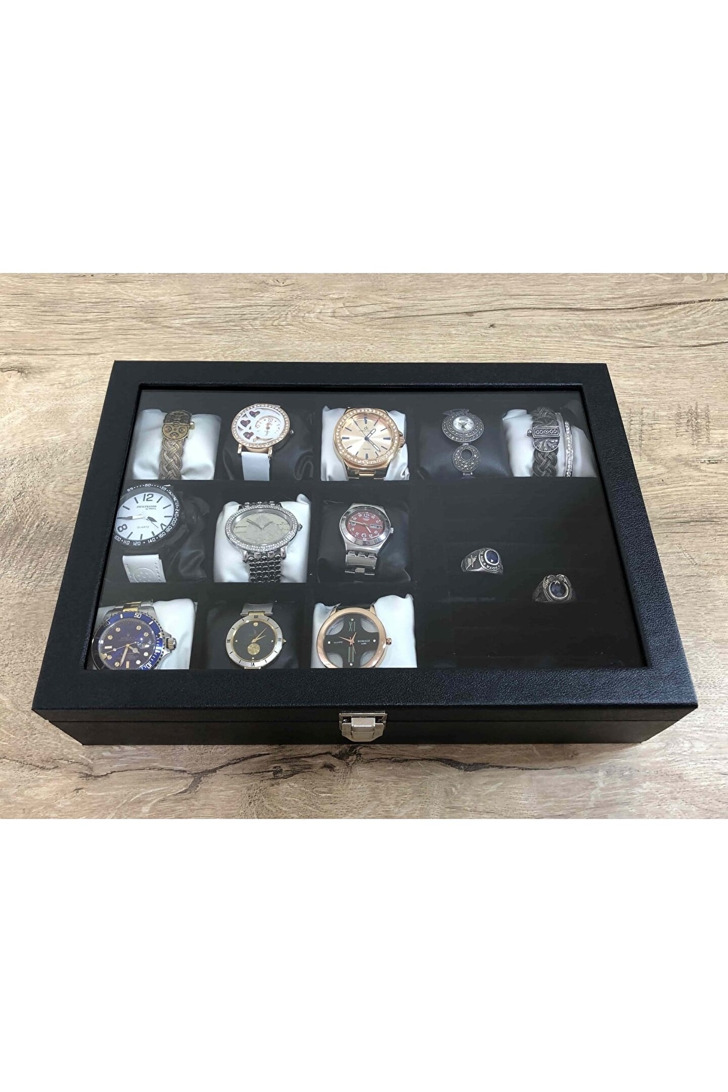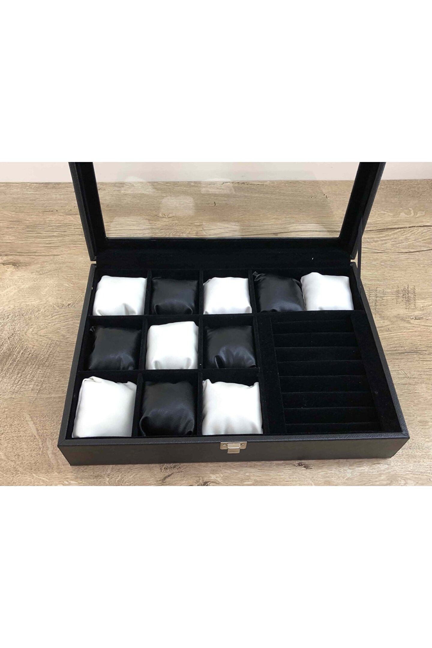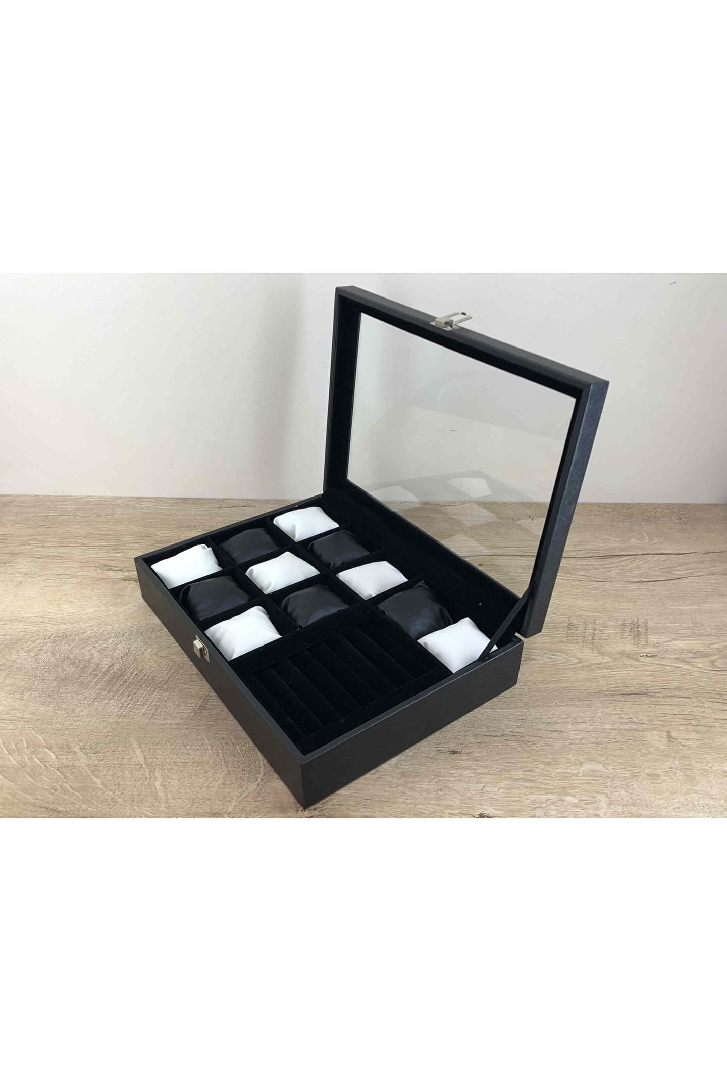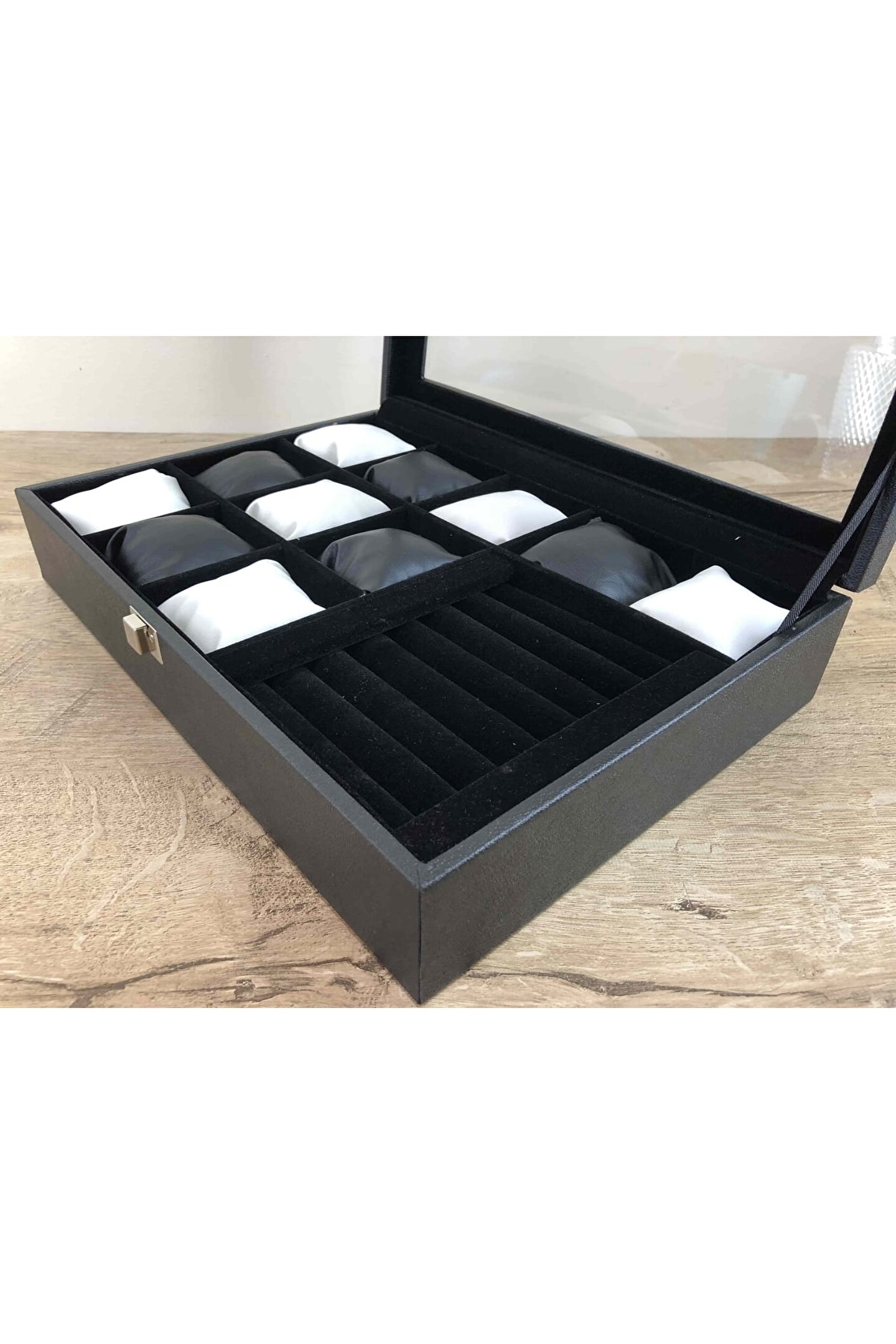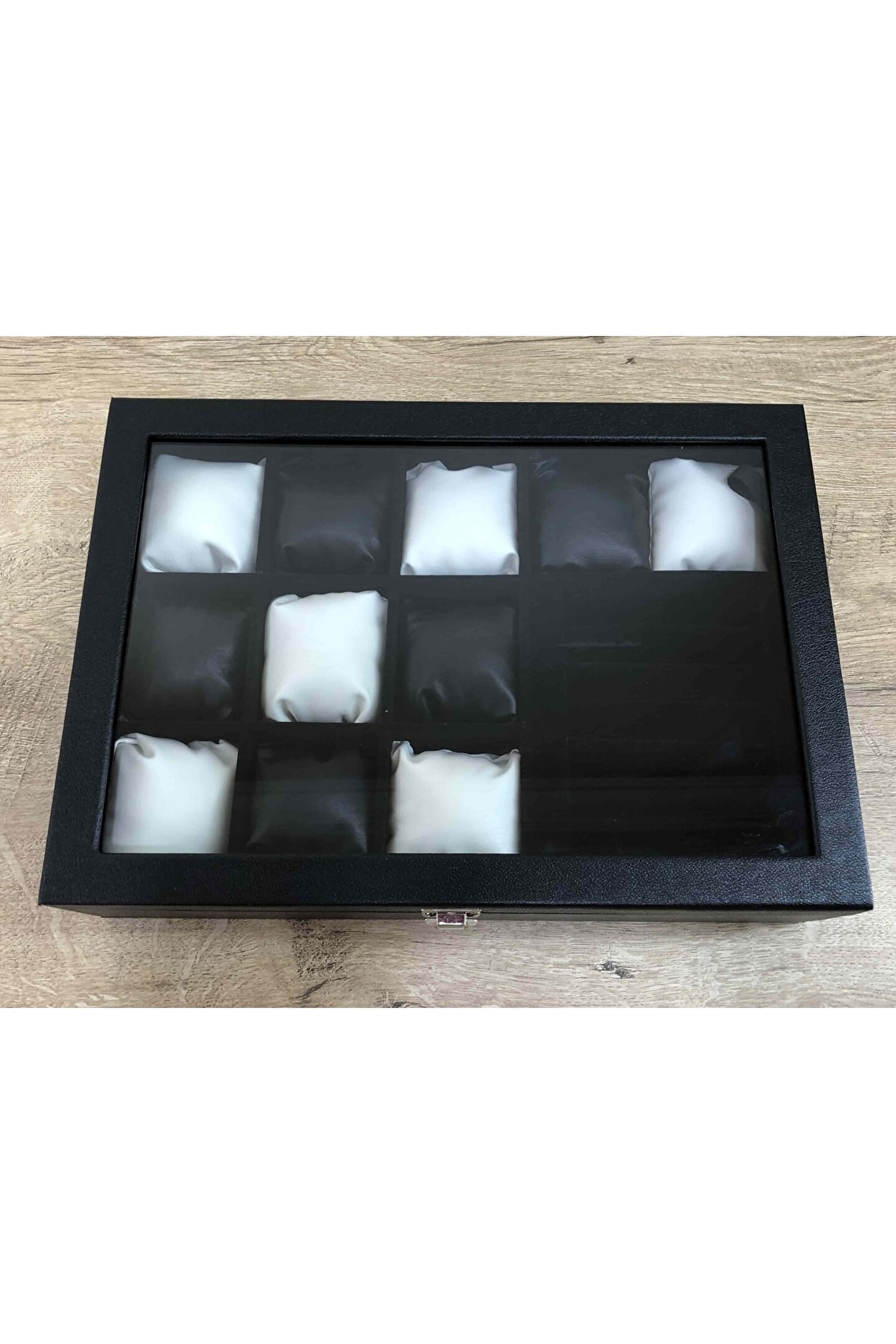 11 Bölmeli Özel Üretim Deri Görünümlü El Yapımı Camlı Görsel Kol Saati Bileklik Kolye Yüzük Taki Alyans Kutusu Display Stand %100 Orjinal Türk Malıdır Türkiyede Üretilmiştir Çin Malı Değildir İmalattan Halka Satış Tamamen El Yapımıdır 11 adet Büyük Boy Gözlüdür 7 Sıra Özel Yüzük ve Takı Bölümü Özel Üretim Deri Görünümlü Vinlex Kaplama 11 Adet Beyaz Vinlex Kaplama Yastık Silikon Dolgulu Yumuşak yastıklar Her Boyuttaki Saatlere Kolaylıkla Uyar Spor ve Klasik Saatler için Uygundur Bayan ve Erkek Modellerine Uyumludur BOYUTLARI : Dış Kutu Boy : 241mm Dış Kutu En : 341mm. ; Dış Kutu Yükseklik : 81mm. ; İç Göz Boy : 7.1mm. ; İç Göz En : 6.1mm. ; İç Göz Yükseklik : 7.1mm. ; İç Takı Yüzük Bölümü Boy : 149mm. ; İç Takı Yüzük Bölümü En : 95mm. ; İç Takı Yüzük Bölümü Yükseklik : 45mm. ; Kilit En : 25mm. ; Kilit Boy : 32mm. ; Mentese Boy : 18mm. ; Mentese En : 21mm. ; Resimler Orjinal kendi çekimlerimizdir Resimdeki Saat Kutusu Gönderilicektir Ürünlerin Hepsi Stoklarımızda Mevcuttur Stoktan Aynı gün Anlaşmalı Kargo ile Adresinize Gönderilmektedir Ana Gövde : 5mm. ; Ahşap Gövde Üstü : 2mm Mukavva İç Kaplama : Özel Tüy Dökmez Siyah Kadife Yastıklar : Siyah & Beyaz Yumuşak ince Vinlex Yastık Dolgu : Beyaz Yumuşak Silikon Dış Kaplama : PU Leather Vinlex Cam : 1.8mm Kalınlık Kilit : Metal Menteşe : Metal DİĞER ÜRÜNLERİMİZE BAKMANIZI TAVSİYE EDERİZ;