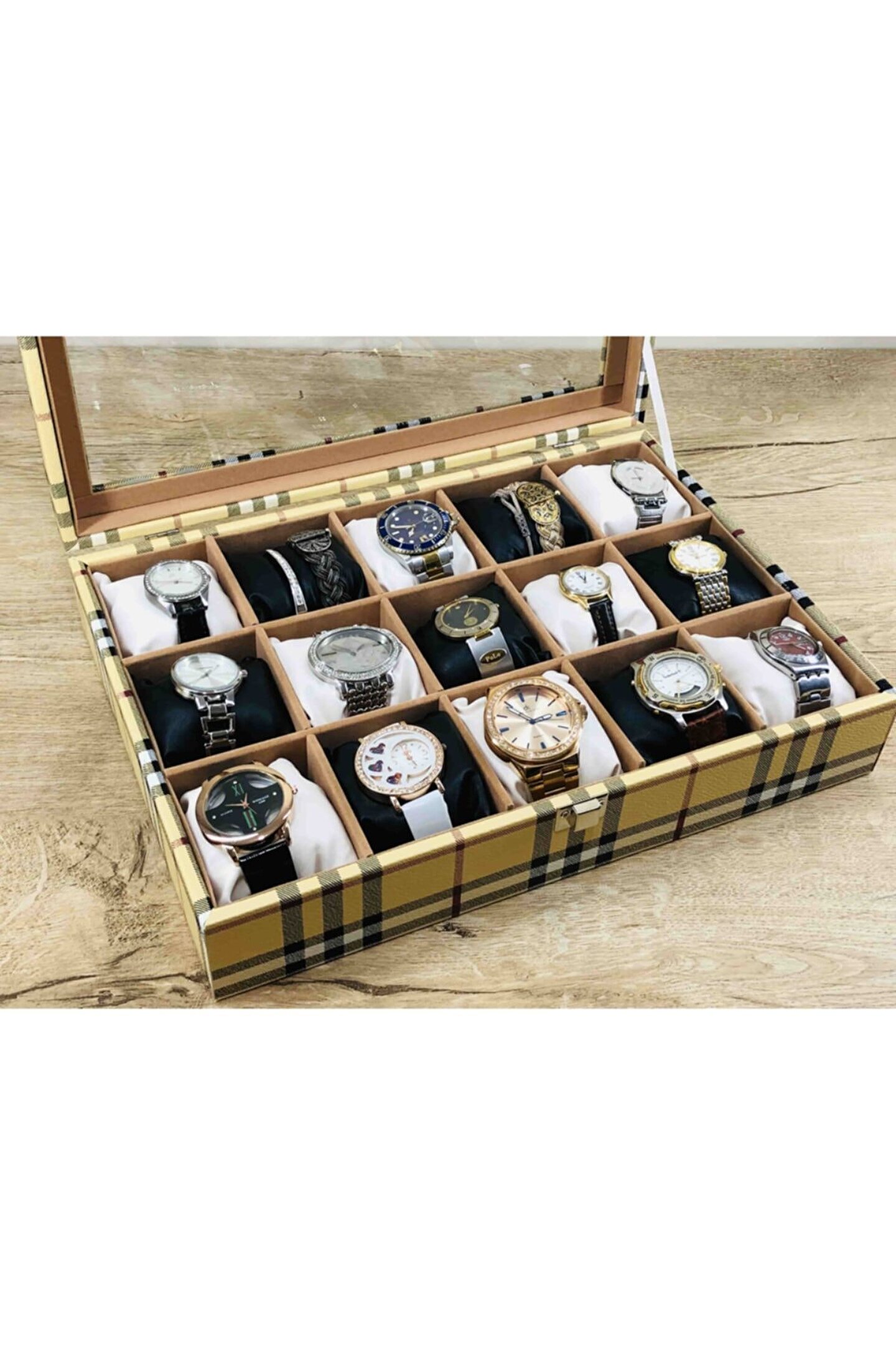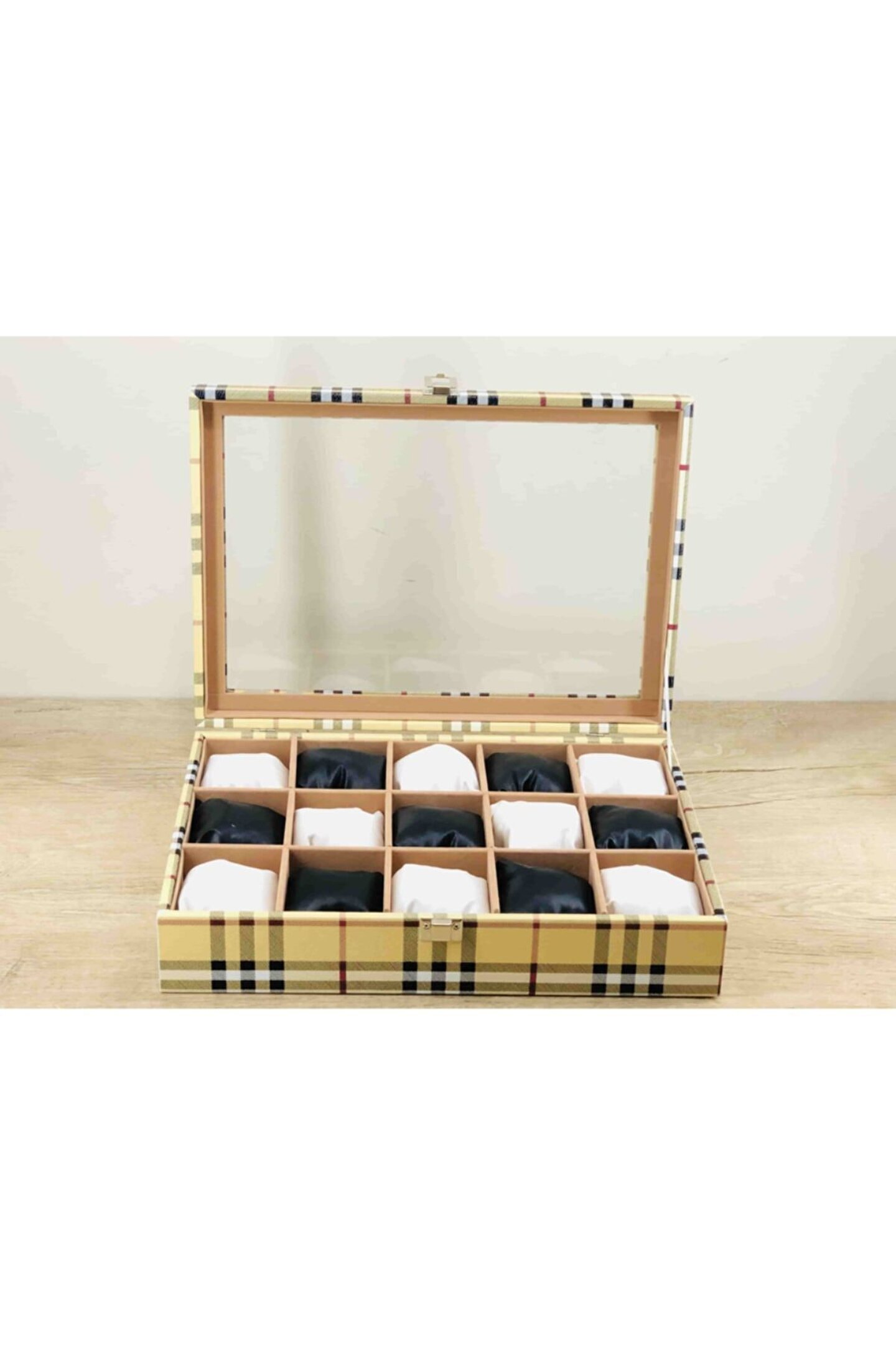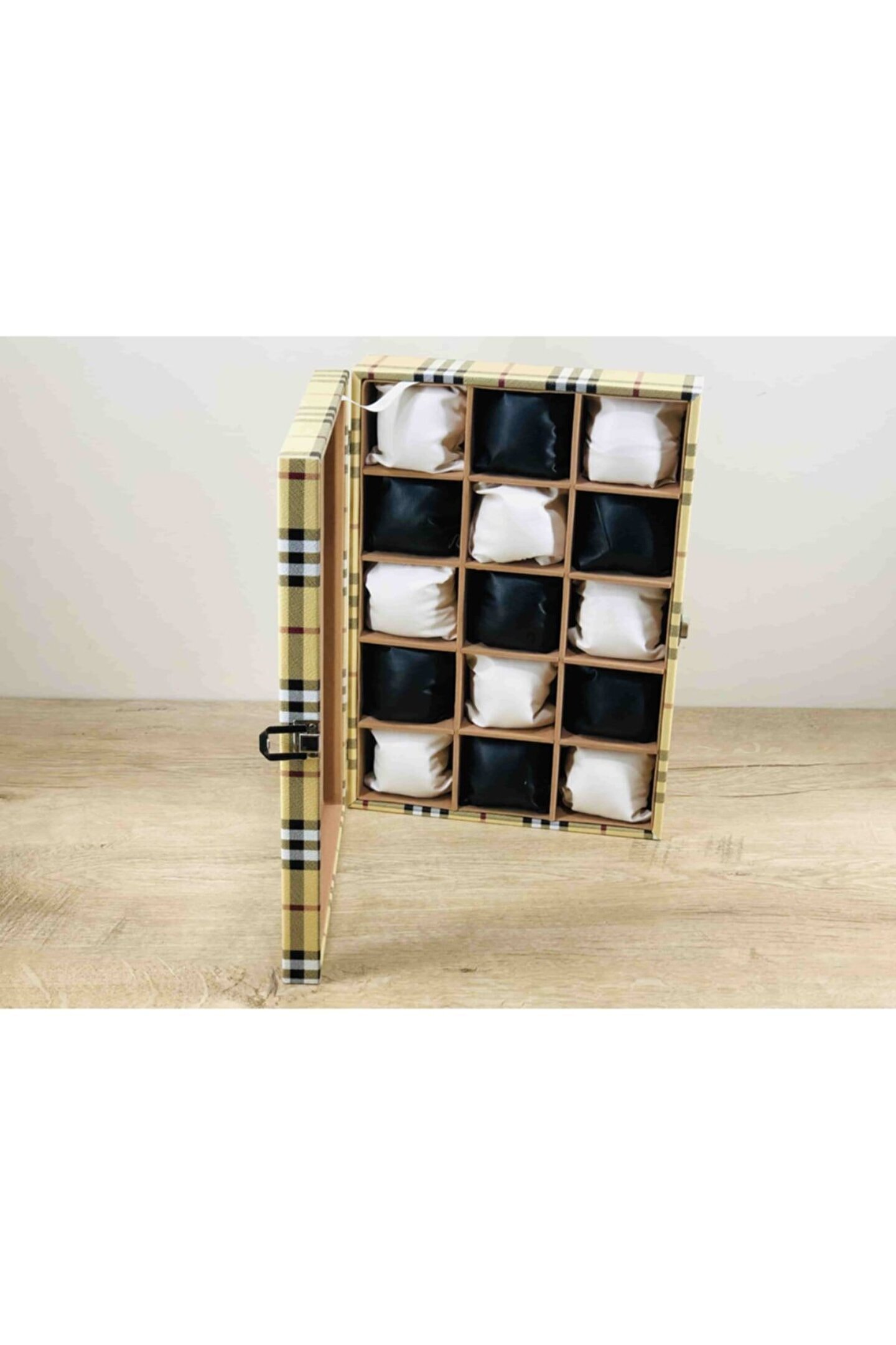 %100 orijinal türk malıdır türkiye'de üretilmiştir çin malı değildir imalattan halka satış fabrikasyon yapımı değildir tamamen el yapımıdır 15 adet büyük boy gözlüdür 15 adet siyah bayez vinlex kaplama yastıklar silikon dolgulu yumuşak yastıklar her boyuttaki saatlere kolaylıkla uyar spor ve klasik saatler için uygundur kadın ve erkek modellerine uyumludur yurt dışına gönderim ve imzalı teslimat vardır boyutları : Dış kutu boy : 241mm dış kutu en : 341mm. ; Dış kutu yükseklik : 81mm. ; Iç göz boy : 7.1mm. ; Iç göz en : 6.1mm. ; Iç göz yükseklik : 7.1mm. ; Kilit en : 25mm. ; Kilit boy : 32mm. ; Mentese boy : 18mm. ; Mentese en : 21mm. ; Resimler orjinal kendi çekimlerimizdir resimdeki saat kutusu gönderilicektir ürünlerin hepsi stoklarımızda mevcuttur stoktan aynı gün anlaşmalı kargo ile adresinize gönderilmektedir ana gövde : 5mm. ; Ahşap gövde üstü : 2mm mukavva iç kaplama;