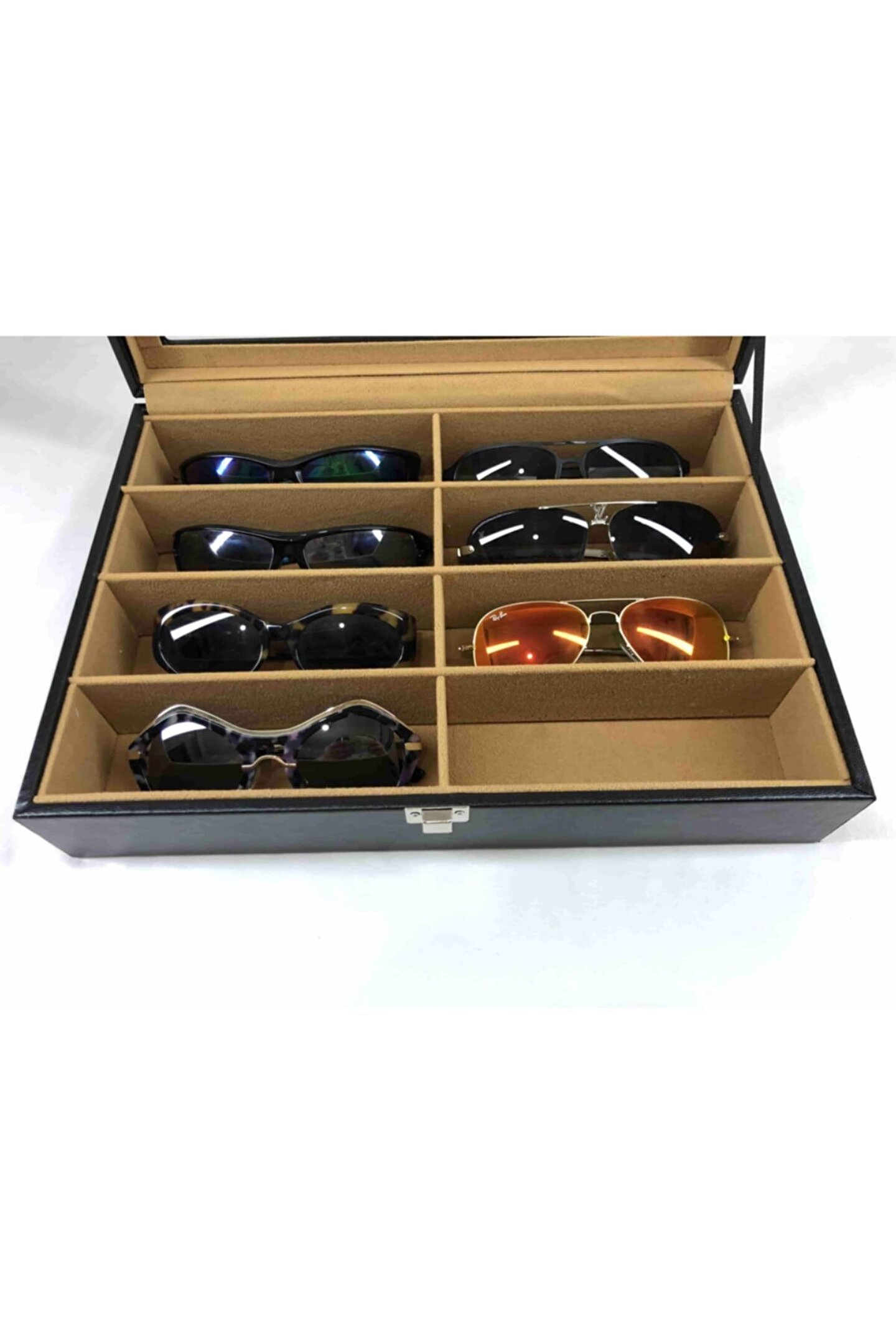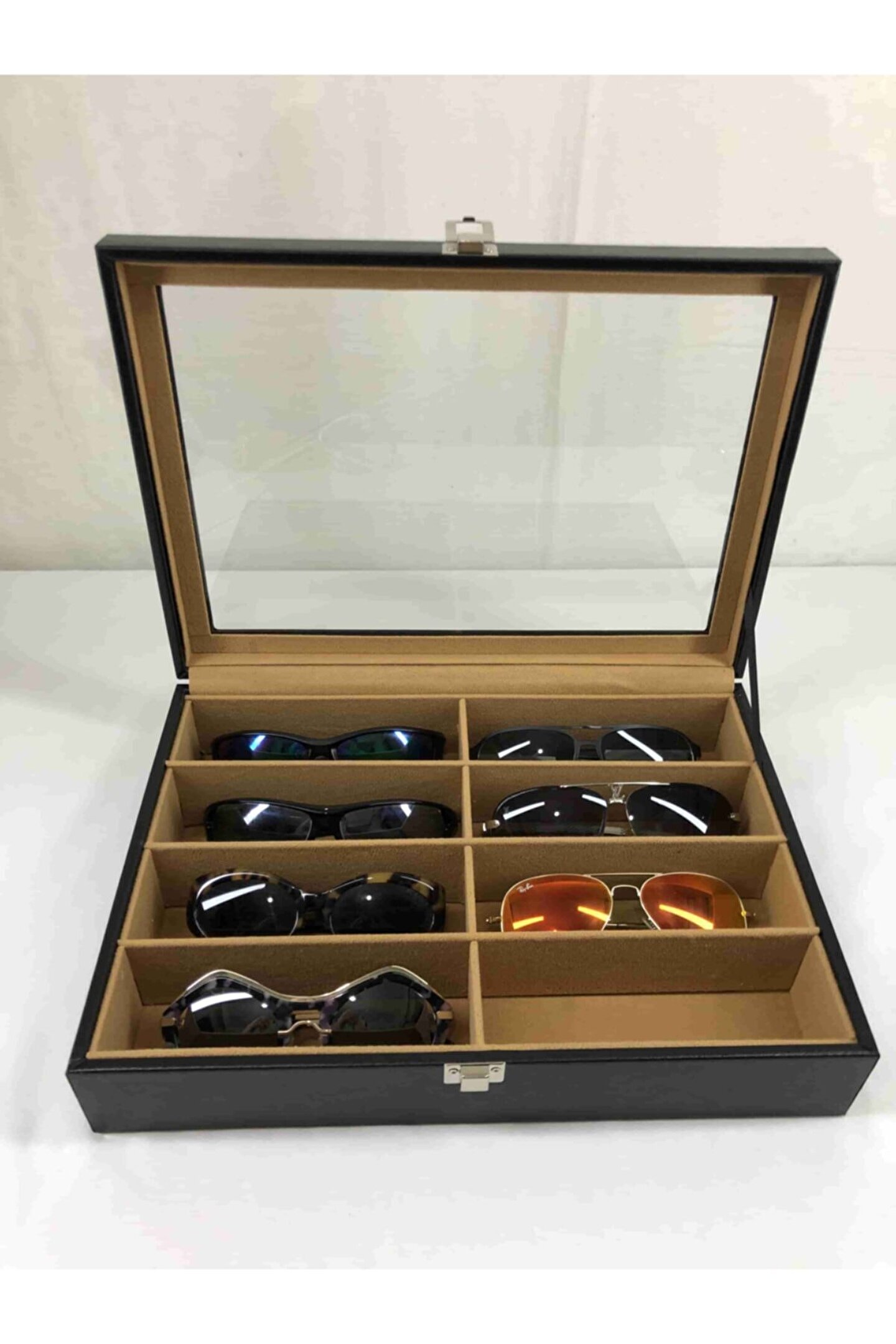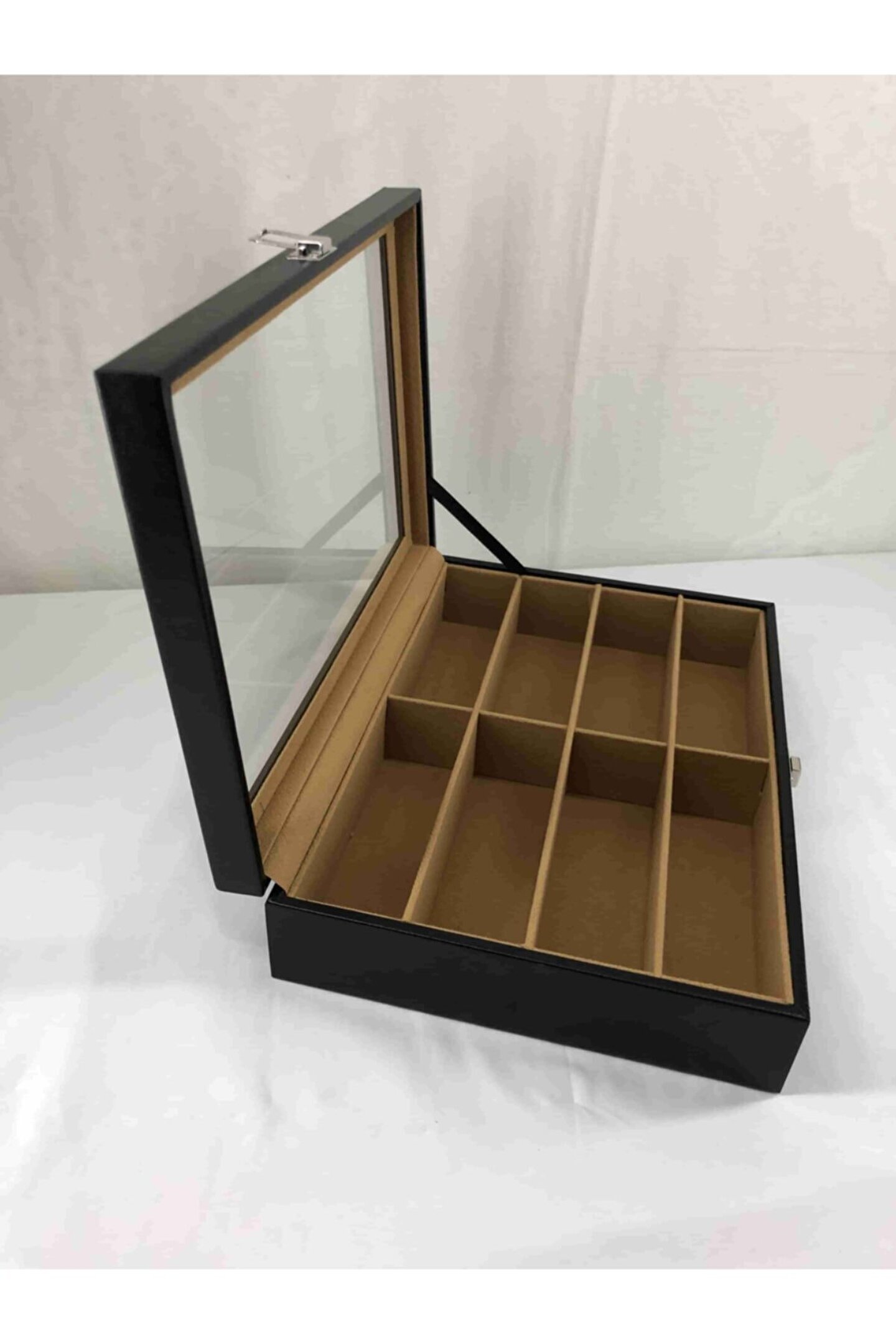 8 adet gözlük saklama bölüm bulunan özel el yapımı saklama kutusu Iç kısmı kahverengi kadife kaplı Dış kısmı siyah deri kaplama %100 orijinal türk malıdır Türkiye de üretilmiştir Çin malı değildir Imalattan halka satış Tamamen el yapımıdır Spor ve klasik gözlüükler için uygundur Boyutları : Dış kutu boy : 241mm Dış kutu en : 341mm. ; Dış kutu yükseklik : 81mm. ; Kilit en : 25mm. ; Kilit boy : 32mm. ; Kilit : Metal Menteşe boy : 18mm. ; Menteşe en : 21mm. ; Menteşe : Metal Ana gövde : 5mm. ; Ahşap Gövde üstü : 2mm mukavva Iç kaplama : Özel tüy dökmez kahverengi kadife Dış kaplama : Pu leather vinlex Cam : 1.8mm kalınlık Resimler orijinal kendi çekimlerimizdir Resimdeki gözlük kutusu gönderilecektir;