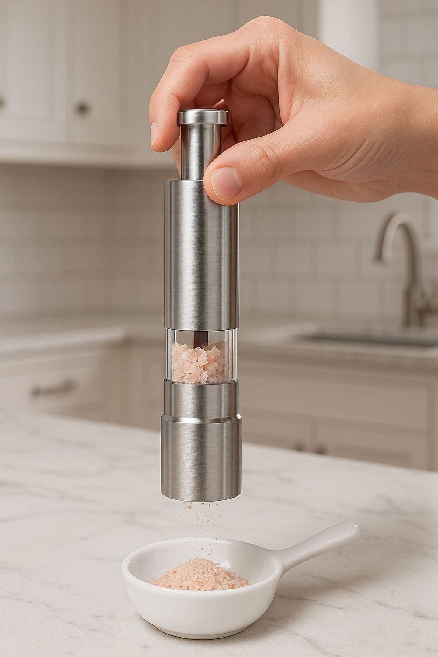 Paslanmaz Çelik Tek Elle Kullanılabilir Manuel Tuz ve Karabiber Öğütücü ; Ürün Özellikleri: •Malzeme: Paslanmaz çelik + şeffaf akrilik gövde •Kullanım: Tuz, karabiber, kaya tuzu, himalaya tuzu, kişniş, kimyon gibi taneli baharatlar •Tek elle kullanım kolaylığı sağlayan yaylı sistem •Yüksek kaliteli seramik öğütücü mekanizması •Şeffaf hazne ile içerik kontrolü kolaylığı •Şık ve modern tasarımı ile mutfağa estetik katkı •Kaymaz, dayanıklı ve ergonomik yapı