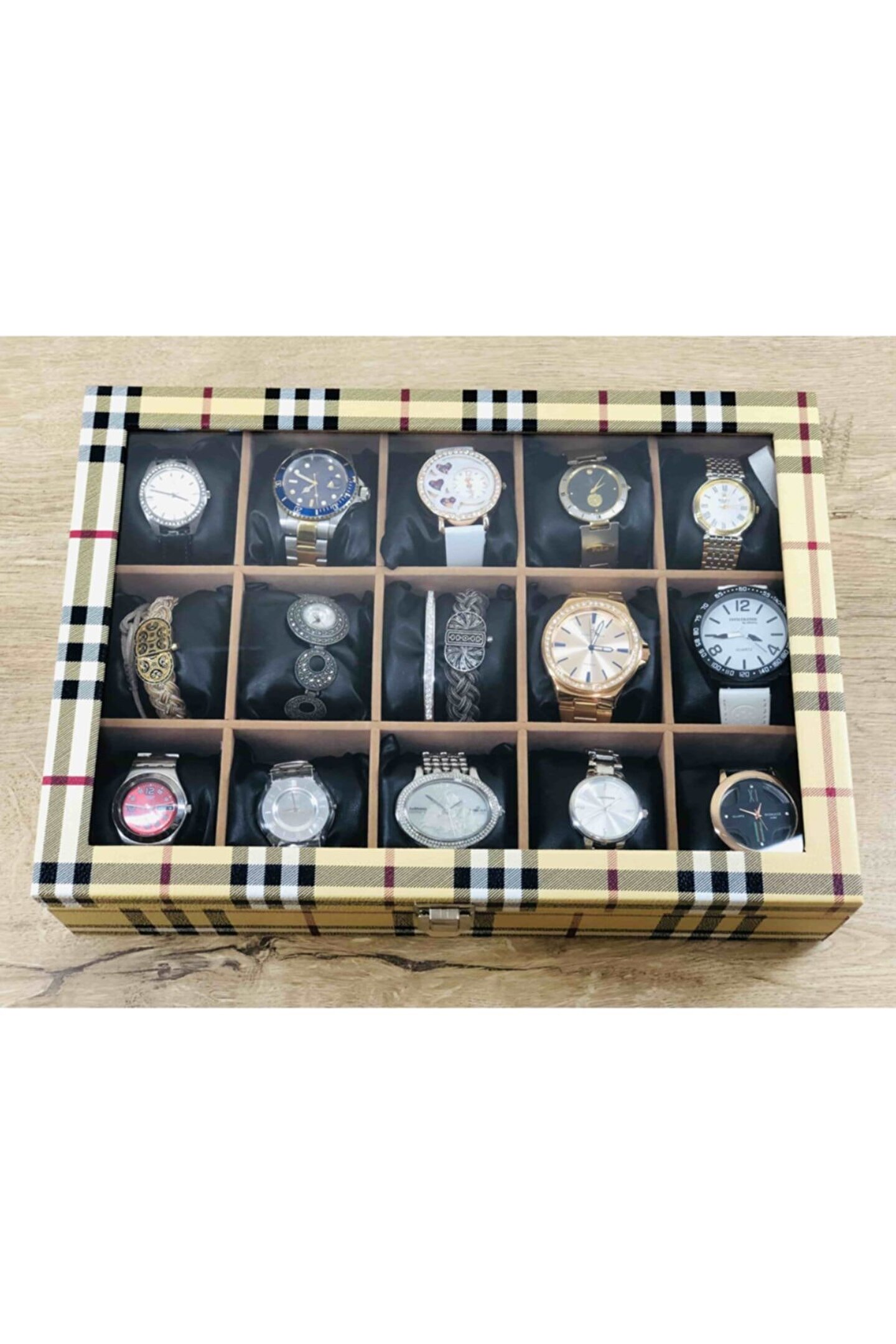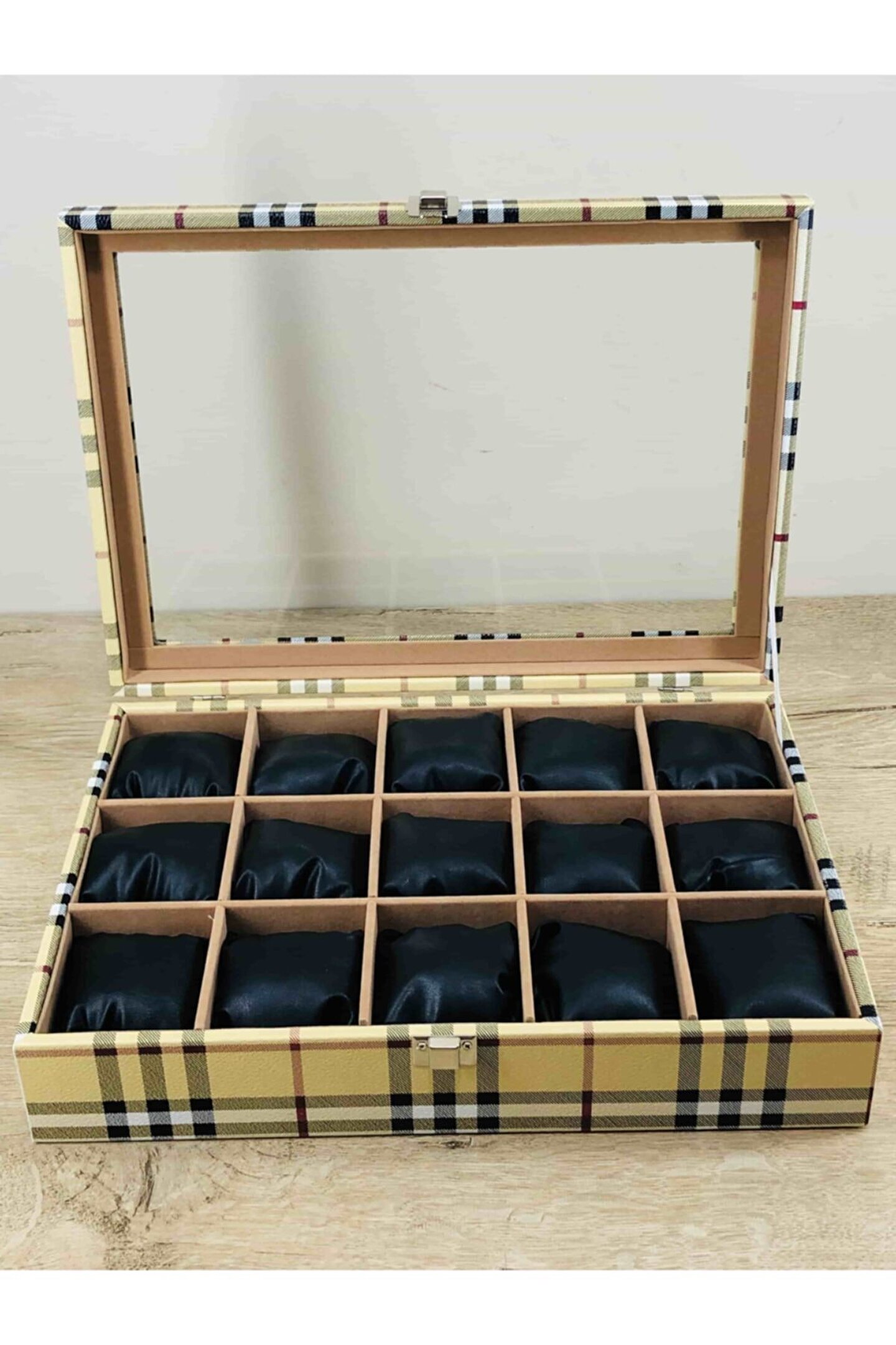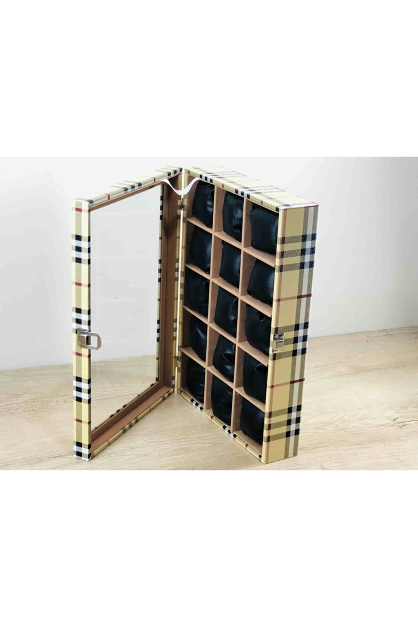 %100 Orijinal Türk Malıdır Türkiye'de Üretilmiştir Çin Malı Değildir İmalattan Halka Satış Fabrikasyon Yapımı Değildir Tamamen El Yapımıdır 15 adet Büyük Boy Gözlüdür 15 Adet Siyah Vinlex Kaplama Yastık Silikon Dolgulu Yumuşak yastıklar Her Boyuttaki Saatlere Kolaylıkla Uyar Spor ve Klasik Saatler için Uygundur Bayan ve Erkek Modellerine Uyumludur Yurt Dışına Gönderim ve İmzalı Teslimat vardır BOYUTLARI : Dış Kutu Boy : 241mm Dış Kutu En : 341mm. ; Dış Kutu Yükseklik : 81mm. ; İç Göz Boy : 7.1mm. ; İç Göz En : 6.1mm. ; İç Göz Yükseklik : 7.1mm. ; Kilit En : 25mm. ; Kilit Boy : 32mm. ; Mentese Boy : 18mm. ; Mentese En : 21mm. ; Resimler Orjinal kendi çekimlerimizdir Resimdeki Saat Kutusu Gönderilicektir Ürünlerin Hepsi Stoklarımızda Mevcuttur Stoktan Aynı gün Anlaşmalı Kargo ile Adresinize Gönderilmektedir Ana Gövde : 5mm. ; Ahşap Gövde Üstü : 2mm Mukavva İç Kaplama :;