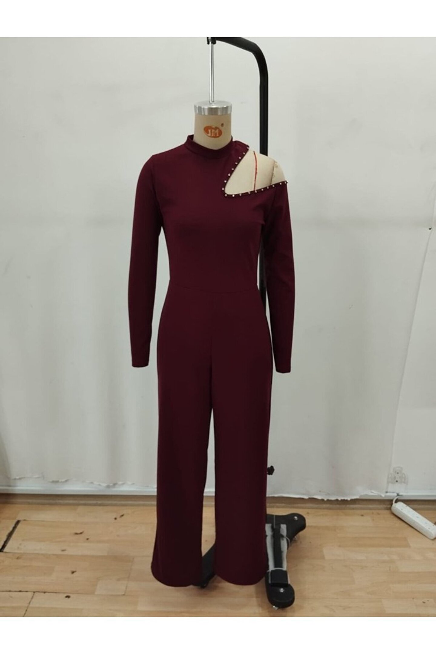 Kadın Tek Omuzdan Açık Balıkçı Yaka Taş Detaylı Uzun Ithal Krep Tulum