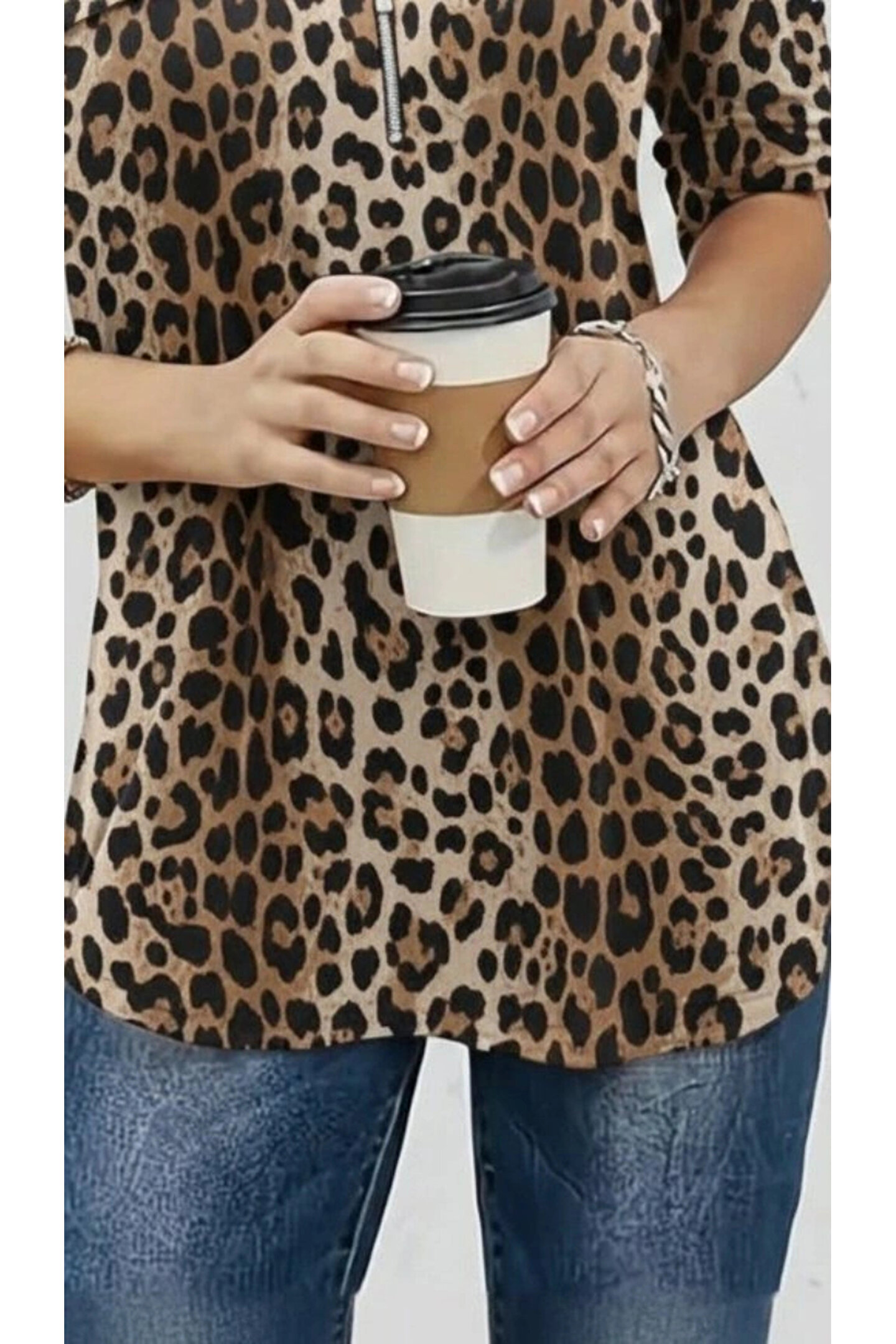 Kadın Uzun Kollu Hakim Yaka Yakadan Fermuarlı Geometrik Desenli Süprem Bluz