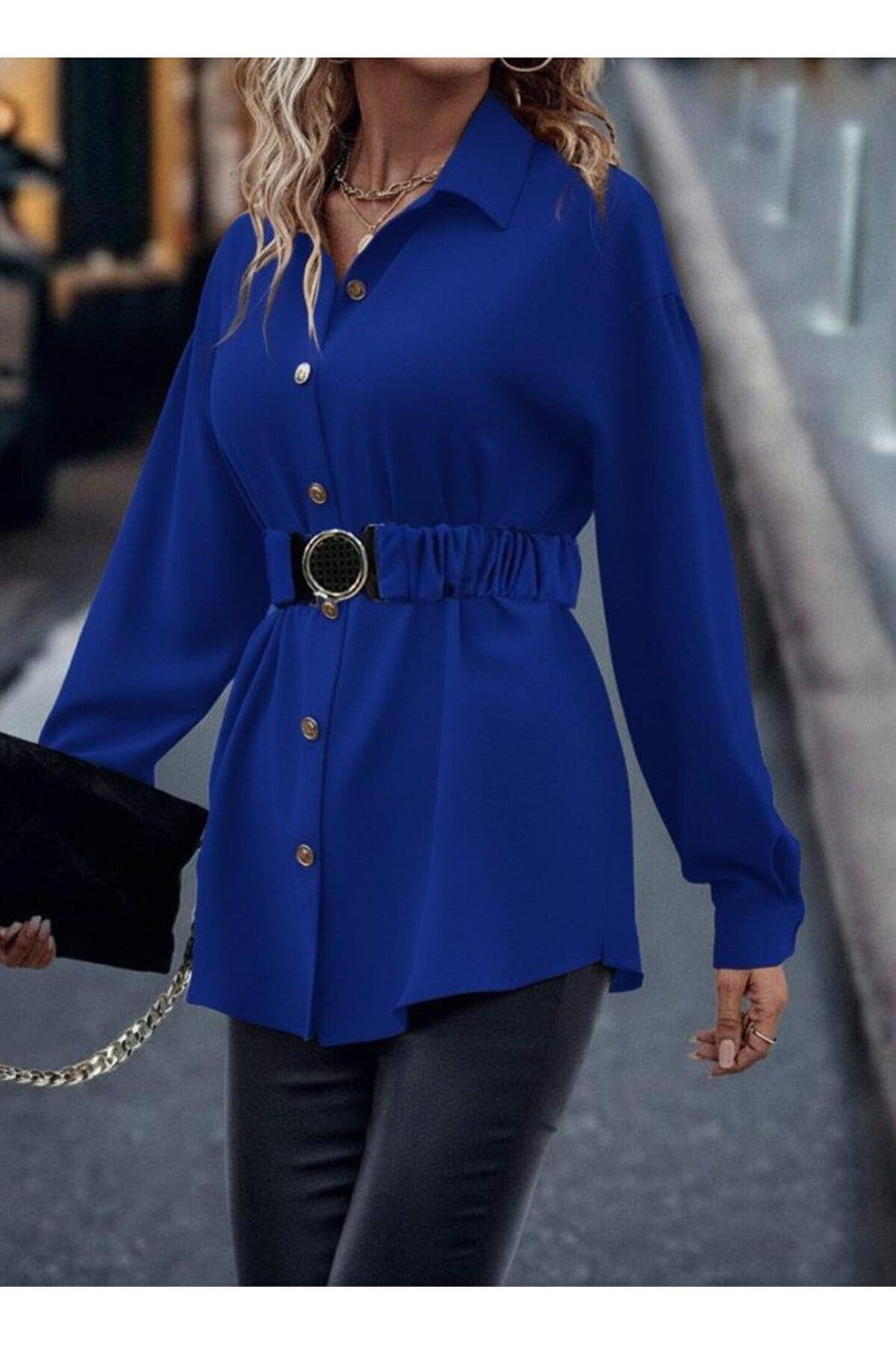 Kadın Uzun Kollu Yakalı önden Düğmeli Belden Kemerli Ithal Krep Bluz