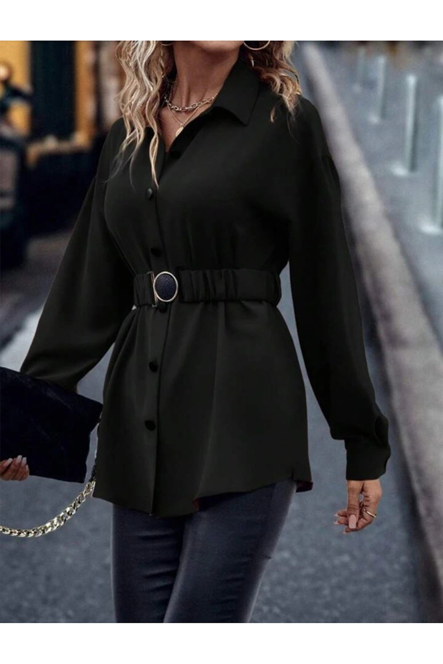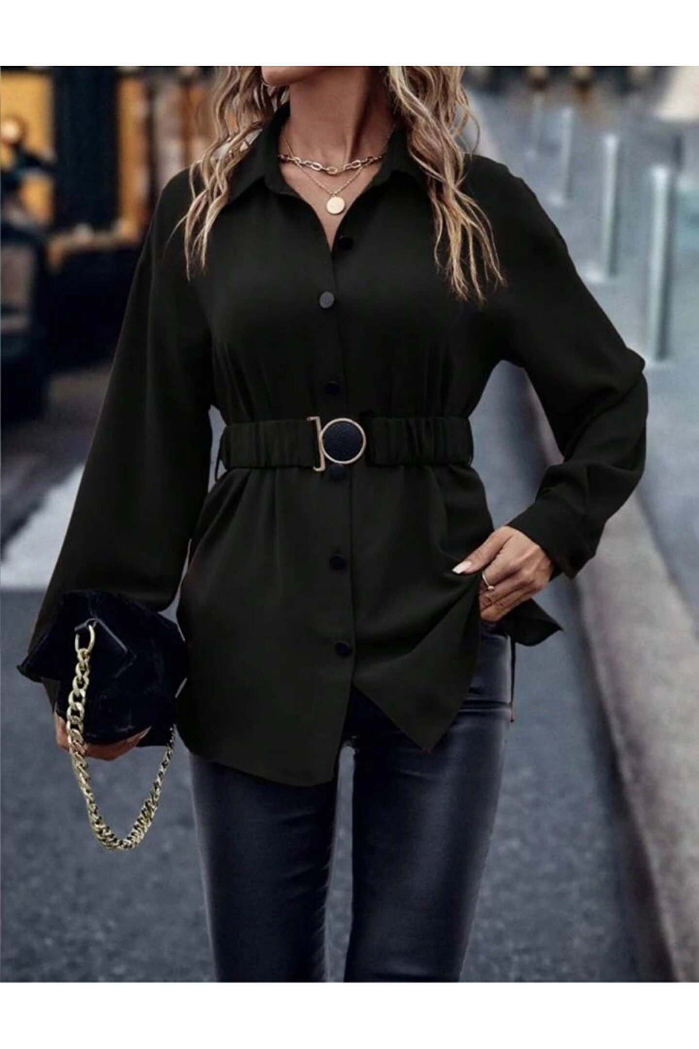 Kadın Uzun Kollu Yakalı önden Düğmeli Belden Kemerli Ithal Krep Bluz