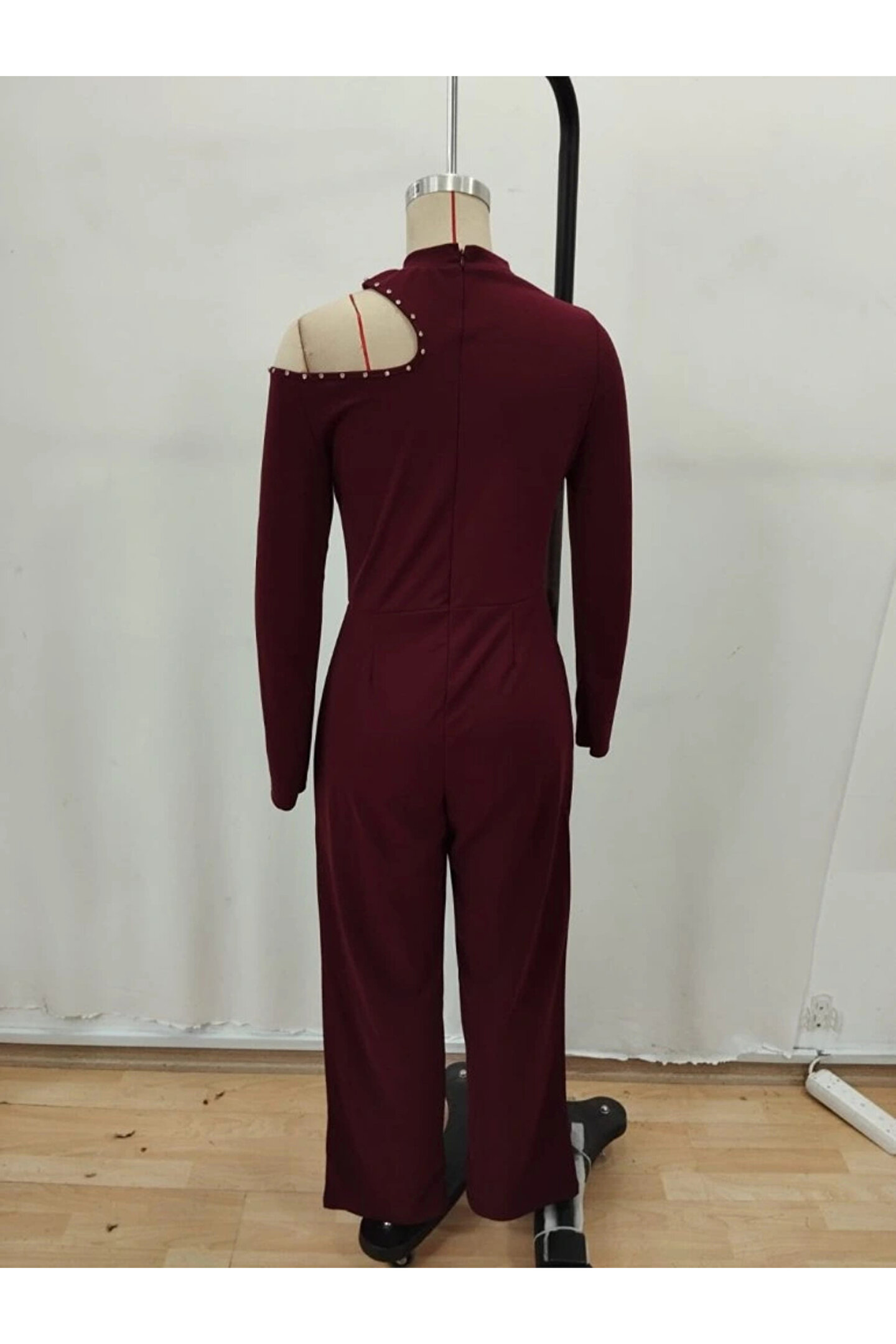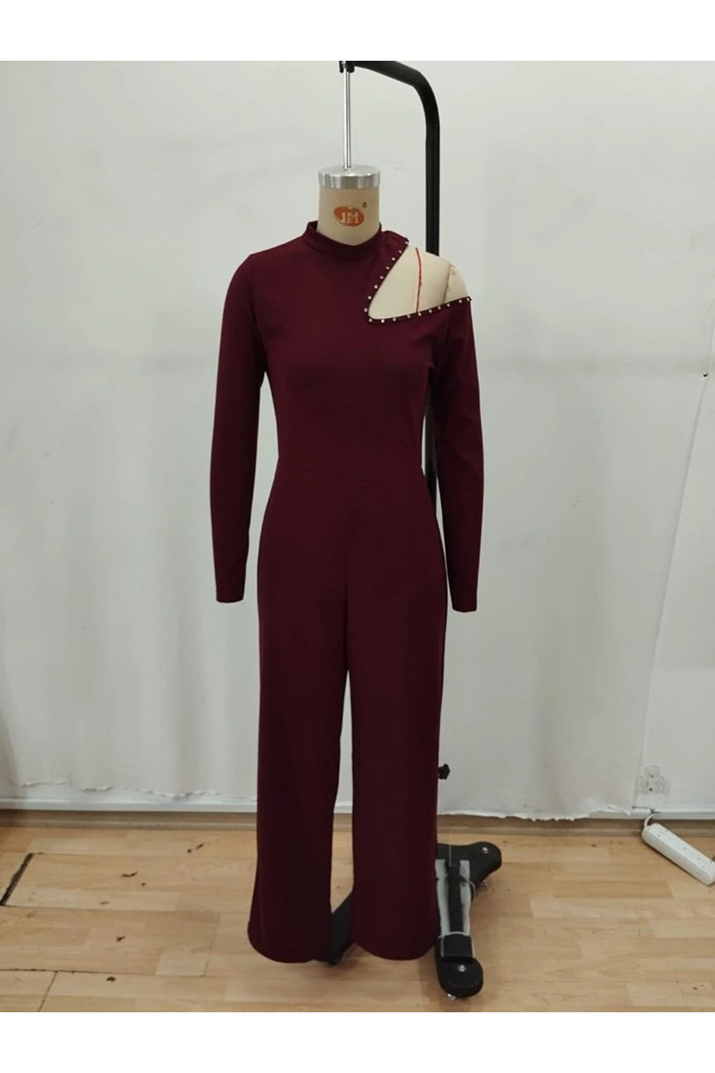 KentselBazaar MDB Kadın Tek Omuzdan Açık Balıkçı Yaka Taş Detaylı Uzun Ithal Krep Tulum