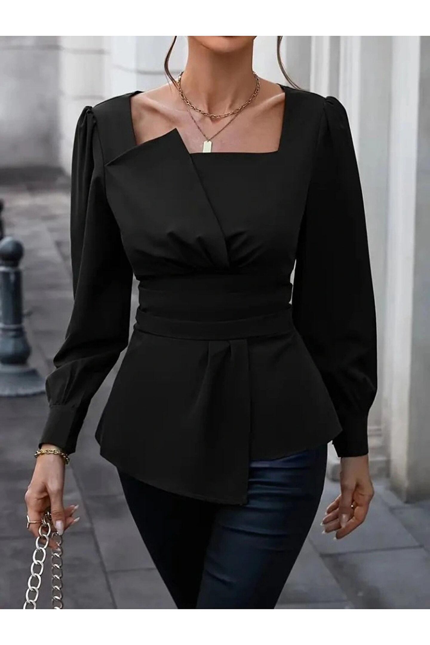 - Geometrik yakalı ve belden oturmalı tasarımıyla modern ve şık bir görünüm sunar.; - Uzun kollu yapısı ile mevsim geçişlerinde ideal konfor ve şıklığı bir arada sağlar.; - Krep dokuma tipi, yumuşak dokusuyla gün boyu rahat bir kullanım imkanı sunar.; - Sürdürülebilirlik detayı ile çevre dostu bir tercih yapmanızı sağlar.; - Baskısız yüzeyiyle sade ve zarif bir stil oluştururken, baskı veya nakış detayları ile de kolayca kombinlenebilir.; - Kapsız tasarımı sayesinde hafif ve rahat bir kullanım sunarken, orta kalınlıkta kumaşı mevsim geçişlerinde idealdir.; - Astarsız yapısıyla nefes alabilirlik ve konforu ön planda tutar.; - Kokteyl ortamları için uygun olan bu bluz, feminen çizgileriyle dikkat çeker.; - Kemersiz tasarım, vücut hatlarınıza uyum sağlayarak zarif bir siluet oluşturur.; - İlkbahar / Sonbahar sezonunda tercih edebileceğiniz bu bluz, gardrobunuzda yerini almayı bekliyor.; - Care koleksiyonunun bir parçası olarak, hem kaliteli hem de trenddir.;
