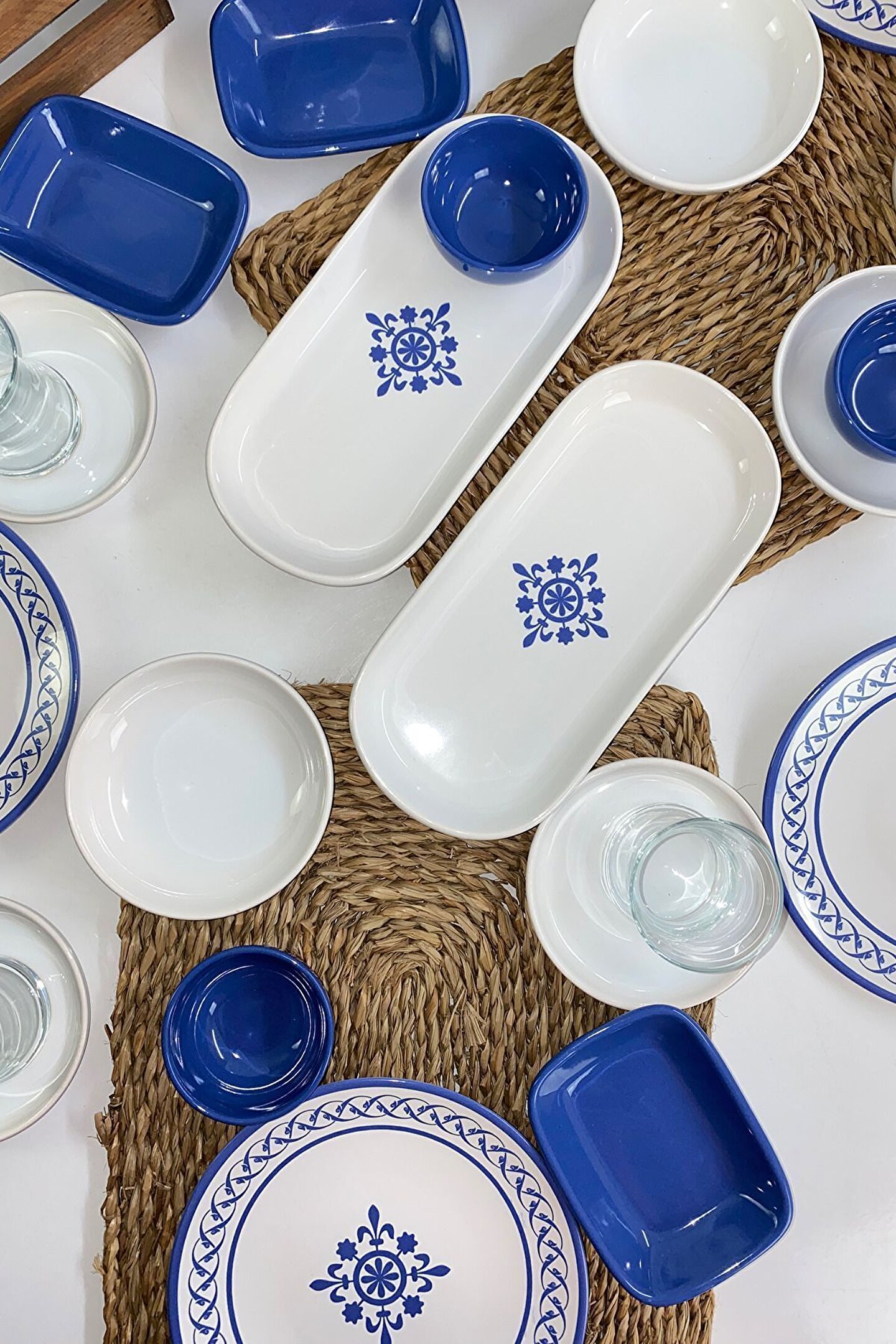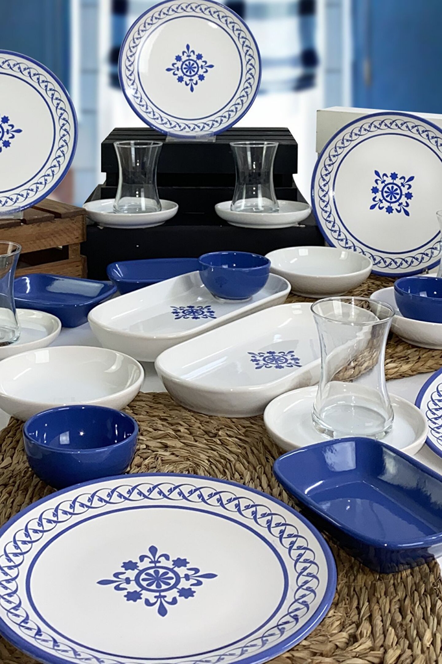 6 adet 20cm desenli kahvaltı tabağı ; 6 adet beyaz çay tabağı ; 6 adet cam çay bardağı; 3 adet 13cm beyaz yuvarlak kahvaltılık ; 3 adet 8cm mavi yuvarlak kahvaltılık ; 3 adet 13cm mavi dikdörtgen kahvaltılık ; 2 adet 26cm desenli kayık tabak ; Ürün kullanımı: Renkleri ve baskısı solmaz. Kolay temizlenir, mikrop barındırmaz. ; Bulaşık makinesi normal ayarında yıkanabilir. ; Tamamen sağlıklı ve ekolojik malzeme yapısına sahiptir. ; Türkiye’de üretilmiştir. ; Almış olduğunuz bu üründe kırık ürün değişim garantisi bulunmaktadır. Koli içerisinde bilgilendirme broşürü yer almaktadır. ; Taşıma esnasında kırılma riskine karşı güvenli paketleme yapılarak gönderimi sağlanmaktadır. ;