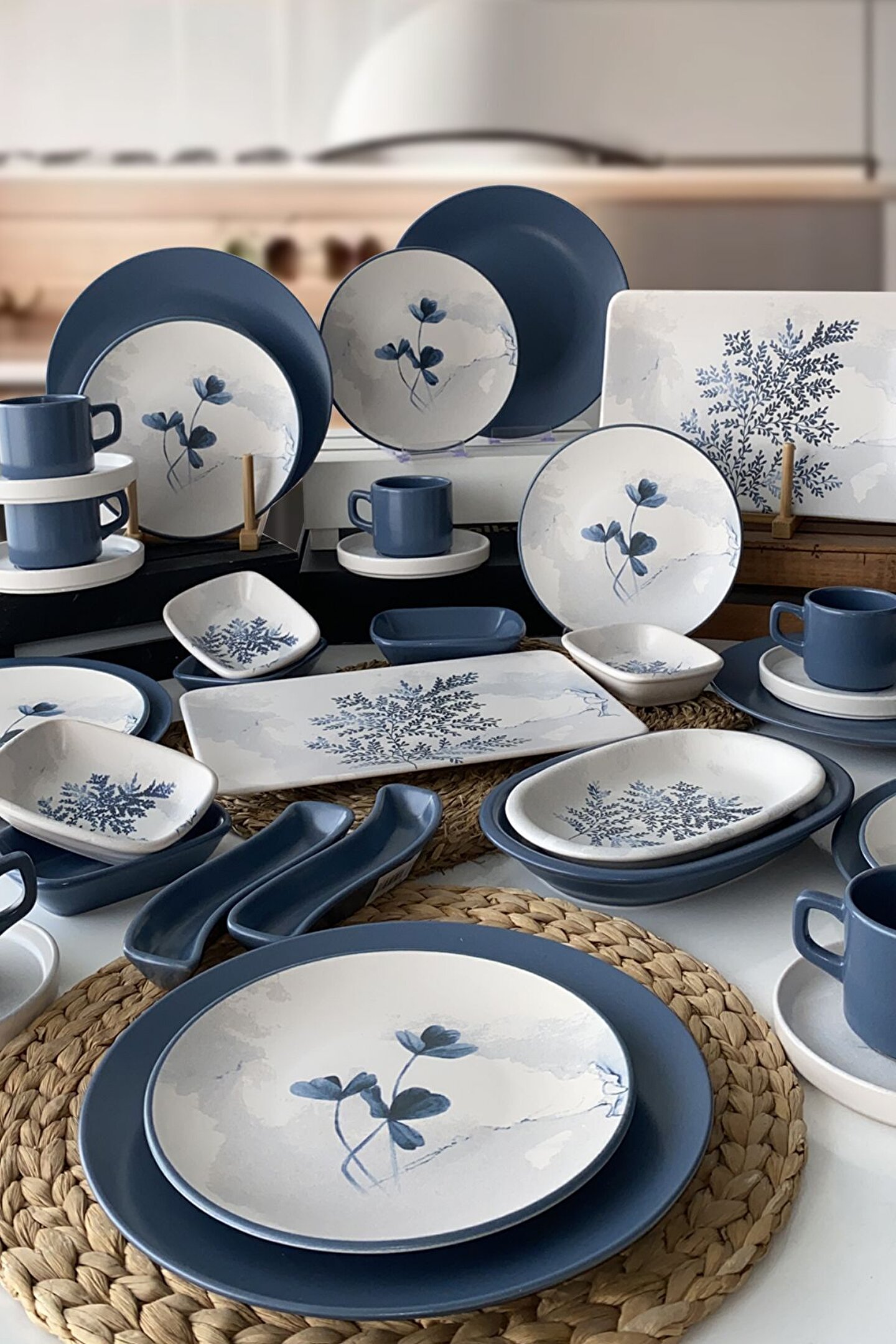 6 adet 26cm mat mavi servis tabağı ; 6 adet 20cm desenli kahvaltı tabağı ; 6 adet mat mavi çay fincanı ; 6 adet desenli çay tabağı ; 3 adet 13cm mat mavi kahvaltılık ; 3 adet 13cm desenli kahvaltılık ; 2 adet mat mavi ivory zeytinlik ; 2 adet 31*21cm desenli kayık ; 1 adet 22cm desenli kayık ; 1 adet 25cm mat mavi kayık ; Ürün kullanımı: Renkleri ve baskısı solmaz. Kolay temizlenir, mikrop barındırmaz. ; Bulaşık makinesi normal ayarında yıkanabilir. ; Tamamen sağlıklı ve ekolojik malzeme yapısına sahiptir. ; Türkiye’de üretilmiştir. ; Almış olduğunuz bu üründe kırık ürün değişim garantisi bulunmaktadır. Koli içerisinde bilgilendirme broşürü yer almaktadır. ; Taşıma esnasında kırılma riskine karşı güvenli paketleme yapılarak gönderimi sağlanmaktadır. ;