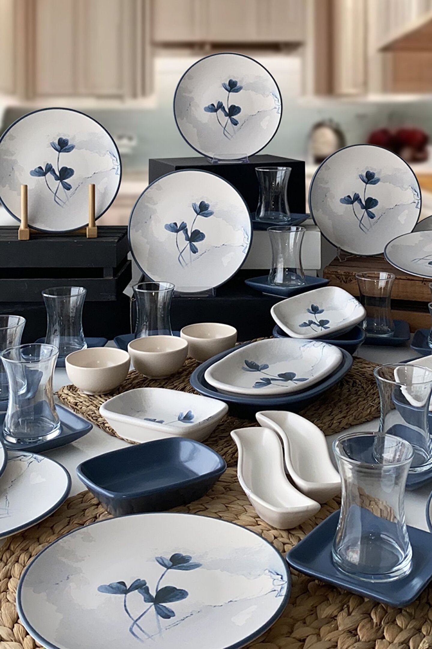 12 adet 20cm desenli kahvaltı tabağı ; 12 adet mat mavi çay tabağı ; 12 adet cam çay bardağı ; 3 adet 13cm desenli dikdörtgen kahvaltılık ; 3 adet 13cm mat mavi dikdörtgen kahvaltılık ; 3 adet 8cm mat beyaz kase ; 2 adet mat beyaz zeytinlik ; 1 adet 25cm mat mavi kayık ; 1 adet 22cm desenli kayık ; Ürün kullanımı: Renkleri ve baskısı solmaz. Kolay temizlenir, mikrop barındırmaz. ; Bulaşık makinesi normal ayarında yıkanabilir. ; Tamamen sağlıklı ve ekolojik malzeme yapısına sahiptir. ; Türkiye’de üretilmiştir. ; Almış olduğunuz bu üründe kırık ürün değişim garantisi bulunmaktadır. Koli içerisinde bilgilendirme broşürü yer almaktadır. ; Taşıma esnasında kırılma riskine karşı güvenli paketleme yapılarak gönderimi sağlanmaktadır. ;