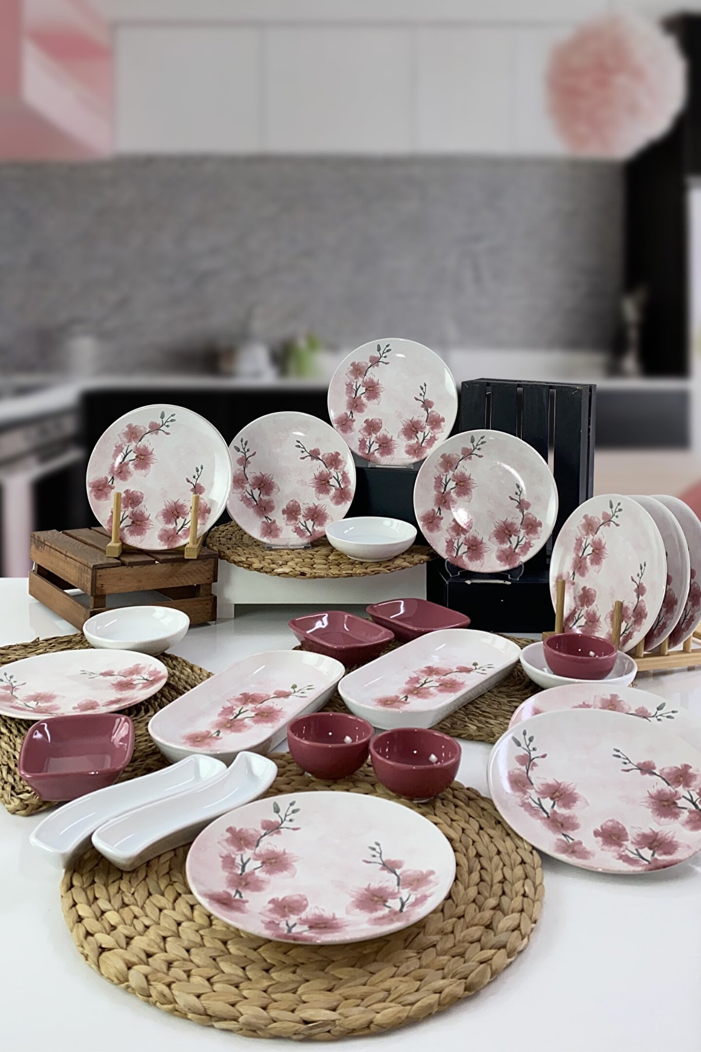12 adet 20cm desenli kahvaltı tabağı ; 3 adet 13cm beyaz yuvarlak kahvaltılık ; 3 adet 8cm frambuaz yuvarlak kahvaltılık ; 3 adet 13cm frambuaz dikdörtgen kahvaltılık ; 2 adet 26cm desenli kayık tabak ; 2 adet beyaz zeytinlik ; Ürün kullanımı: Renkleri ve baskısı solmaz. Kolay temizlenir, mikrop barındırmaz. ; Bulaşık makinesi normal ayarında yıkanabilir. ; Tamamen sağlıklı ve ekolojik malzeme yapısına sahiptir. ; Türkiye’de üretilmiştir. ; Almış olduğunuz bu üründe kırık ürün değişim garantisi bulunmaktadır. Koli içerisinde bilgilendirme broşürü yer almaktadır. ; Taşıma esnasında kırılma riskine karşı güvenli paketleme yapılarak gönderimi sağlanmaktadır ; Koli Ölçüleri : 55x32x18cm ; Koli Ağırlığı : 8KG ;