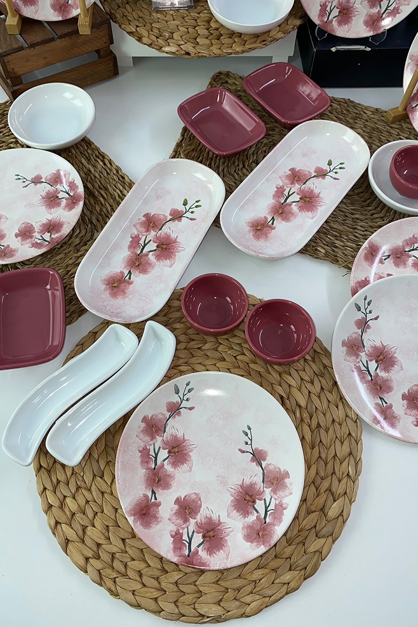 12 adet 20cm desenli kahvaltı tabağı ; 3 adet 13cm beyaz yuvarlak kahvaltılık ; 3 adet 8cm frambuaz yuvarlak kahvaltılık ; 3 adet 13cm frambuaz dikdörtgen kahvaltılık ; 2 adet 26cm desenli kayık tabak ; 2 adet beyaz zeytinlik ; Ürün kullanımı: Renkleri ve baskısı solmaz. Kolay temizlenir, mikrop barındırmaz. ; Bulaşık makinesi normal ayarında yıkanabilir. ; Tamamen sağlıklı ve ekolojik malzeme yapısına sahiptir. ; Türkiye’de üretilmiştir. ; Almış olduğunuz bu üründe kırık ürün değişim garantisi bulunmaktadır. Koli içerisinde bilgilendirme broşürü yer almaktadır. ; Taşıma esnasında kırılma riskine karşı güvenli paketleme yapılarak gönderimi sağlanmaktadır ; Koli Ölçüleri : 55x32x18cm ; Koli Ağırlığı : 8KG ;