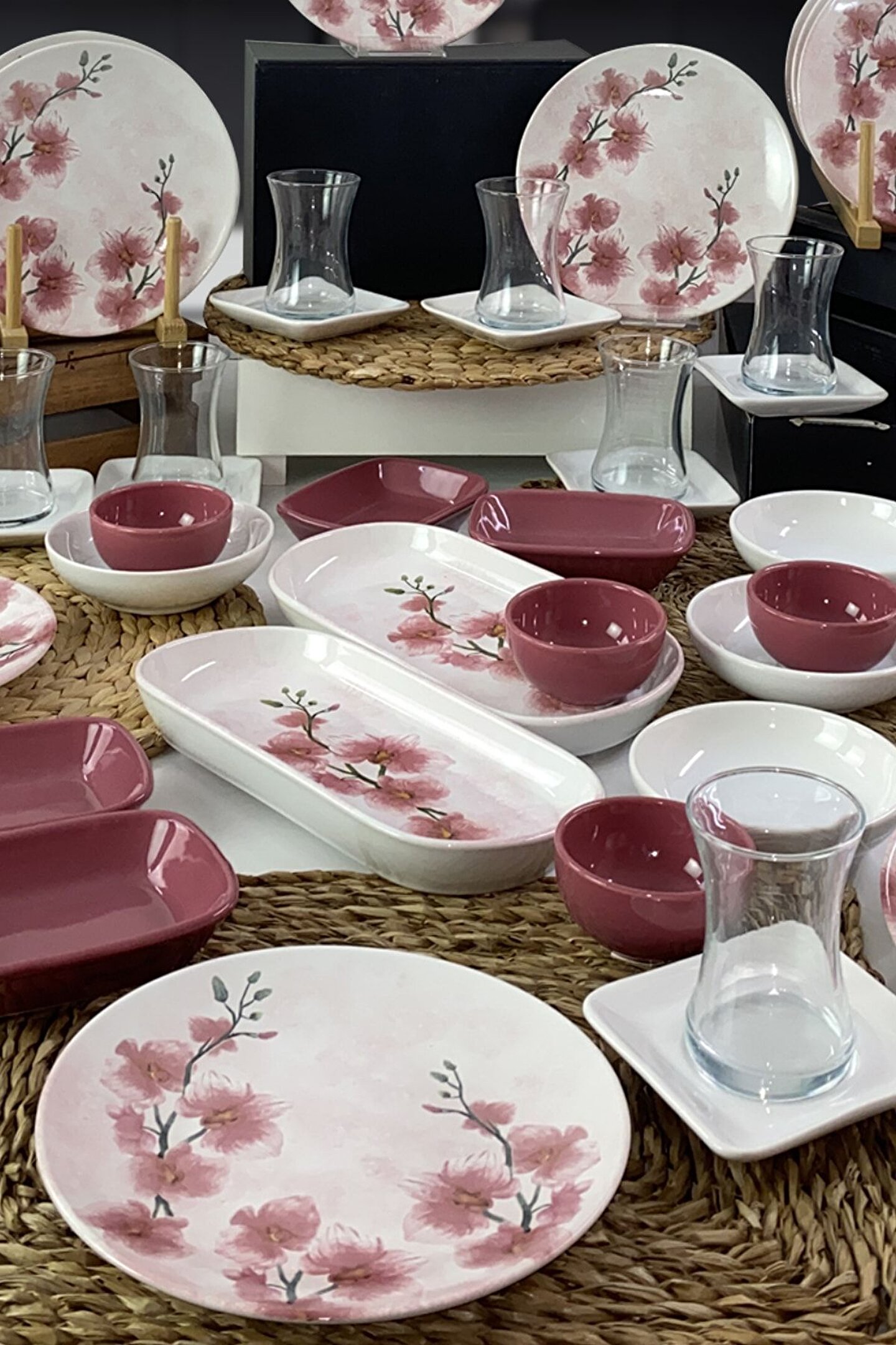 12 adet 20cm desenli kahvaltı tabağı ; 12 adet cam çay bardağı ; 12 adet beyaz çay tabağı ; 4 adet 13cm beyaz yuvarlak kahvaltılık ; 4 adet 8cm frambuaz yuvarlak kahvaltılık ; 4 adet 13cm frambuaz dikdörtgen kahvaltılık ; 2 adet 26cm desenli kayık tabak ; Ürün kullanımı: Renkleri ve baskısı solmaz.; Kolay temizlenir, mikrop barındırmaz.; ; Bulaşık makinesi normal ayarında yıkanabilir.; ; Tamamen sağlıklı ve ekolojik malzeme yapısına sahiptir.; ; Türkiye’de üretilmiştir.; ; Almış olduğunuz bu üründe kırık ürün değişim garantisi bulunmaktadır.; Koli içerisinde bilgilendirme broşürü yer almaktadır.; ; Taşıma esnasında kırılma riskine karşı güvenli paketleme yapılarak gönderimi sağlanmaktadır.; ; Koli ölçüleri : 36x36x34cm ; Koli Ağırlık: 12KG ;