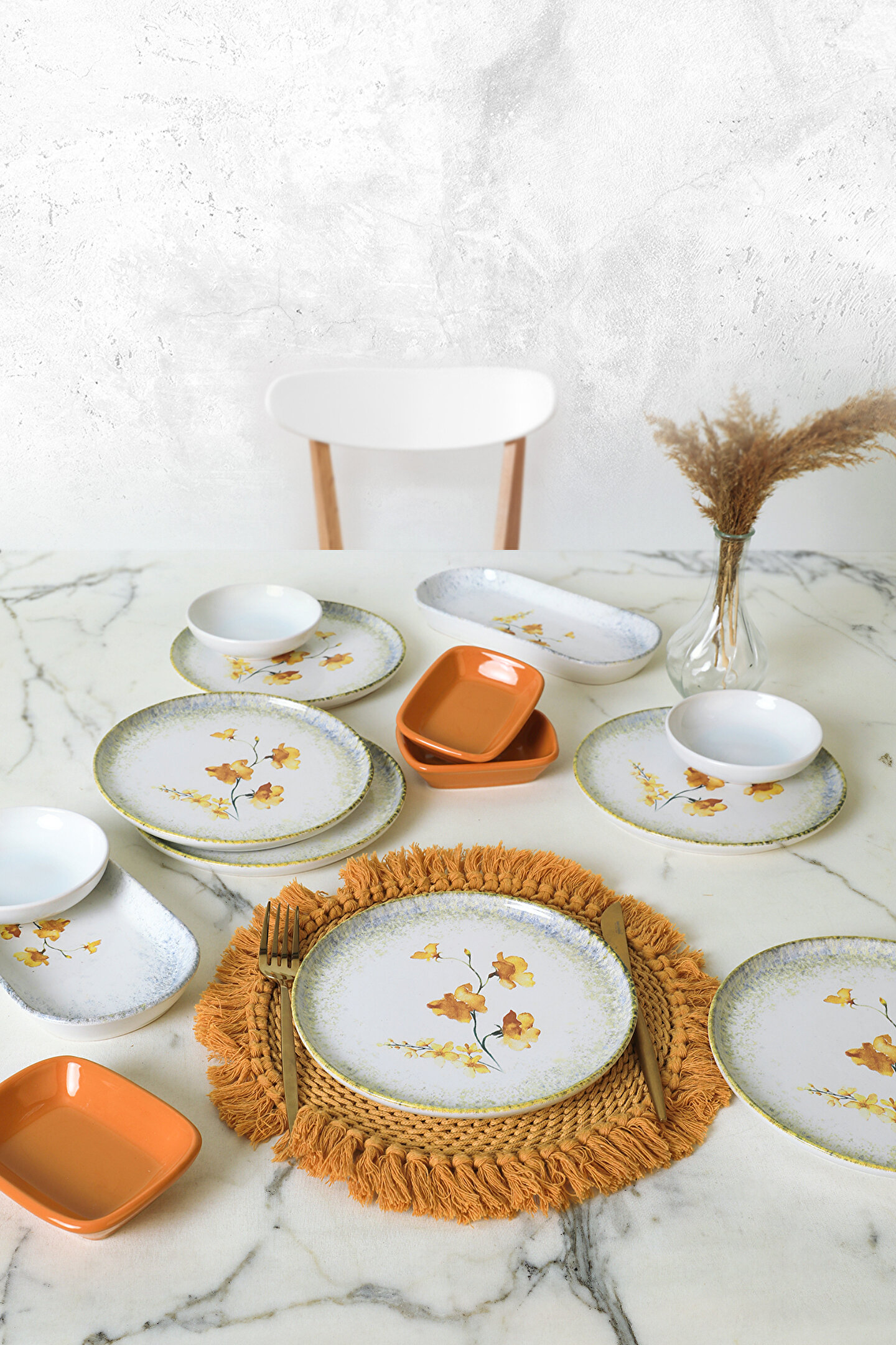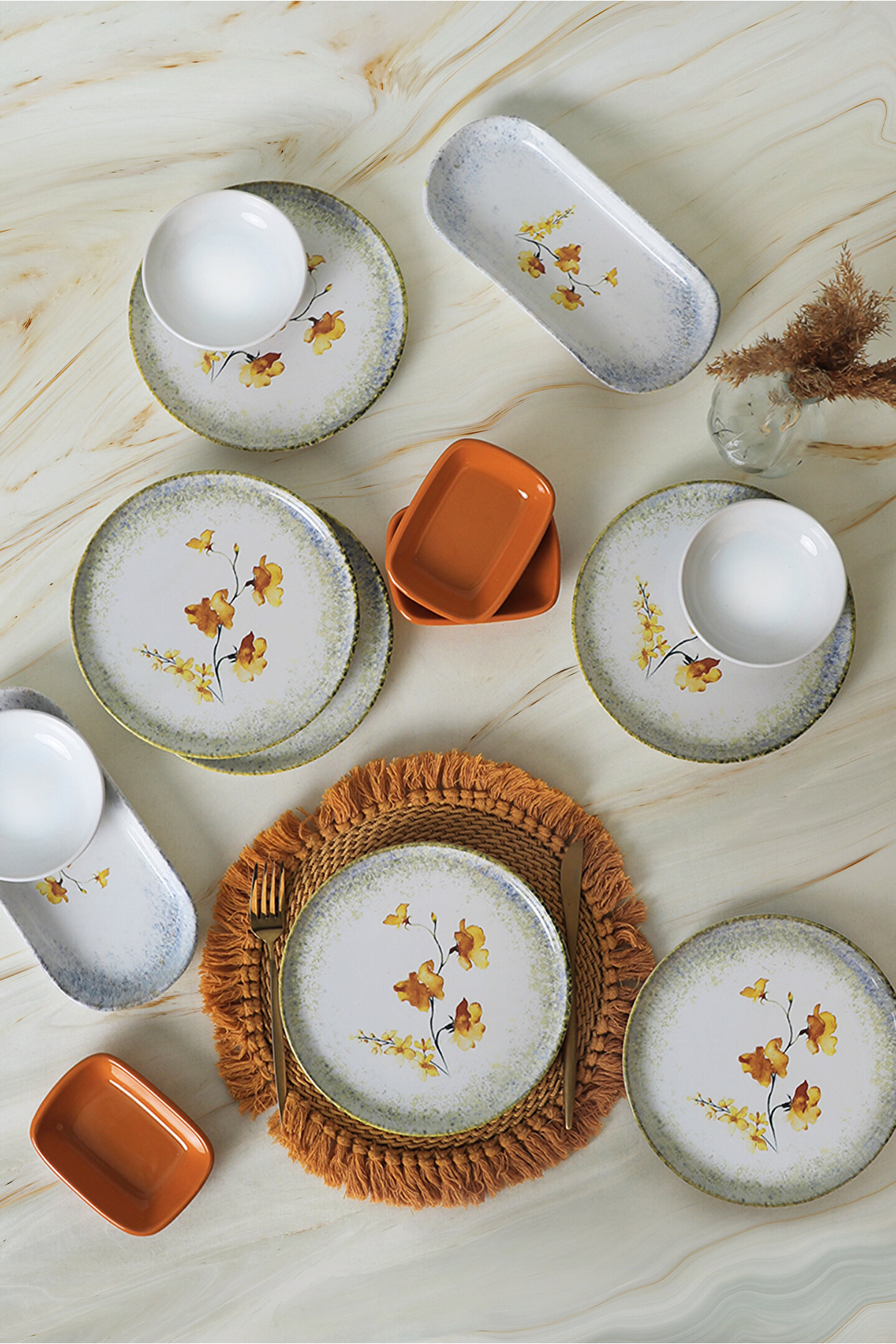 6 adet 22cm desenli tabak ; 3 adet 13cm beyaz kase ; 3 adet 13cm sarı dikdörtgen ; 2 adet 26cm kayık ; Ürün kullanımı: Renkleri ve baskısı solmaz. ; Kolay temizlenir, mikrop barındırmaz. ; Bulaşık makinesi normal ayarında yıkanabilir. ; Tamamen sağlıklı ve ekolojik malzeme yapısına sahiptir. ; Türkiye’de üretilmiştir. ; Almış olduğunuz bu üründe kırık ürün değişim garantisi bulunmaktadır. Koli içerisinde bilgilendirme broşürü yer almaktadır. ; Taşıma esnasında kırılma riskine karşı güvenli paketleme yapılarak gönderimi sağlanmaktadır. ; Koli Ölçüleri : 36x36x22 CM ; Koli Ağırlığı : 6 KG ;