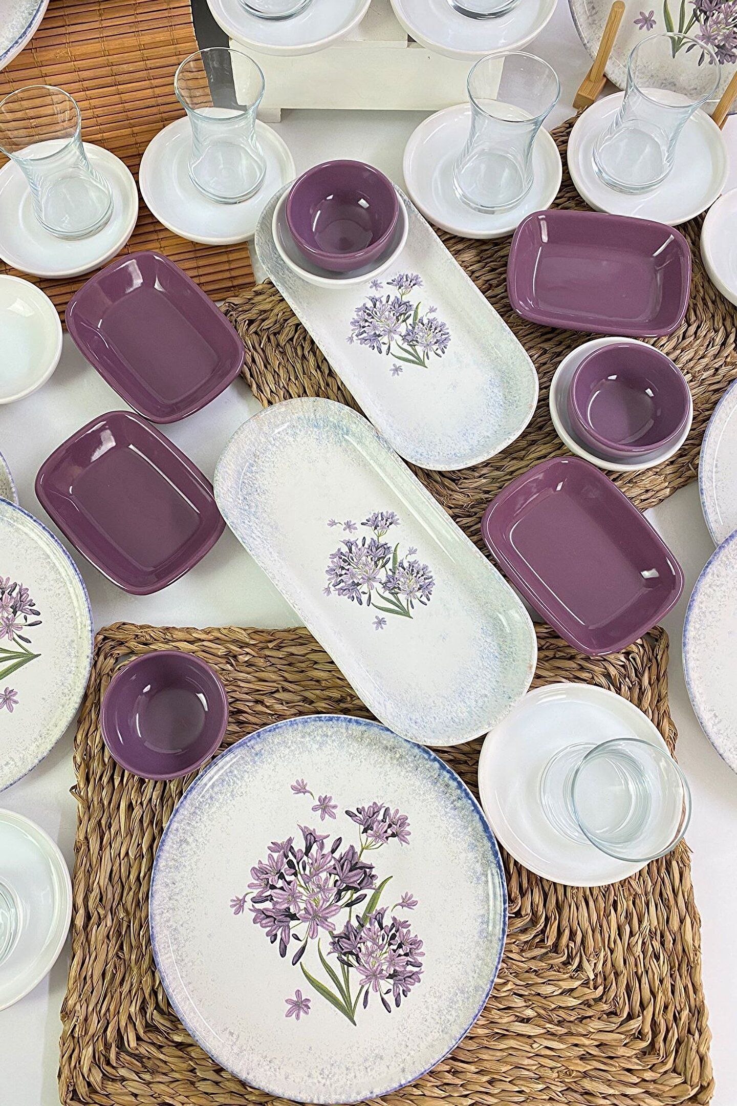 12 adet 22cm desenli tabak ; 12 adet cam çay bardağı ; 12 adet beyaz çay tabağı ; 4 adet 10cm beyaz kase ; 4 adet 8cm mor kase ; 4 adet 13cm mor dikdörtgen ; 2 adet 26cm desenli kayık ; Ürün kullanımı: Renkleri ve baskısı solmaz. ; Kolay temizlenir, mikrop barındırmaz. ; Bulaşık makinesi normal ayarında yıkanabilir. ; Tamamen sağlıklı ve ekolojik malzeme yapısına sahiptir. ; Türkiye’de üretilmiştir. ; Almış olduğunuz bu üründe kırık ürün değişim garantisi bulunmaktadır. Koli içerisinde bilgilendirme broşürü yer almaktadır. ; Taşıma esnasında kırılma riskine karşı güvenli paketleme yapılarak gönderimi sağlanmaktadır. ; Koli Ölçüleri : 36x36x34cm ; Koli Ağırlığı : 14KG ;