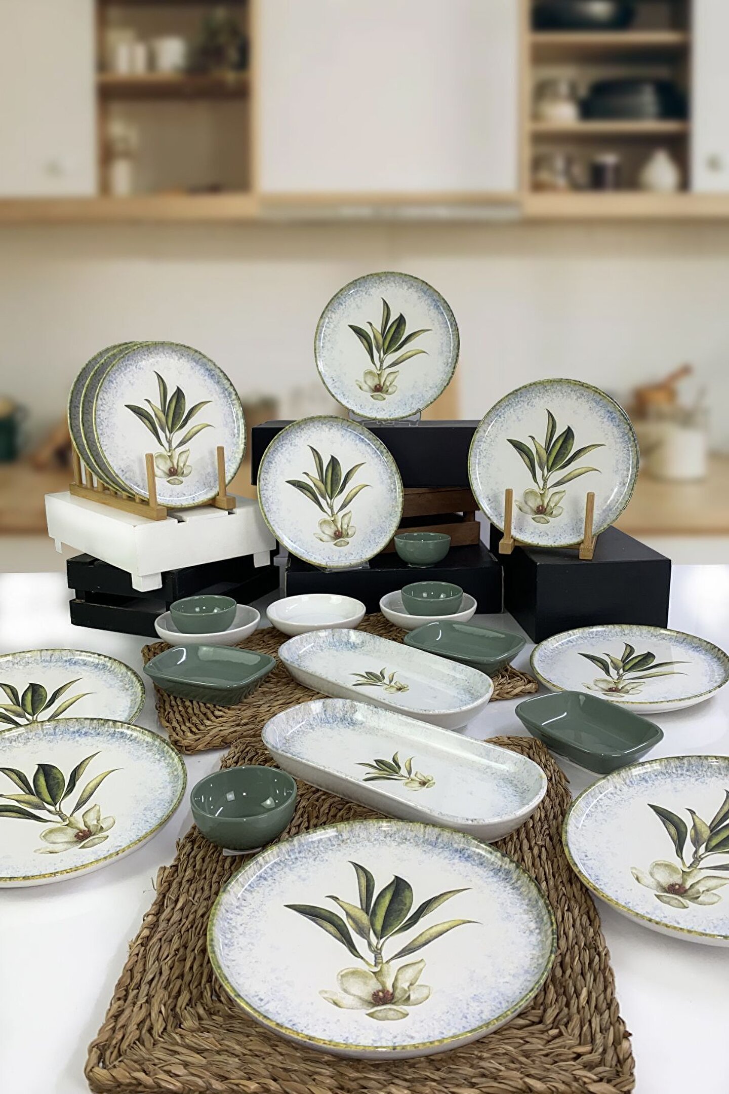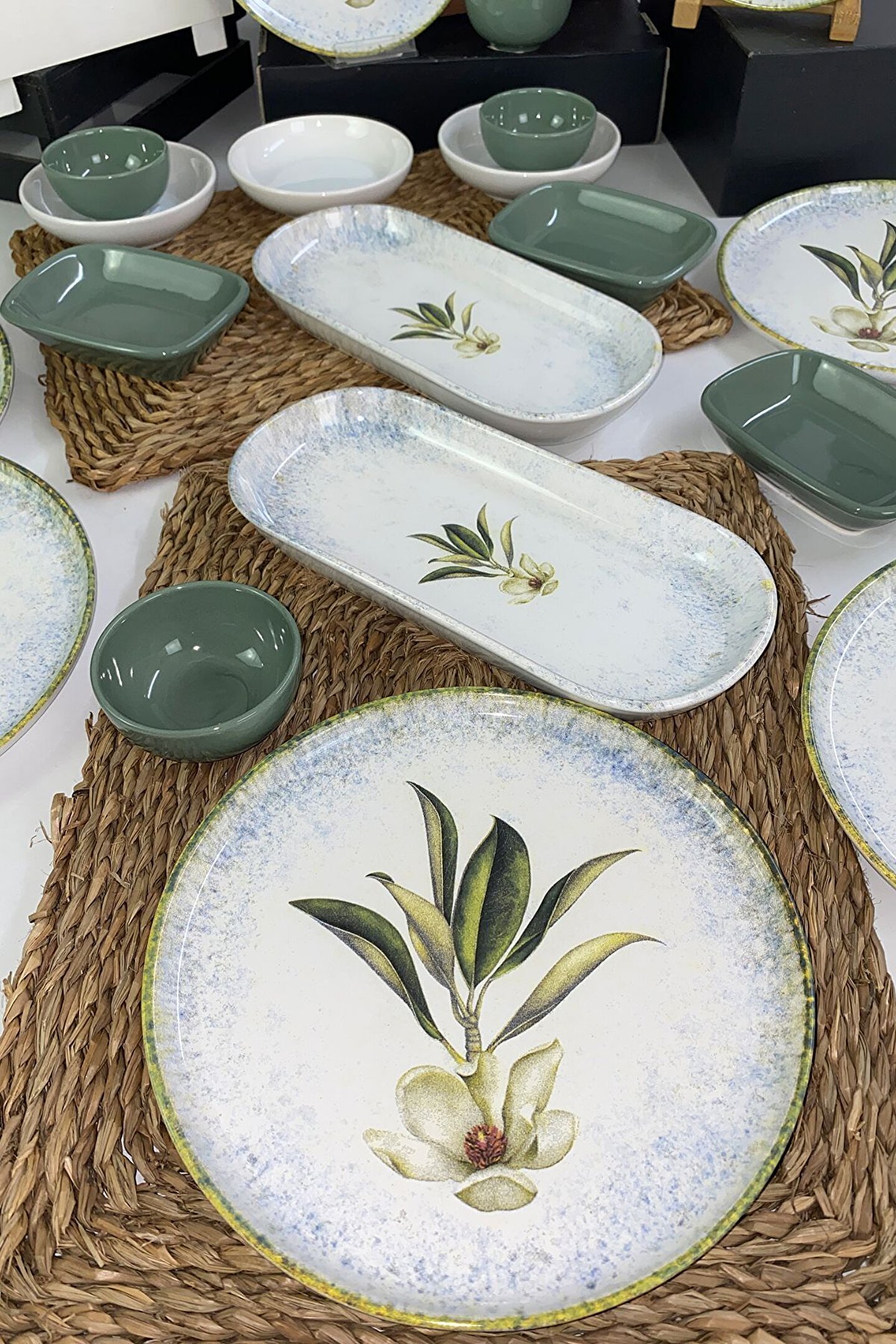 12 adet 22cm desenli tabak ; 4 adet 8cm yeşil kase ; 3 adet 13cm beyaz kase ; 3 adet 13cm yeşil dikdörtgen ; 2 adet 26cm desenli kayık ; Ürün kullanımı: Renkleri ve baskısı solmaz. ; Kolay temizlenir, mikrop barındırmaz. ; Bulaşık makinesi normal ayarında yıkanabilir. ; Tamamen sağlıklı ve ekolojik malzeme yapısına sahiptir. ; Türkiye’de üretilmiştir. ; Almış olduğunuz bu üründe kırık ürün değişim garantisi bulunmaktadır. Koli içerisinde bilgilendirme broşürü yer almaktadır. ; Taşıma esnasında kırılma riskine karşı güvenli paketleme yapılarak gönderimi sağlanmaktadır. ;