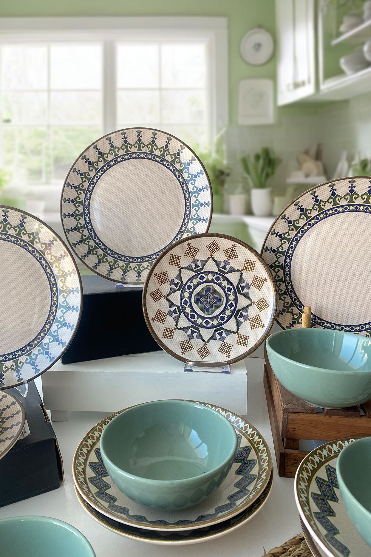 6 adet 26cm desenli servis tabağı ; 6 adet 20cm desenli pasta tabağı ; 6 adet 22cm desenli yemek tabağı ; 6 adet 14cm yeşil çorba kasesi ; Yüzey yapısı : Parlak ; Ürün kullanımı: Renkleri ve baskısı solmaz. Kolay temizlenir, mikrop barındırmaz. ; Bulaşık makinesi normal ayarında yıkanabilir. ; Tamamen sağlıklı ve ekolojik malzeme yapısına sahiptir. ; Türkiye’de üretilmiştir. ; Almış olduğunuz bu üründe kırık ürün değişim garantisi bulunmaktadır. Koli içerisinde bilgilendirme broşürü yer almaktadır. ; Taşıma esnasında kırılma riskine karşı güvenli paketleme yapılarak gönderimi sağlanmaktadır. ;