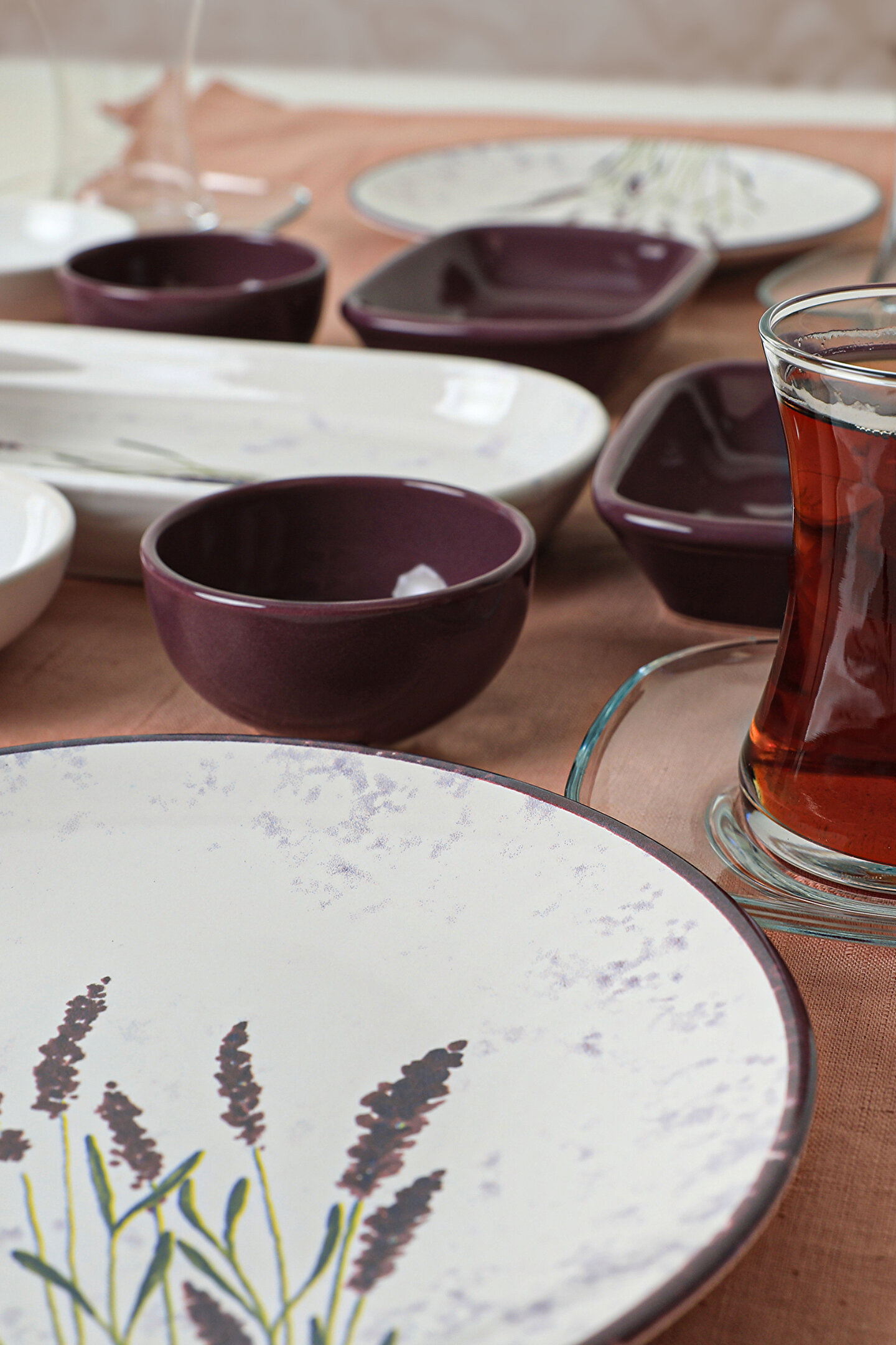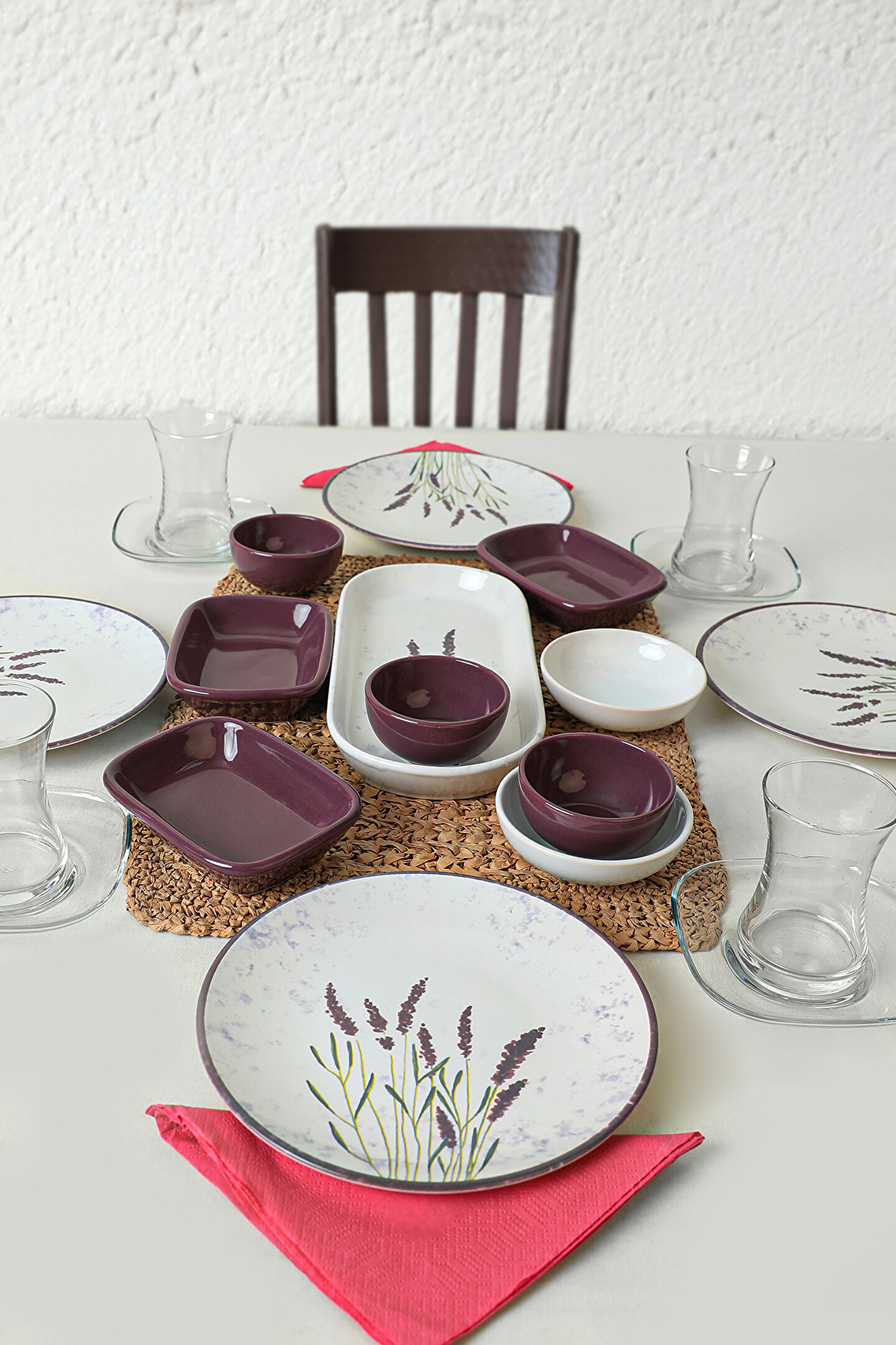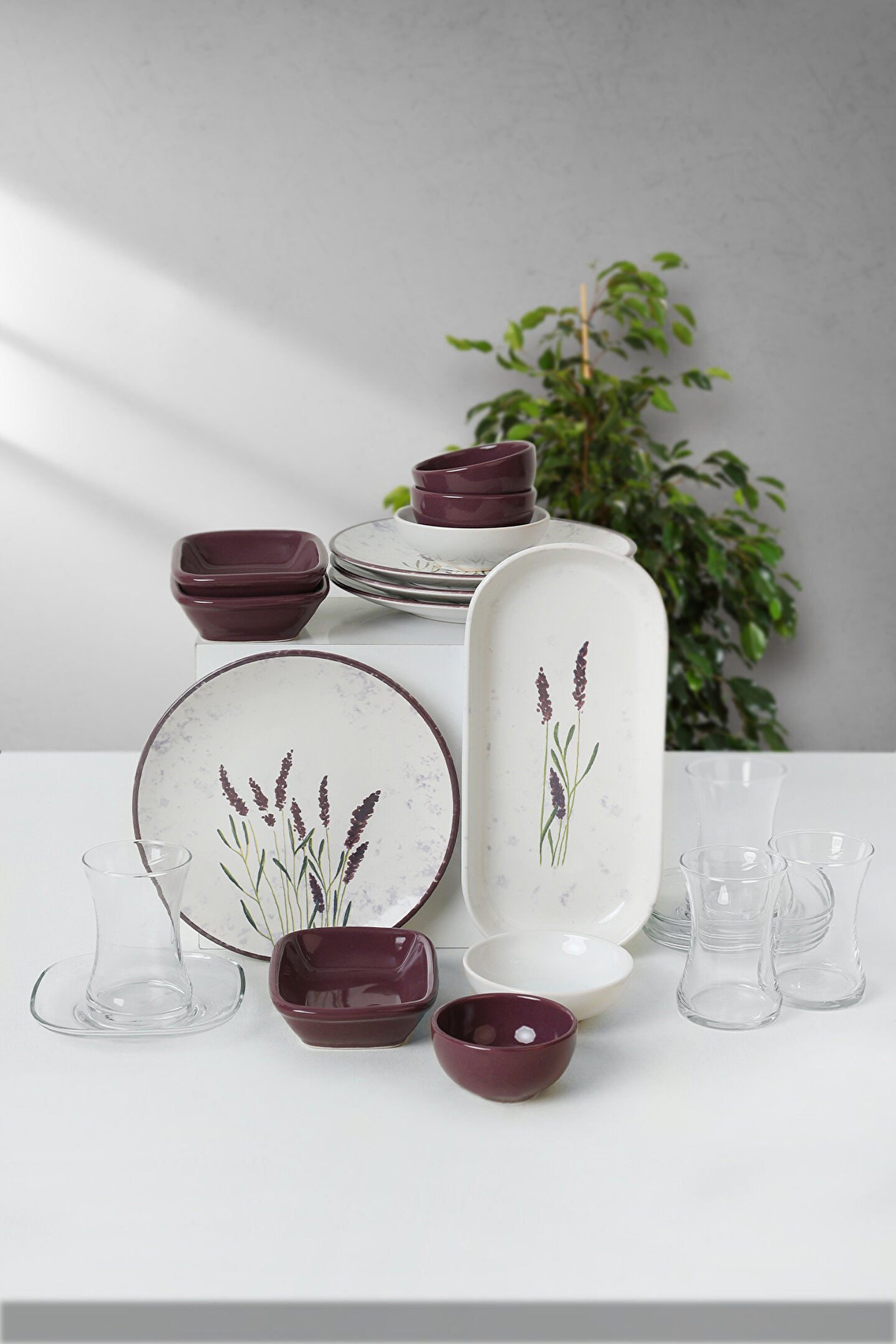 4 adet 20cm desenli tabak ; 4 adet cam çay bardağı ; 4 adet cam çay tabağı; 2 adet 10cm beyaz kase ; 3 adet 13cm mor dikdörtgen ; 3 adet 8cm mor kase ; 1 adet 26cm kayık ; Ürün kullanımı: Renkleri ve baskısı solmaz. ; Kolay temizlenir, mikrop barındırmaz. ; Bulaşık makinesi normal ayarında yıkanabilir. ; Tamamen sağlıklı ve ekolojik malzeme yapısına sahiptir. ; Türkiye’de üretilmiştir. ; Almış olduğunuz bu üründe kırık ürün değişim garantisi bulunmaktadır. Koli içerisinde bilgilendirme broşürü yer almaktadır. ; Taşıma esnasında kırılma riskine karşı güvenli paketleme yapılarak gönderimi sağlanmaktadır. ;