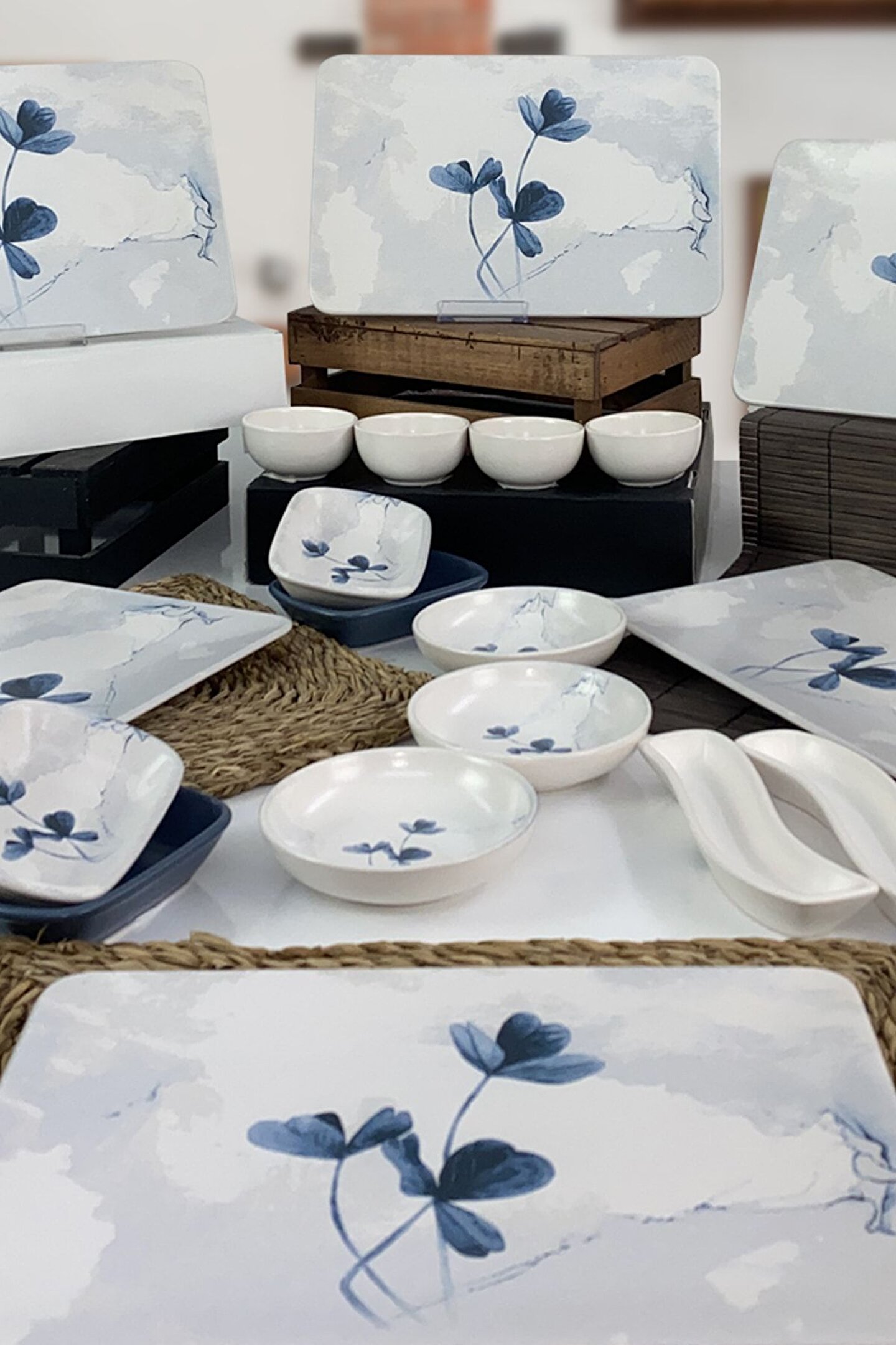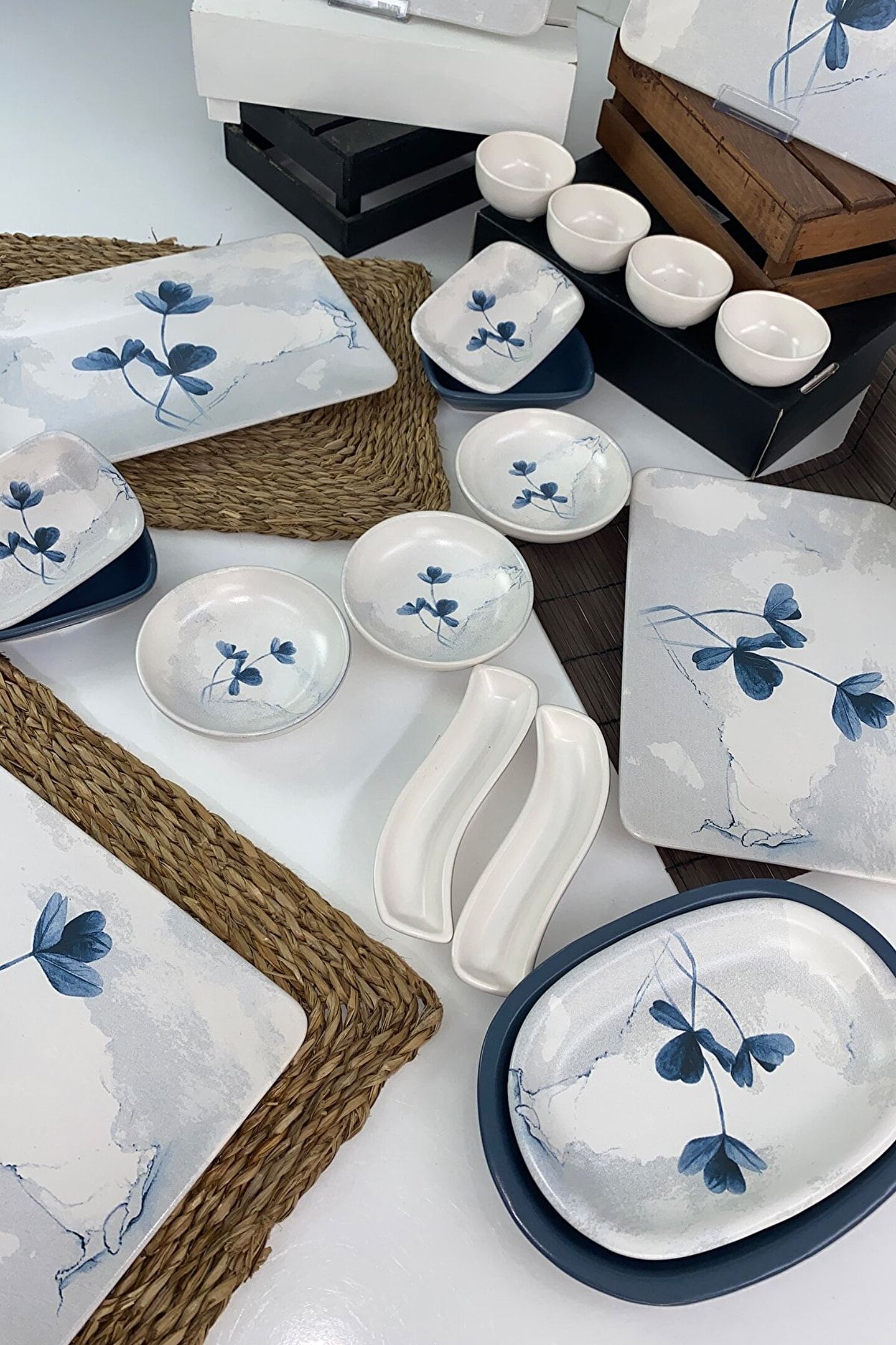 6 adet 31*21cm servis tabağı ; 4 adet 8cm mat beyaz kase ; 3 adet 13cm desenli halka ; 2 adet 13cm mat mavi dikdörtgen ; 2 adet 13cm desenli dikdörtgen ; 2 adet mat beyaz zeytinlik ; 1 adet 22cm desenli kayık ; 1 adet 25cm mat mavi kayık ;