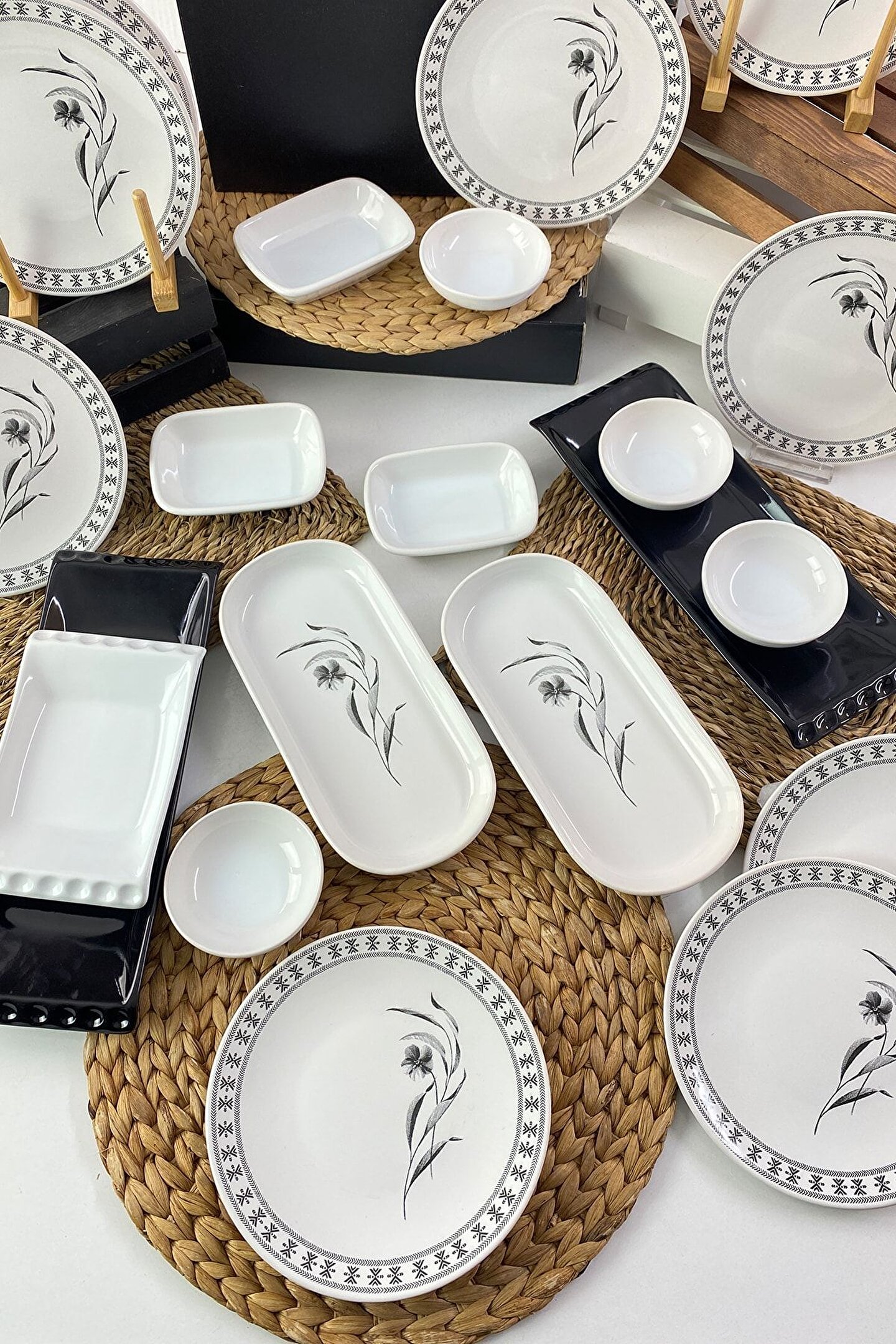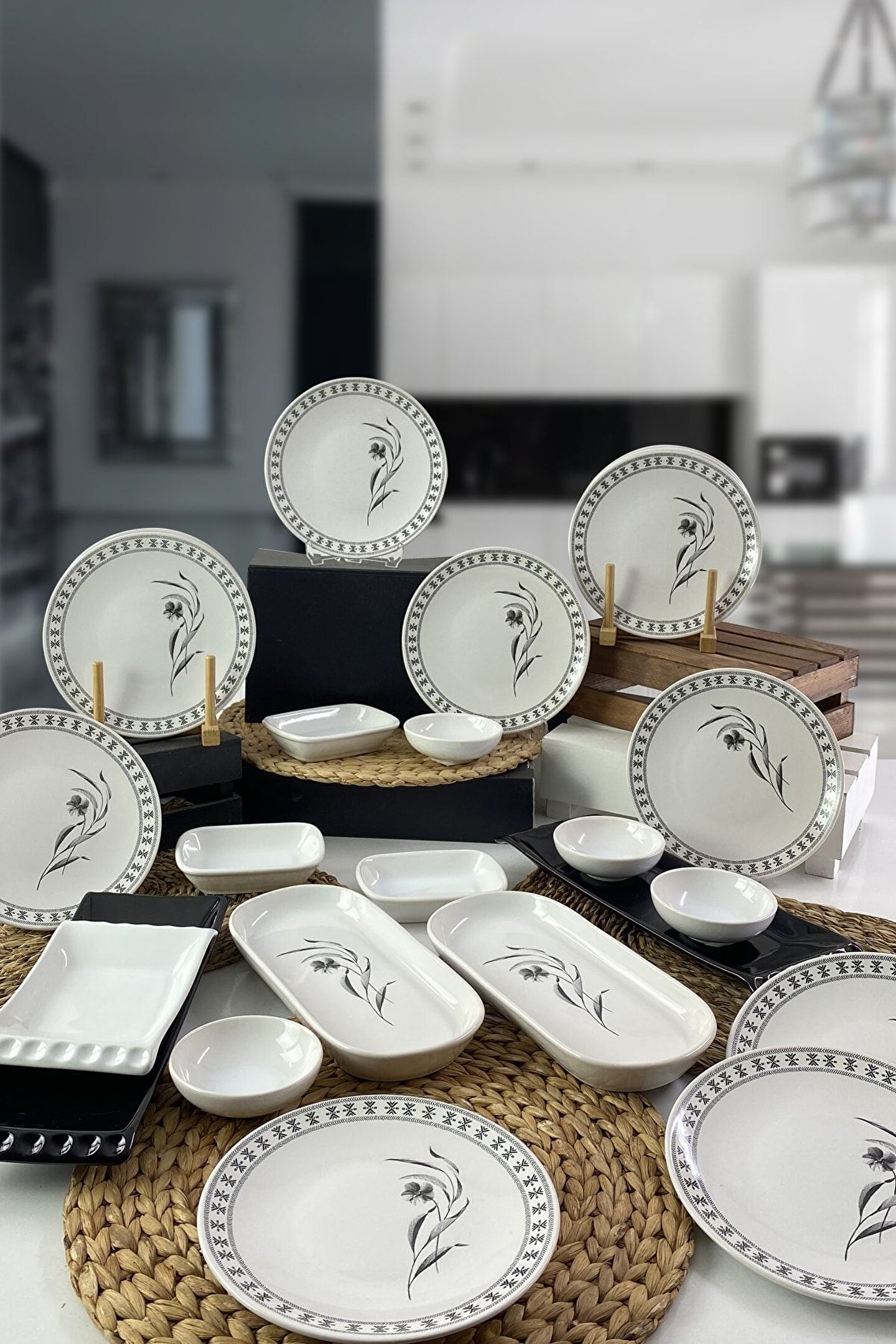 12 adet 20cm desenli kahvaltı tabağı ; 4 adet 13cm beyaz yuvarlak kahvaltılık ; 3 adet 13cm beyaz dikdörtgen kahvaltılık ; 2 adet 26cm desenli kayık tabak ; 2 adet 33cm siyah kayık tabak ; 1 adet 18cm beyaz kayık tabak; Ürün kullanımı: Renkleri ve baskısı solmaz. Kolay temizlenir, mikrop barındırmaz. ; Bulaşık makinesi normal ayarında yıkanabilir. ; Tamamen sağlıklı ve ekolojik malzeme yapısına sahiptir. ; Türkiye’de üretilmiştir. ; Almış olduğunuz bu üründe kırık ürün değişim garantisi bulunmaktadır. Koli içerisinde bilgilendirme broşürü yer almaktadır. ; Taşıma esnasında kırılma riskine karşı güvenli paketleme yapılarak gönderimi sağlanmaktadır. ;