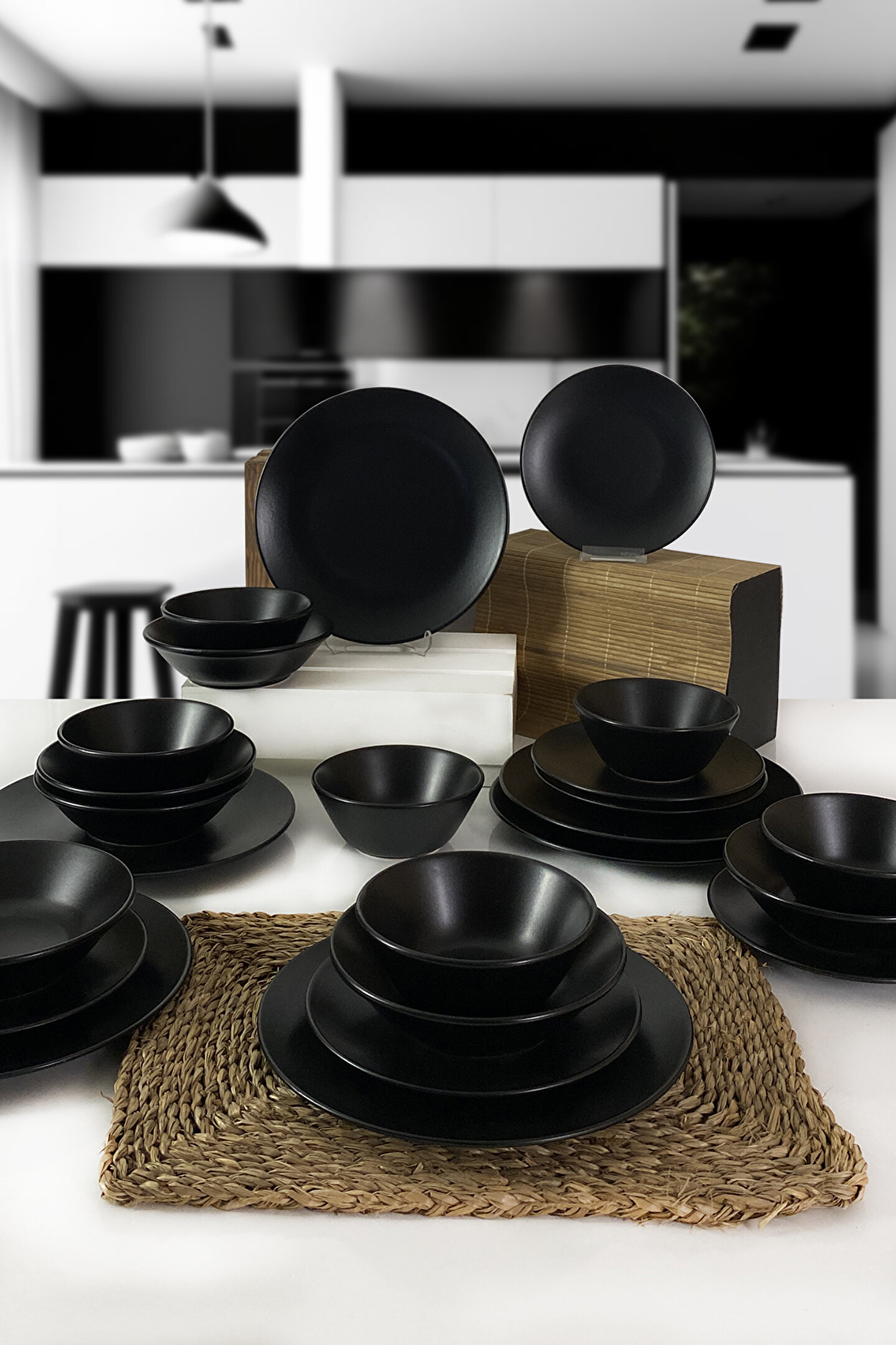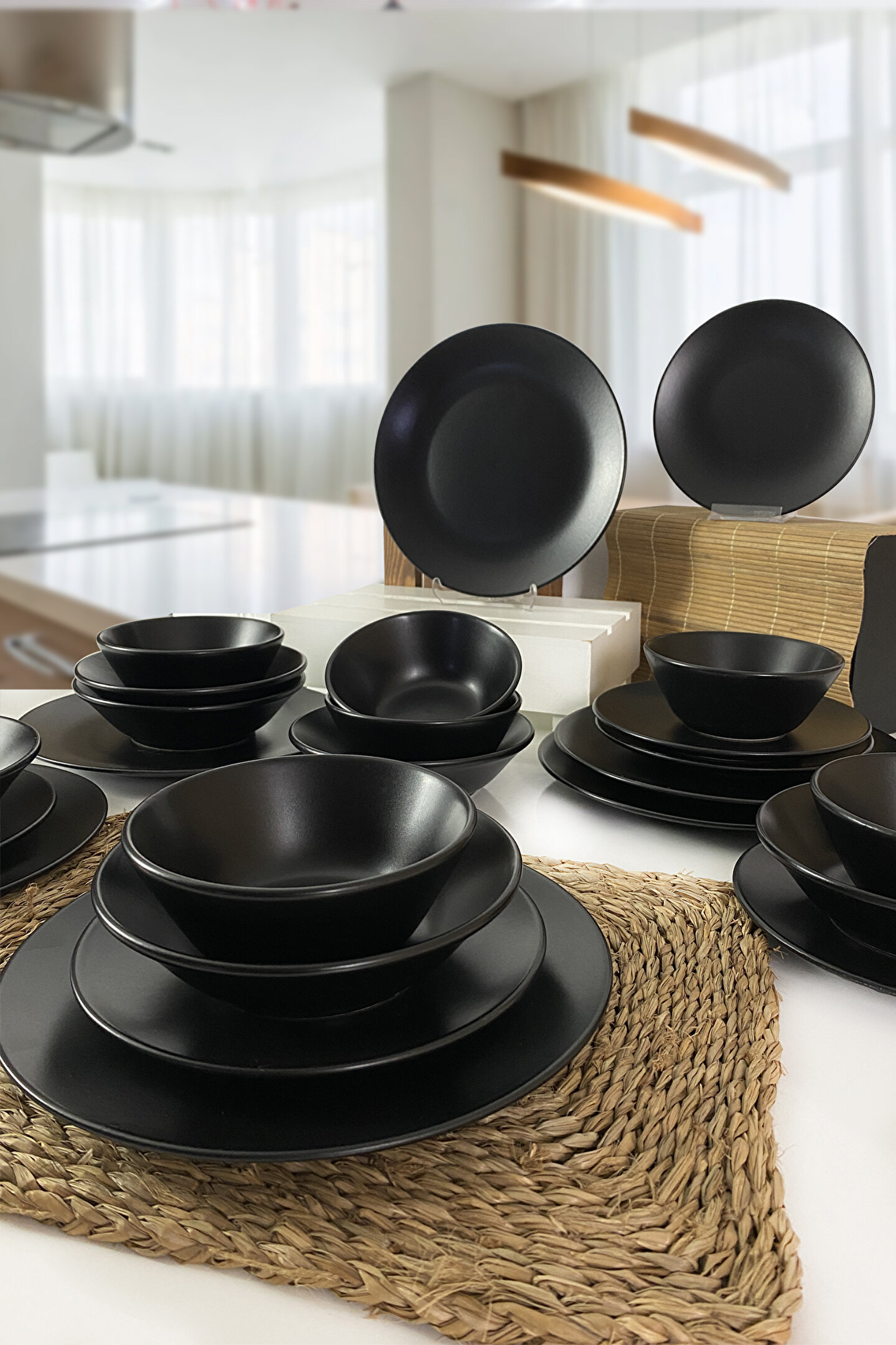 6 adet 26 cm siyah mat servis tabağı. ; 6 adet 20cm siyah mat pasta tabağı.; 6 adet 18cm siyah mat yemek tabağı.; 6 adet 14cm siyah mat çorba kasesi.; Ürün kullanımı: Renkleri ve baskısı solmaz. ; Kolay temizlenir, mikrop barındırmaz. ; Bulaşık makinesi normal ayarında yıkanabilir. ; Tamamen sağlıklı ve ekolojik malzeme yapısına sahiptir. ; Türkiye’de üretilmiştir. ; Almış olduğunuz bu üründe kırık ürün değişim garantisi bulunmaktadır. Koli içerisinde bilgilendirme broşürü yer almaktadır. ; Taşıma esnasında kırılma riskine karşı güvenli paketleme yapılarak gönderimi sağlanmaktadır. ;