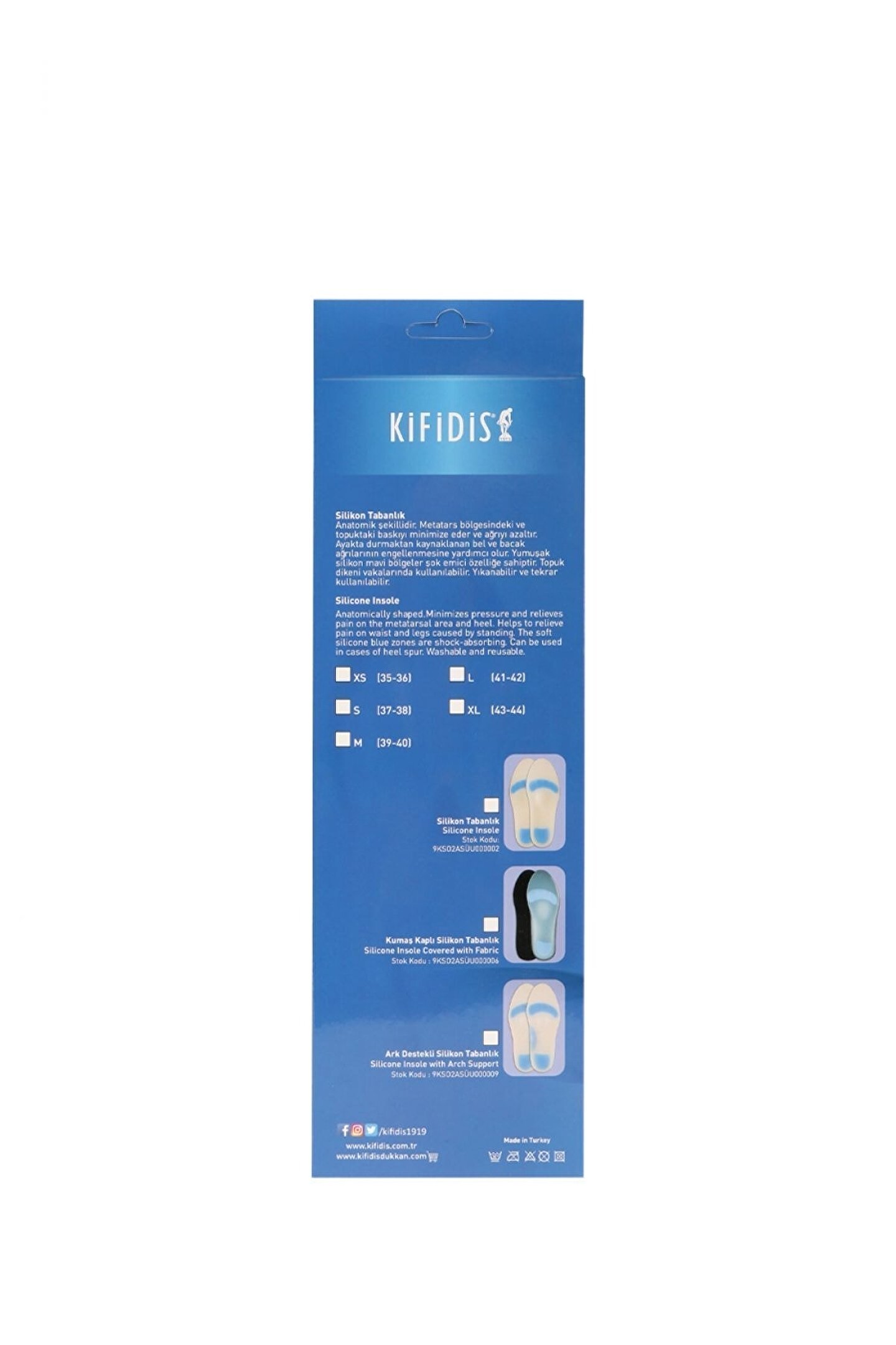 Beden: XS:35-36 S:37-38 M:39-40 L: 41-42 XL:43-44 %100 silikon malzemeden üretilmiştir. ; Maksimum elastik bir yapıda ortopedik ve hipoallerjeniktir. ; Ayak tabanına anatomik destek vererek tabandaki basıncın dengeli bir şekilde dağılmasını sağlar. ; Rahatlatıcı ve dinlendirici özelliğe sahiptir. ; Ark desteği tedavisinde kullanılabilir. ; Yıkanabilir ve yeniden kullanılabilir. ; Made of 100% medical silicone. ; It is hypoallergenic, orthopedic and has maximum elasticity. ; Enables even distribution of pressure on the sole by providing anatomical support. ; Has relaxing and comforting effect by reducing shock loads especially in forefoot and heel. ; Different from other insoles of having an assit on arc area with soft blue silicone. ; Washable and reusable.;