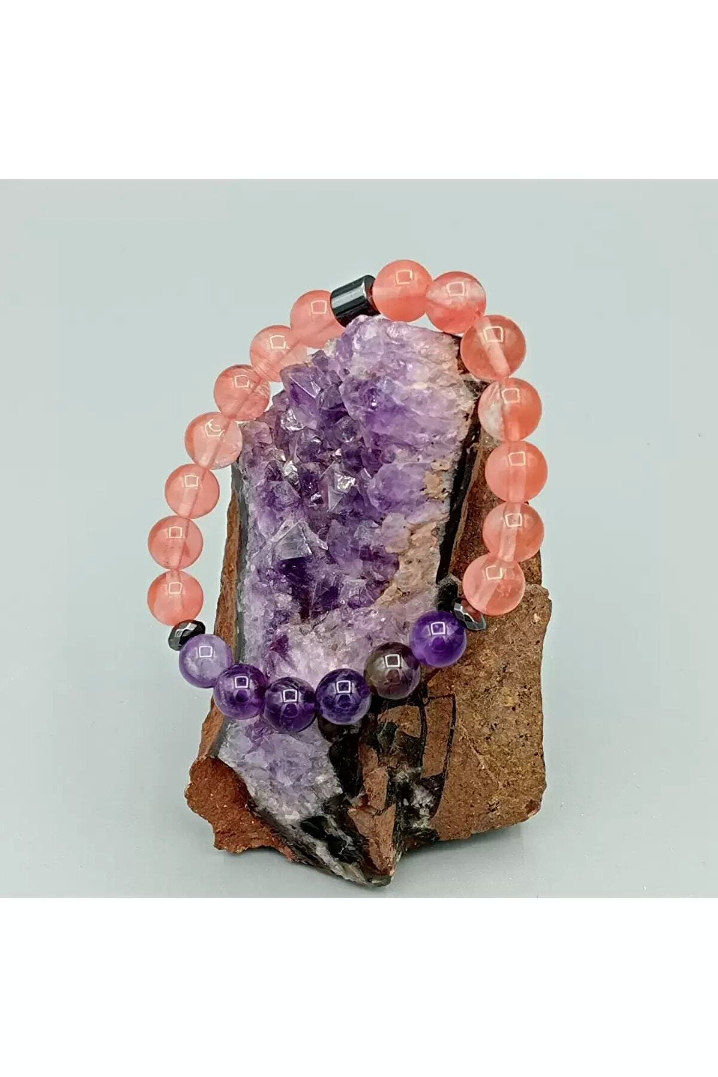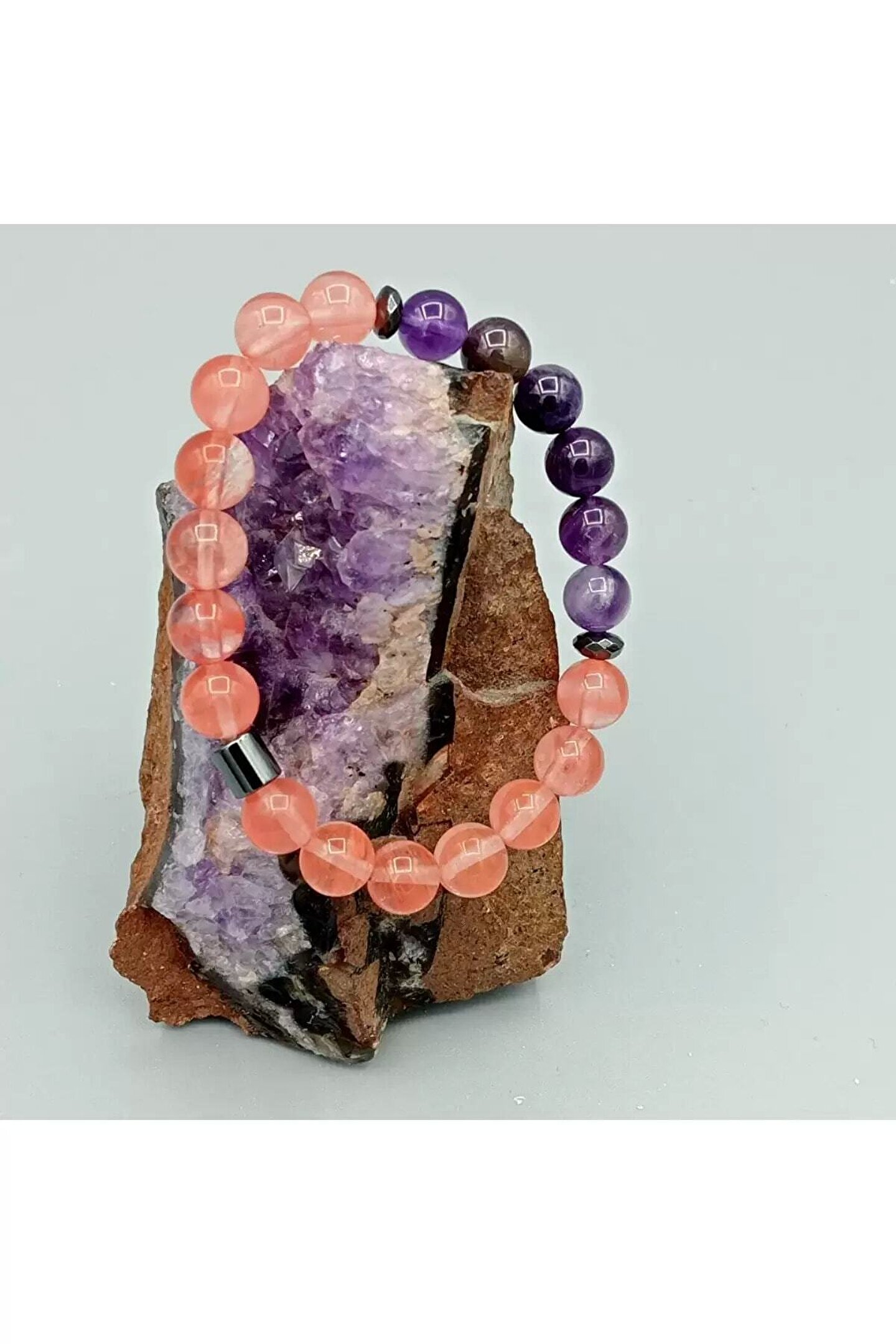 Doğal taş kullanımı sayesinde her bileklik benzersiz ve otantik bir görünüm sunar; Çilek kuvars ametist hematit bileklik, hem şıklığı hem de doğallığı bir arada barındırır; 8mm boyutundaki bu bileklik, zarif tasarımı ile dikkat çeker ve her türlü kıyafetle uyum sağlar; Doğal taş materyaliyle hem estetik hem de sağlığa faydalı bir aksesuar deneyimi sunar;