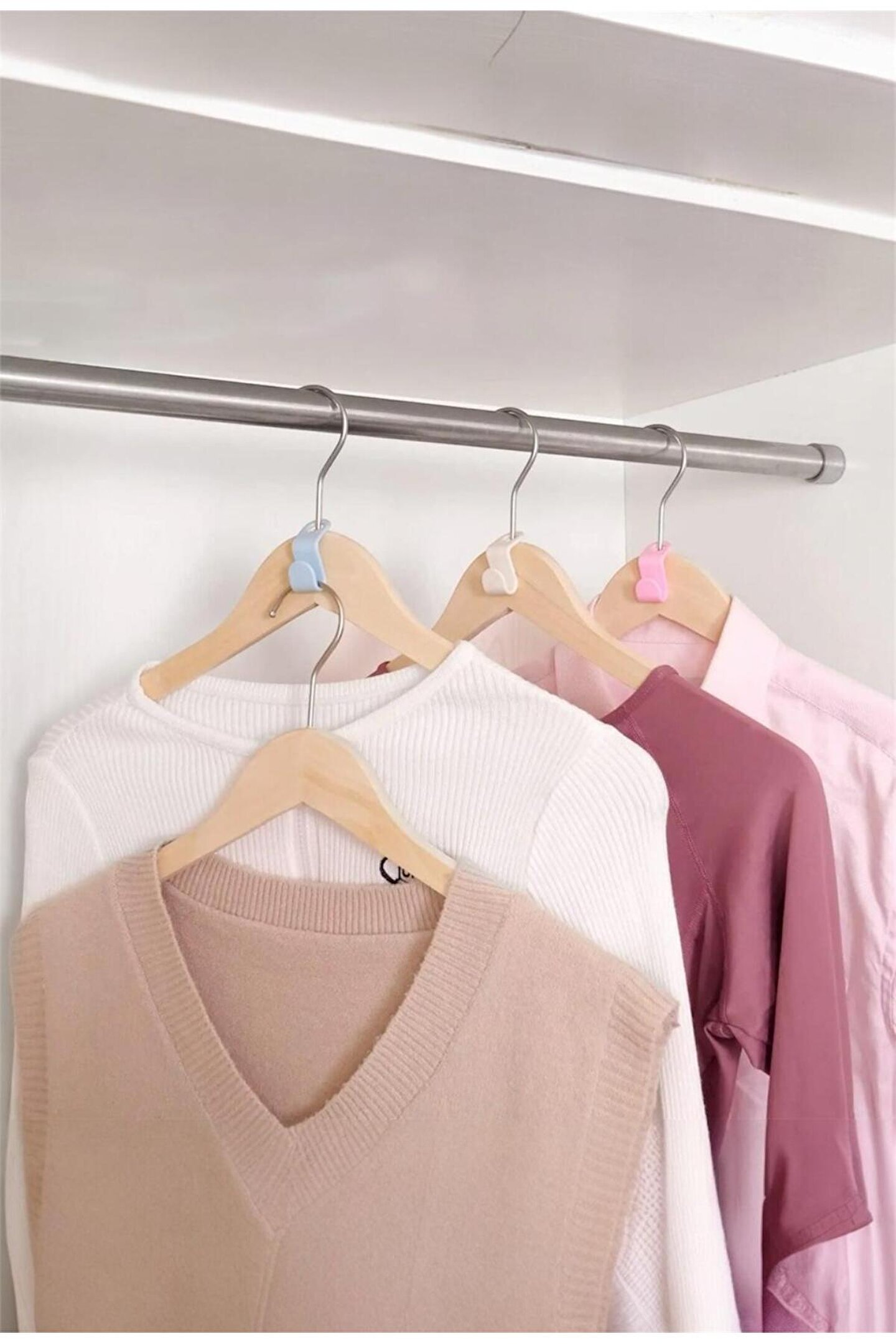 Gardrop Düzeninde Kolaylık:Askı konektörleri, gardırobunuzdaki kıyafetlerin düzenli bir şekilde yerleştirilmesini sağlar. Kıyafetleri düzenlemekle kalmaz, aynı zamanda kemer, çanta, kolye ve diğer aksesuarları asmak için de kullanılabilirler, böylece ihtiyacınız olan kıyafetleri hızlıca bulabilirsiniz.