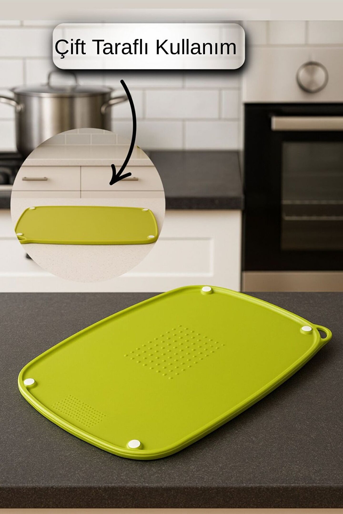 İdeal genişlikte ölçüye sahip, geniş kesim yüzeyi gıda kesim ve gıda hazırlama konusunda benzersiz deneyim sunar.; Her iki yüzeyinin de kullanılabilir olması mutfağınızda size büyük kolaylık sağlar.; Kesim yüzeyinin açılı olması ve taşma önleyici bariyerler sayesinde etrafta sıvı ya da katı artık birikmesini önler.; Kaydırmaz contalar sayesinde güvenli bir kesim deneyimi sunar.; Hızlı rendeleme bölümü ufak gıdaları rendelemeniz için özel olarak tasarlandı.; Bir yüzeyinde gıda tutucu dikenlerin olması ekstra kesim rahatlığı sağlar.; Birleşik askı aparatı ile işiniz bittiğinizde asabilirsiniz.; Gıda sunumu için uygundur.; Ürün özel olarak tasarlanmış olup, özel renk seçenekleri mevcuttur.; ; Ürün Özellikleri: •Özel Açıklamalar: Geniş kesim alanı, ideal ölçü.; Çift taraflı kesim yüzeyi.; Açılı kesme yüzeyi kırıntıları ve sıvıları toplar.; Taşma önleyici bariyer.; Kaydırmaz conta.; Kolay/hızlı rendeleme alanı.; Gıda kaymasını önleyen özel diken alanı.; Asılabilir, askı yeri entegreli.; Gıda servisi yapılabilir.; Özel tasarım.; Özel renk seçenekleri.; •Ürün Ebatı (Cm): 25,3 x 37,3 x 1 Cm •Ürün Ağırlığı (Gr): 388 Gr •Ürün Hacmi (M3): 0,001 •Ürün Hacimsel Ağırlık (DESİ): 0,315 •Materyal: Plastik (PP) •Renk(ler)/Asorti: Beyaz, Bej, Yeşil, Turkuaz •Koli İçi Miktar: 24 Adet •Koli İçi Renk(ler) (Birim): Beyaz, Bej, Yeşil, Turkuaz (x6 Adet) •Koli Ebatı (Cm): 38 x 26 x 26,5 Cm •Koli Hacmi (M3): 0,026 •Koli Ağırlığı (Kg) (Brüt - Net): 9,5 - 9,32 •Koli Hacimsel Ağırlık (DESİ): 8,73 •Koli Tipi: KSK •Gıdaya Uygunluk: Evet •BPA İçermez: Evet •Buzdolabı: Evet •Bulaşık Makinesi: Evet •Mikrodalga: Hayır •Derin Dondurucu: Hayır
