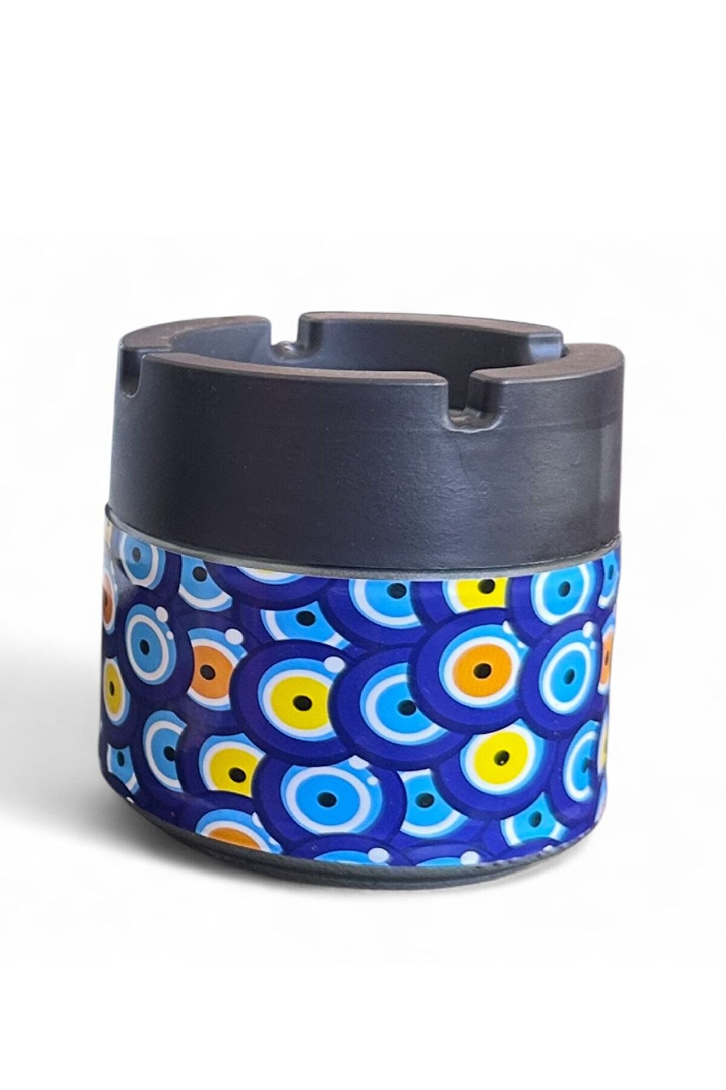 Mavi tonların ağırlıkta olduğu nazar boncuk desenli cam hazneli metal küllük, hem kullanışlı hem de koruyucu sembol anlamıyla dikkat çeker.; Balkon, teras ve kafeler için dekoratif bir seçimdir.; Özellikler: • Malzeme: Metal + cam hazne • Desen: Nazar boncuk desenli • Dayanıklı ve uzun ömürlü • Kolay temizlenebilir