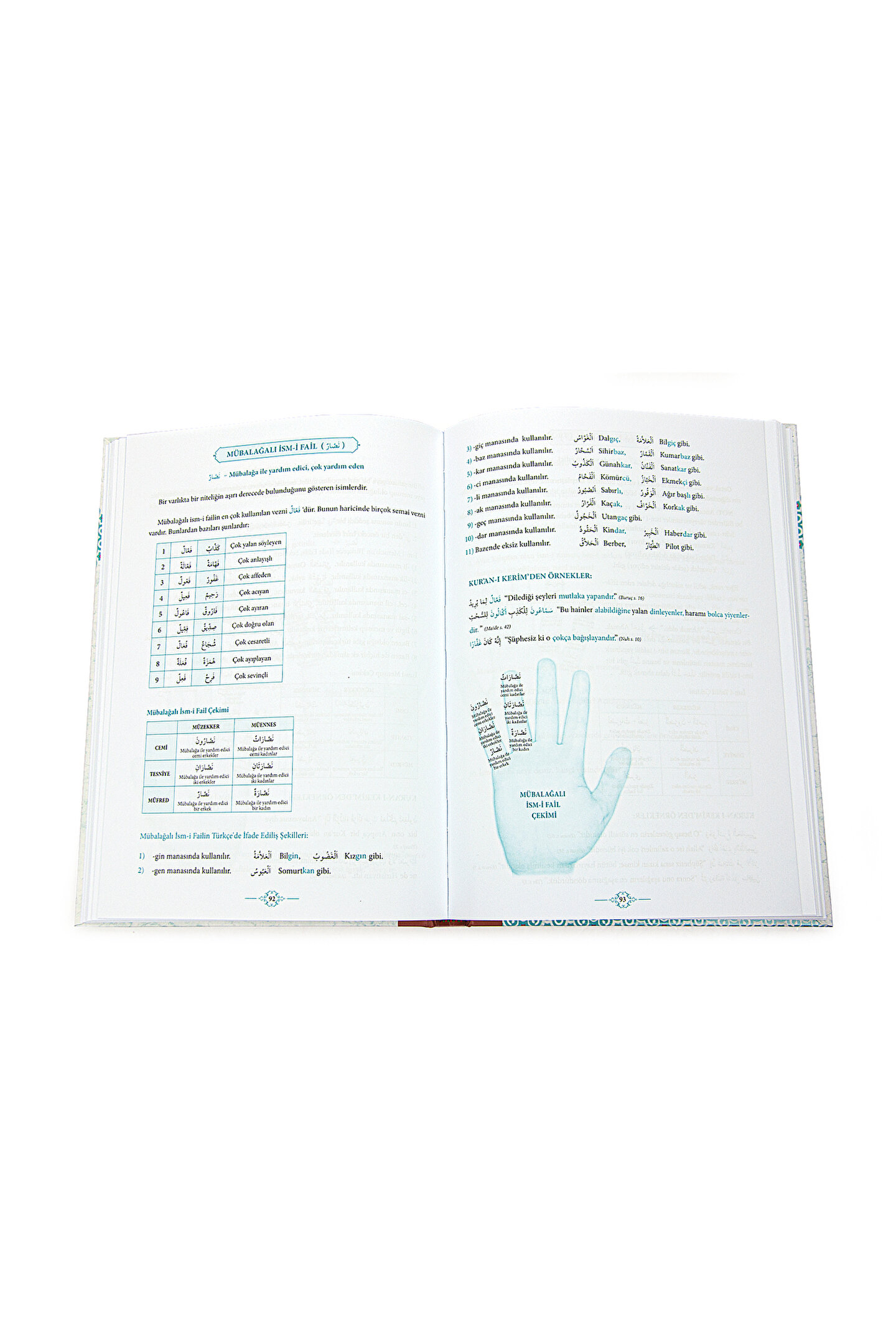Kitap Açıklaması “Muhakkak ki Arapça, bütün şer‘î ilimleri öğrenmeye vesiledir.; ” İmâm-ı Âzam Ebû Hanîfe (Rahimehullâh) İlmin tarihte hiç olmadığı kadar yetim kaldığı bir dönemde: “Her mahalleye bir erkek bir de kız medresesi açın.; Erkekleri erkek, kızları hanım hocalar okutsun,” sözleriyle ömrünü ilim ve irşâda adamış olan Mahmud Efendi (Kuddise Sirruhû) Hazretleri’nin usûlünden yola çıkan hocalar faaliyetlerini, olanca gayret ve özverileriyle sürdürmektedirler.; Bu büyük velînin iktibâs etmiş olduğumuz sözü büyük oranda yerine gelmiş, bugün yurt içi ve yurt dışı olmak üzere pek çok yerleşim biriminde erkek ve kız kursları açılmış, ilmi; öğrenmek, öğretmek ve sonraki nesillere aktarmak mühim bir vazife addedilmiştir.; İşbu vazife bilinci hâlâ diri tutulmakta ve bunu idâme ettirecek nesillerin yetiştirilmesine yönelik çalışmalar da sürdürülmektedir.; Tavsiye etmek üzere tanıtımını yapmak istediğimiz eser, uzunca bir süredir medreselerde geleneksel usul üzere Arapça dersleri veren, âlet ilimlerinin ehemmiyetinin farkında olan ve pek çok talebe mezun etmiş bir hoca hanım tarafından, mevcut eksikliklerin halline katkıda bulunmak üzere hazırlanmıştır.; Kitaba duyulan ihtiyaç, hazırlanma süreci, ilhâm ve yardım alınan kimseler de ‘Takdim’ yazısından evvel belirtilmiştir.; Arapça öğretimi konusunda son dönemde pek çok eser kaleme alınıp yayımlanmışsa da, bu eserlerin genellikle pratik Arapçaya yönelik eserler olduğu gözlemlenmektedir.; Pratik Arapçaya dönük bu tür eserlerin klasik eserler başta olmak üzere, İslâmî İlimlere yönelmek isteyen kimselere yardımcı olamayacağı gayet açıktır; ve o kardeşlerimizin müfredatta yer alan ‘sarf’ kitabı dışında pek seçenekleri de bulunmamaktadır.; Müfredatta yer alan ders kitaplarında da malumunuz olduğu üzere, konularla ilgili örnekler pek az yer tutmaktadır.; Bu sebeple talebeler, yardımcı kitaplara yönelmek zorunda kalmaktadır.; Özetlemeye çalıştığımız bu eksikliklerden yola çıkılarak bol miktarda örnek içeren ve münhasıran Kur’ân-ı Kerîm’de yer alan örnekleri ihtivâ eden bir kitabın neşrinde fayda mülâhaza edilmiştir.; Bu yönüyle tanıtmaya çalışacağımız eser, Arapça gramere yeni başlayanların, hiçbir yardımcı kitaba ihtiyaç duymadan kolaylıkla anlayabileceği şekilde hazırlanmıştır.; Kitap hazırlanırken; renklendirme, şemalı anlatım, grafikler ve boyut, istifadenin en üst seviyeye çıkarılması amacına uygun bir şekilde tasarlanmıştır.; Ayrıca Arapça gramer konularının devamının aynı menhec üzere neşri de şimdiden planlanmış durumdadır.; Kitap 6 bölümden müteşekkildir.; 1. Bölüm: Sarf ve Emsile hakkındaki temel bilgileri ve kelime çeşitleriyle ilgili malumatı ihtivâ etmektedir.; 2. Bölüm: yapısı ve türleriyle birlikte fiilleri ihtivâ etmektedir.; 3. Bölüm: yapısı ve çekimleriyle birlikte isimleri ihtivâ etmektedir.; 4. Bölüm: Sülasi mücerred fiillerin babları ve çekimlerini ihtivâ etmekte, Kur’ân-ı Kerîm’de yer alan konuyla ilgili fiilleri örneklemektedir.; 5. Bölüm: Kur’ân-ı Kerîm’de geçen sülasi mücerred fiillerin 24 sigaya göre sınıflandırılmasını ihtivâ etmektedir.; 6. Bölüm: 15 Fiilden oluşan kelime bankasını ihtivâ etmektedir.; Sayfa sayısı: 216 Boyut: 19 x 27 Cilt Tipi: Ciltli (Sert Kapak) Renk Seçenekleri: 2 Renkli Baskı Kağıt kalitesi: 1.Hamur Kağıt Son güncelleme: 19.10.2023