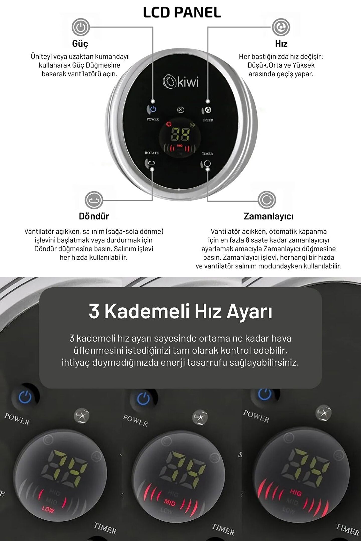 Kiwi Kfan-7690 Dijital Gösterge Panelli Yatay Salınım Fonksiyonlu Kule Tipi Turbo Vantilatör