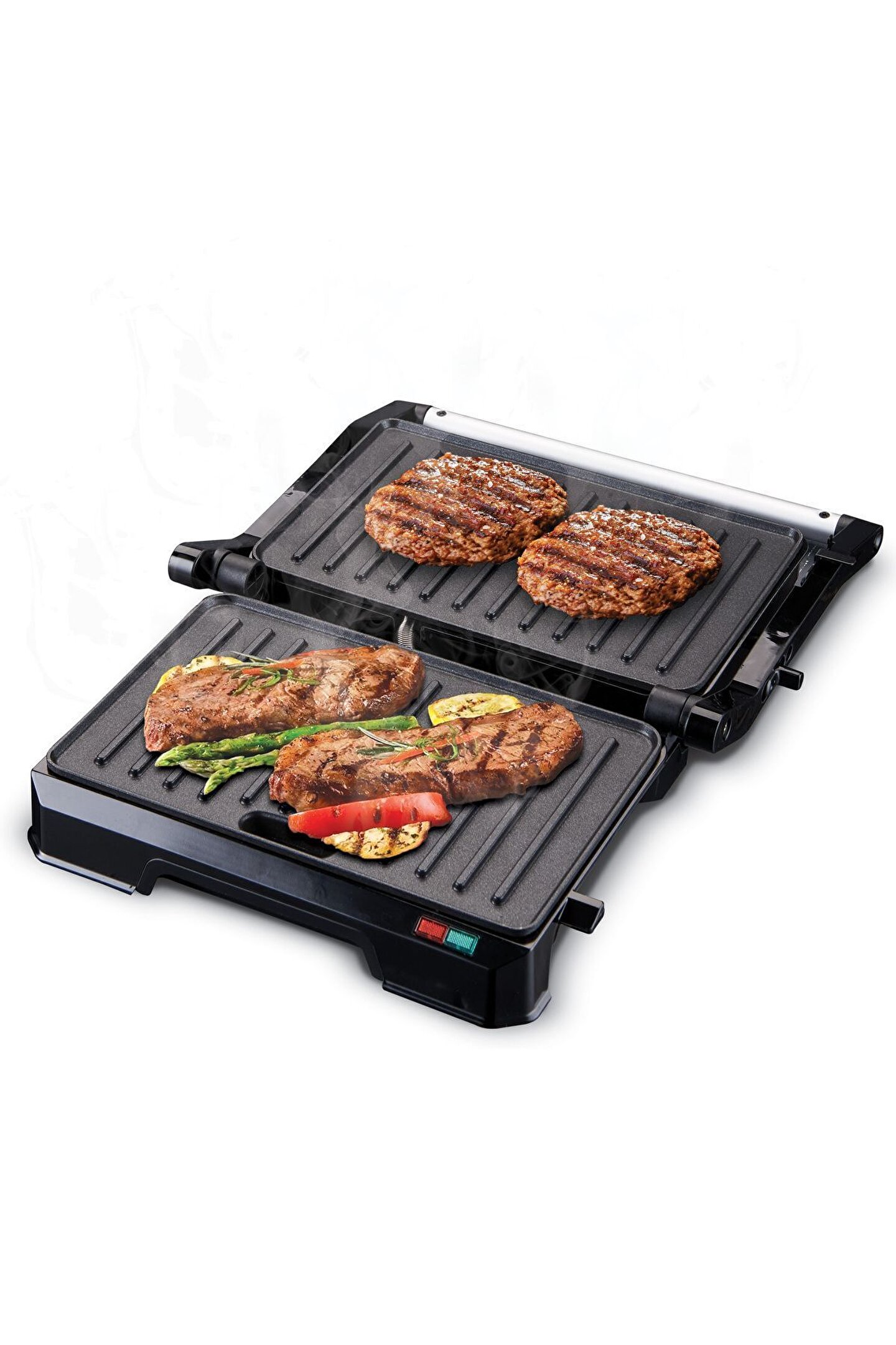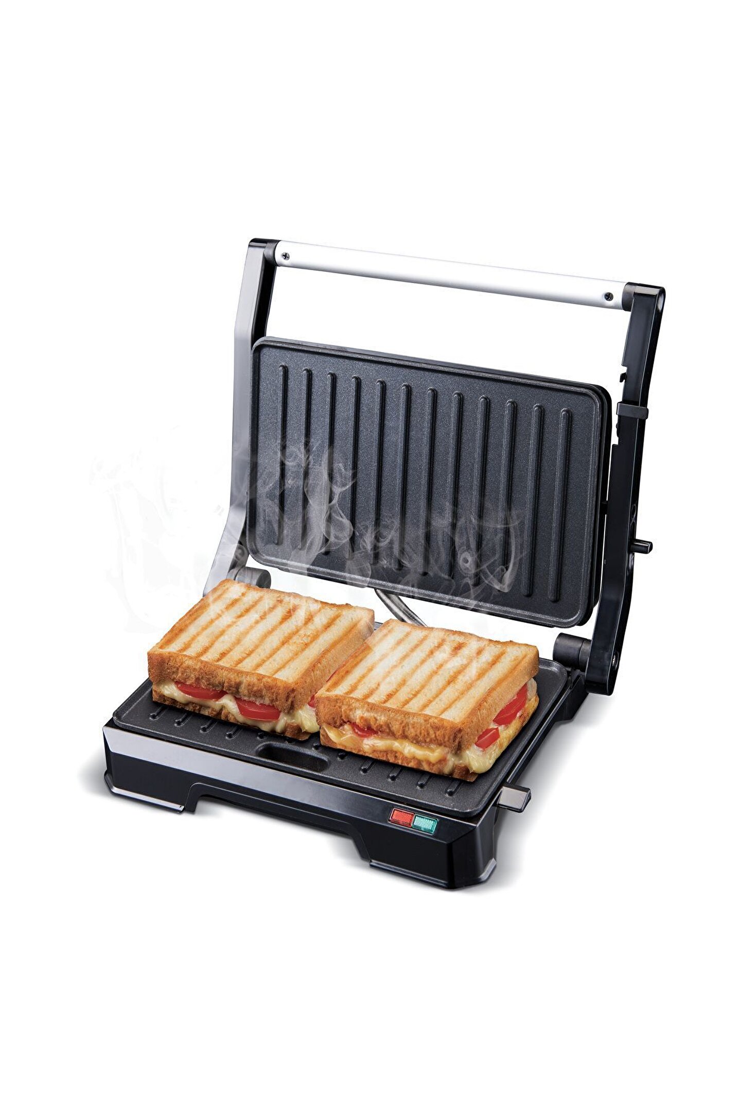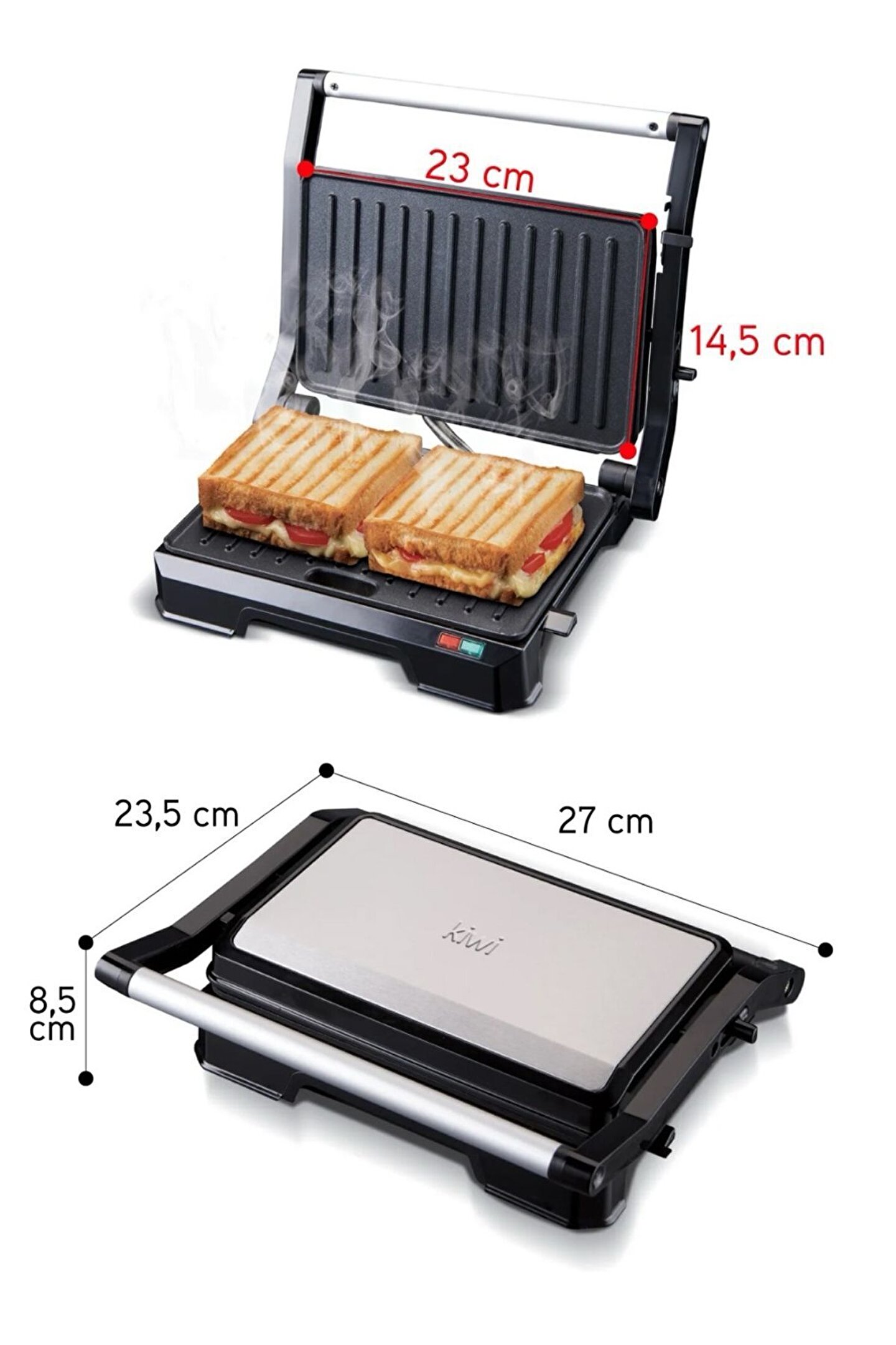 Kolay temizlik için muhafazalı plakalar.;Paslanmaz çelik gövde.;Soğuk dokunuşlu güvenli sap.;180 derece açılabilir.;90 derece kullanım için kilit.;Güç ve pişirmeye hazır ışık göstergesi.;Damlama tepsisi.;Kaymaz ayaklar.;Ürün boyutu: 283x236x84mm, plaka boyutu: 230x145mm.