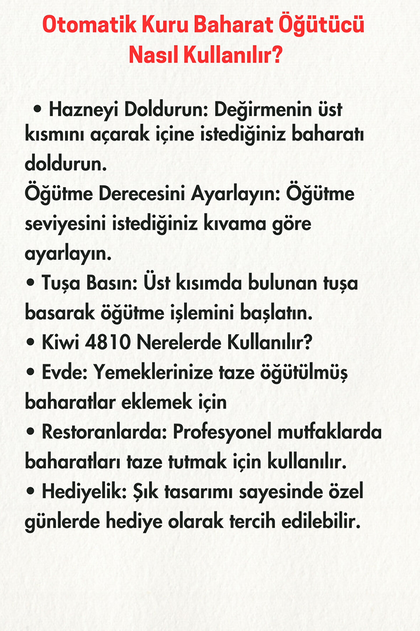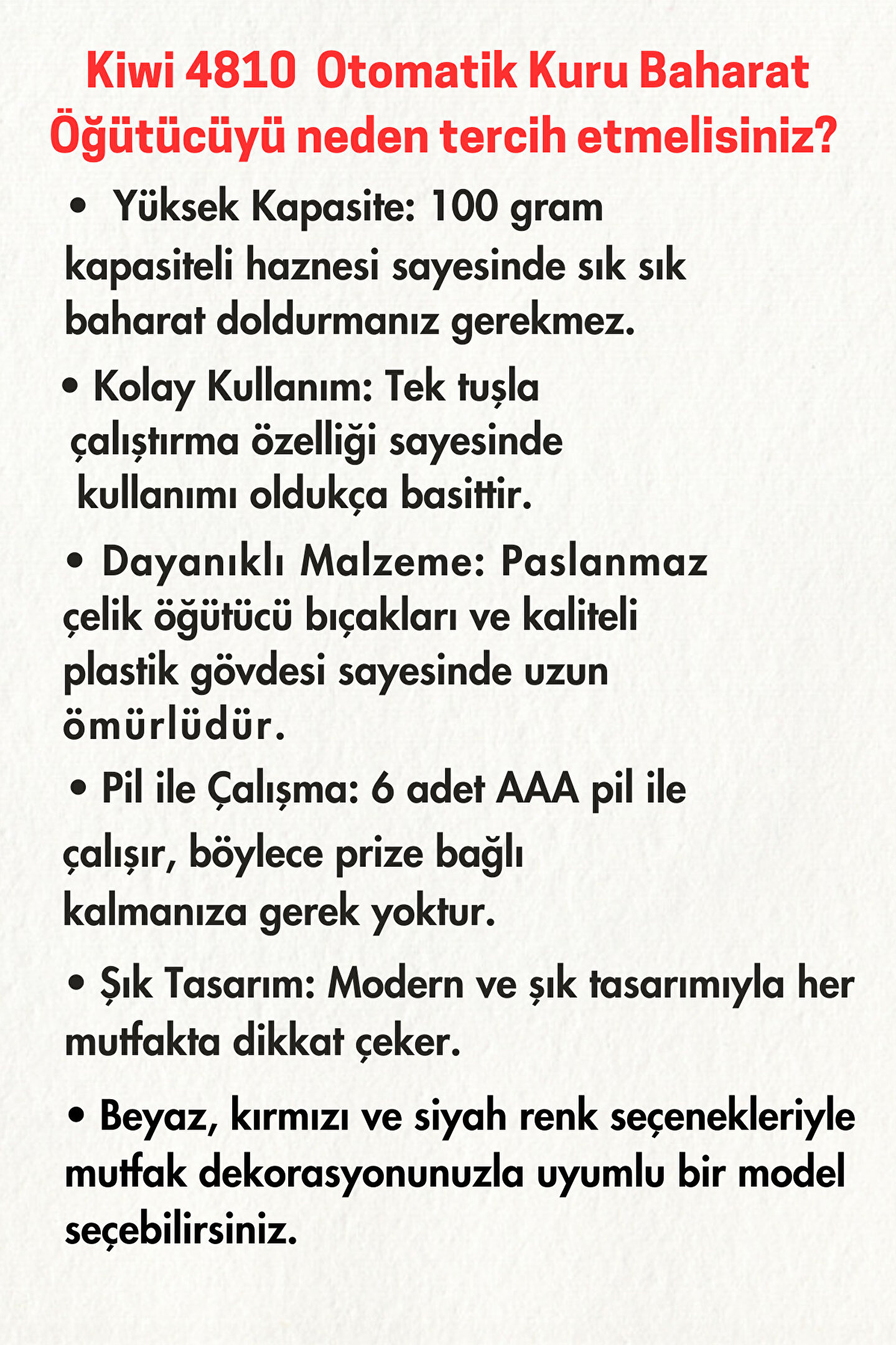 - Kolay kullanım için otomatik ayarlanabilir mekanizmaya sahip, pratik bir baharat öğütücü; - Seramik bıçakları sayesinde baharatların tazeliğini ve aromasını korurken eşit ve hızlı bir şekilde öğütme imkanı sunar; - Belirtilmemiş materyal yapısı ile dayanıklılık ve uzun ömürlü kullanım vaat eder; - Pil ile çalışan bu cihaz, elektrik prizine ihtiyaç duymadan her yerde baharatlarınızı öğütebilmenizi sağlar;