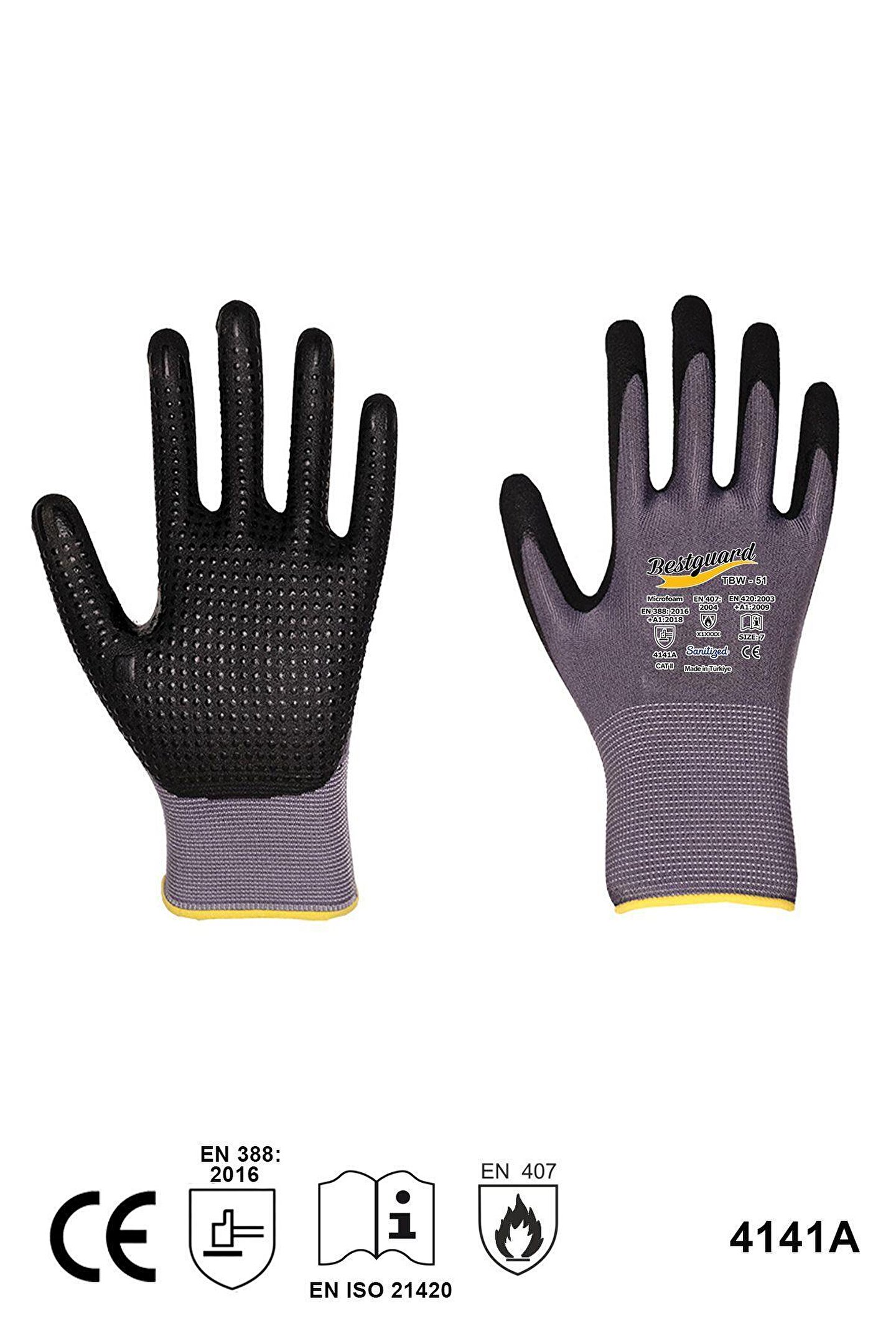 4141A EN388:2016 EN ISO 21420 Ürün özellikleri: 15G Naylon /Spandeks astar ,geliştirilmiş özel mikroköpük formülü sayesinde aşınmaya ekstra dayanıklıdır.Hava geçirgen özelliğine sahiptir ve uzun kullanım ömrü sağlar. Kaplama üzeri mikro noktalar (dotlar) eldien dayanıklığını arttırt. Hassasiyet gerektiren ve tekrarlayan uygulamalarda daha fazla korunma ve uzun kullanım avantajı sağlar. Kullanım alanlları: Beyaz eşya montajı; Bakım; İnşaat; Metal işleme ve uçak bakımı; Bahçe işleri; Plastik enjeksiyonu ve kalıplama ; komponentlerin toplaması ve sabitlenmesi; plastik enjeksiyonu; elektronik;