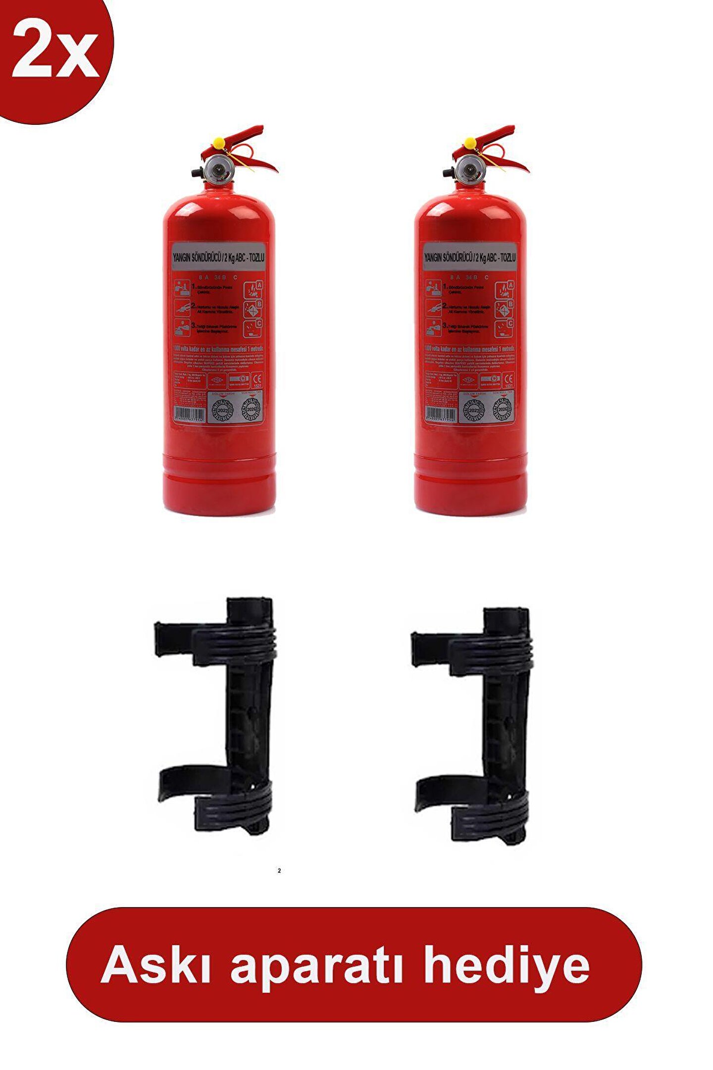 Yangın Tüpü Söndürücü Askısı Plastik 2 adet , 2 kg 2 Adet Araç Tüpü 2022 Üretim 2026 Tekrar Dolum Portatif yangın söndürücüler sınıfına girer ve genellikle araçlarda tercih edilen yangın söndürme tüpleridir. Günümüz şartları gereksimi olan araçlarımız, ulaşım için hayatımızın olmazsa olmazları haline gelmiştir. Bu her ne kadar da hayatımızı kolaylaştırsa bile riskleri de beraberinde getirir. Her ne kadar gündelik hayatın telaşına dalsak ta bu risklerin başında yangın olduğunu bir kez daha hatırlatmak isterim. Trafikte seyir halinde oluşabilecek bir yangına, profesyonel ekipler (itfaiye v.b.) gelene kadar müdahale edip olayı daha tırajik olmadan önlememiz mümkün. Araç içerisinde bulunan yangın söndürme cihazı ile yapacağınız küçük bir müdahale ile oluşa bilecek maddi veya hayati bir risk unsuru olan yangını ortadan kaldırabilirsiniz. 2kg kuru tozlu yangın söndürme cihazı teknik özellikleri; YANGIN SÖNDÜRME CİHAZI 2 KG DÜKKANLAR İÇİN İDEAL BOY A1 7114 KALİTE SIVAMA SACDAN GÖVDE GAZALTI KAYNAK , PİRİNÇ TETİK VANA TERTİBATI , İTHAL MANOMETRE 18 BAR ÇALIŞMA BASINCI 0.70 MİKRON ELEKTRO STATİK BOYA 4 YIL KULLANIM ÖMRÜ TSE BELGELİ - GARANTİLİ ARABA ; OTOBÜS; MİNÜBÜS; Gemi; Ofis; Binalar; KAMYON İÇİN İDEAL BOY YANGIN TÜPÜ; Boş ağırlığı 2,050gr; Dolu ağırlığı 4,050gr; Boşalma zamanı 8sn; İşletme basıncı 18bar; Etkili olduğu yangın ABC; Çalışma sıcaklığı -30/+60;