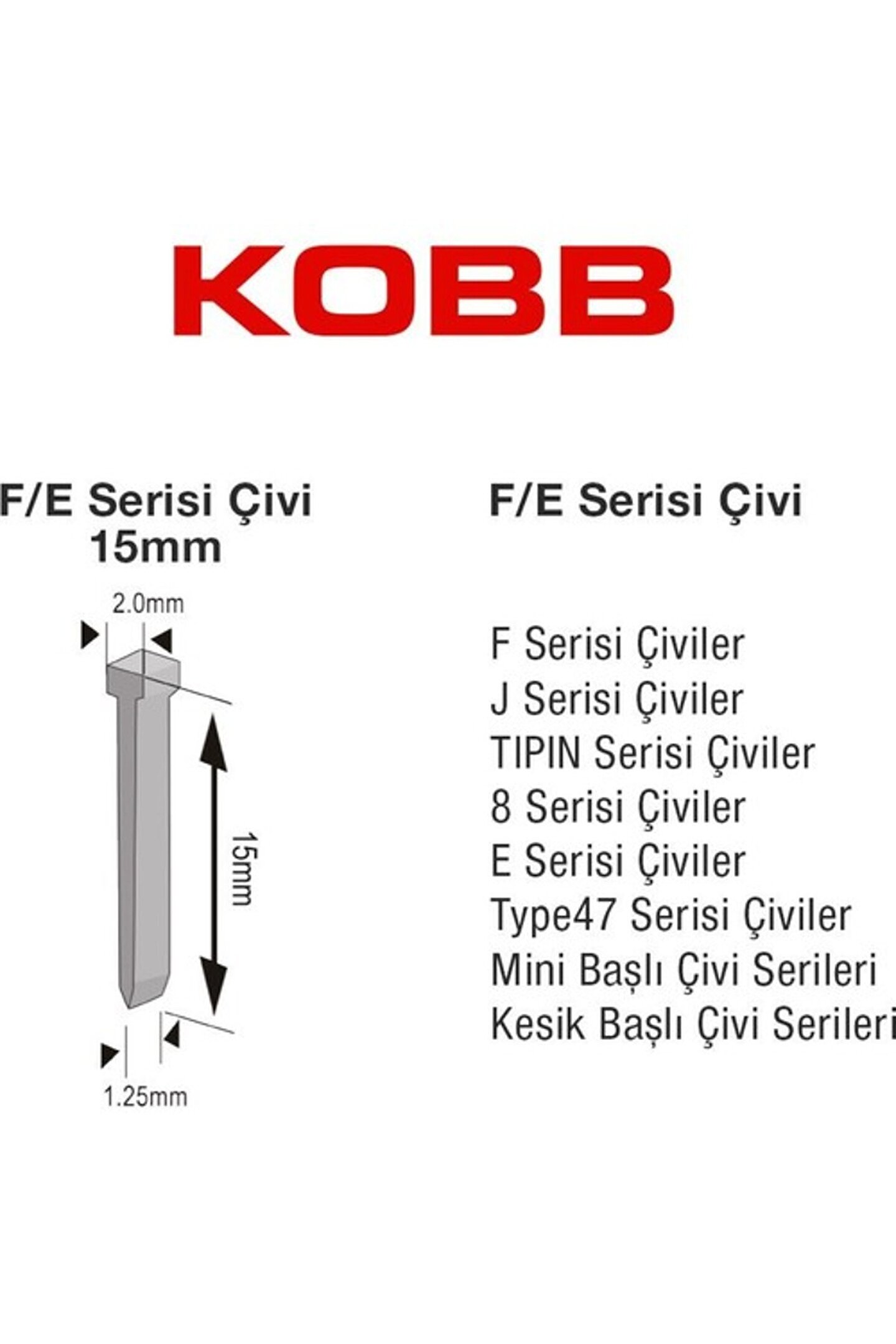 · KOBB KBZ15F 15mm 2500 Adet F/E/J/8 Serisi Ağır Hizmet Tipi Kesik Başlı Çivi · 15mm çivi/bacak yüksekliği ve 2mm çivi/baş genişliği ile F/E/J/8 serisi, TIPIN Serisi, Type47 Serisi, Mini Başlı, Universal tüm kesik başlı çivi çakma tabancaları ve kesik başlı çivilere muadil olarak kullanıma uygundur.; · Yüksek kaliteli galvaniz kaplı ve uluslararası standartlara uygun üretilen KOBB kesik başlı çiviler ile süpürgelik montajında, görünmez bağlantı montajlarında, lambri ve zemin döşeme montajlarında, ambalajlama, masa, sandalye, mobilya döşeme montajlarında, reklam/tabela montajında, ahşap maket işlerinde, yalıtım, onarım uygulamalarında yüksek performans sağlar.; · Özel Galvaniz kaplama sayesinde dış mekân uygulamalarında rakiplerine oranla paslanmaya karşı maksimum dayanaklık ve koruma sağlar.; · Özel olarak keskinleştirilmiş çivi uçları sayesinde en sert malzemede dahi sorunsuz temiz ve hızlı delme sağlar.; · Özel olarak keskinleştirilmiş uçlar sayesinde ucun eğilmesini ve makinada sıkışmasını önleyerek maksimum performans ve mukavemet sağlar.; · Üstün kaliteli çelik tel ve galvaniz kaplaması sayesinde bükülmeyi ve sıkışmayı en aza indirir.; · KOBB F/E Serisi Kesik Başlı Çiviler; KOBB KBZ200 Zımba/Çivi Çakma Makinası, KBZ200B Zımba/Çivi Çakma Makinası, KBZ90 Zımba/Çivi Çakma Makinası, Kesik başlı çivi atabilen tüm Elektrikli/Havalı çivi çakma makineleri ile kullanılır, bu sayede en yaygın kullanılan çivi çakma tabancaları ile her zaman sorunsuz kullanım imkânı sağlar.; · Uyumlu Çivi Serileri; · KOBB F/E Serisi Çiviler · F Serisi Çiviler · J Serisi Çiviler · TIPIN Serisi Çiviler · 8 Serisi Çiviler · E Serisi Çiviler · Type47 Serisi Çiviler · Mini Başlı Çivi Serileri · Kesik Başlı Çivi Serileri · Standart İçerik: 2500 Adet Galvaniz Kaplı 15mm Ağır Hizmet Tipi Kesik Başlı Çivi