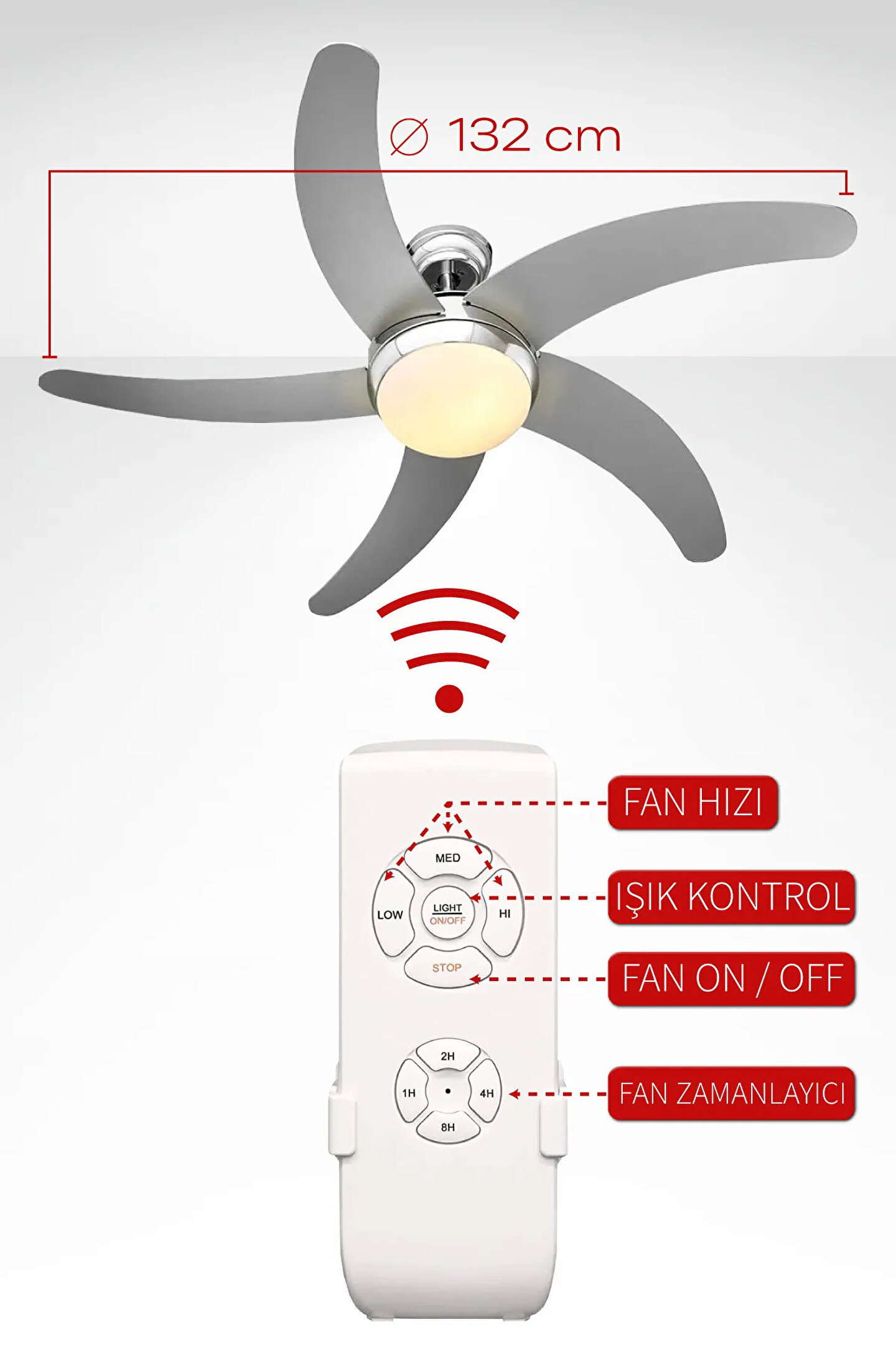 Platin Tavan Vantilatörü sıcak yaz günlerinde serinlemenizi sağlıyor.; ; Tavan vantilatörleri kullanacağınız alanın büyüklüğü ve vantilatörün kanat sayısı dikkate alınarak seçilmelidir.; ; Ampul fiyata dahil değildir.; ; Uzaktan Kumanda:Var ; Tavan Arası Yüksekliği: 41 cm ; Çapı:132 cm ; Kanat Sayısı:5 Kanatlı ; Hız Kademesi:3 ; Serinletme Alanı m2:30-40 m2 ; Genişlik:132 cm ; Derinlik:132 cm ; Ampul Sayısı:2 Ampul ; Maksimum Watt:60 Watt ; Duy Tipi:E14 Duylu ; Voltaj 220 Volt ; Renk:Gri ; RPM Değeri: Dönüş Hızı/dk160 ; 2 yıl Garanti ;