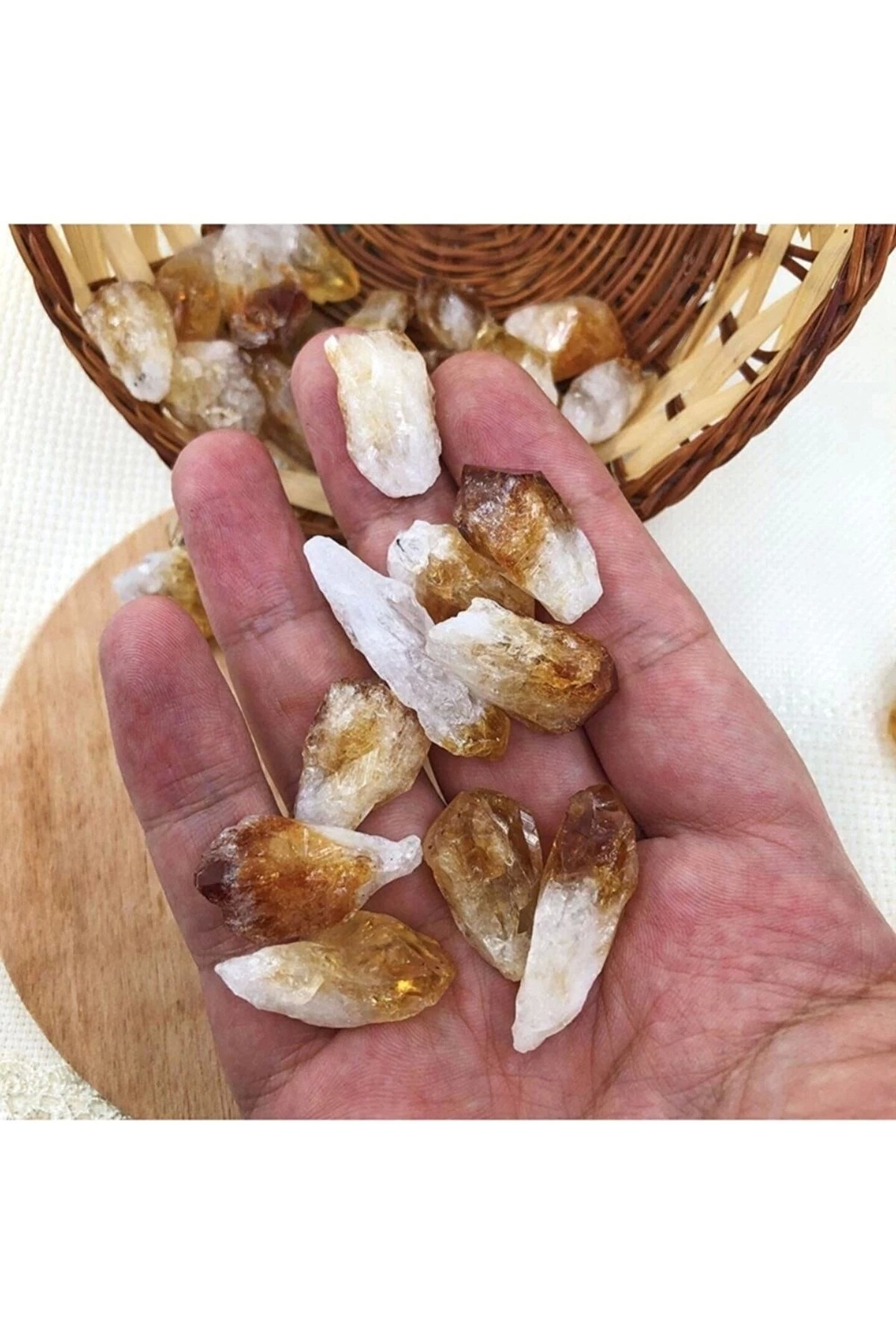 Ortalama 2-3 CM cüzdan ve çantada taşınabilecek işlenmemiş ham tamamen doğal sitrin taşı.; Fiyat 1 adet taş fiyatıdır.; Sitrin taşı, rengi sarıdan açık kahveye doğru giden genellikle bal sarısı tonlarında bulunan, nadiren saydam, genellikle yarı saydam yada opak olarak bulunabilen bir kuvars kristalidir.; Sitrin adını, renginden dolayı “limon” anlamına gelen Fransızca “citron” kelimesinden almıştır.; “Tüccar Taşı” yada “Başarı Taşı” olarakta anılan Sitrin taşı, yüzyıllarca bolluk, bereket ve para getirdiğine inanıldığı için kasalara konulmuştur.; Yüzyıllarca zenginlik ve bollukla ilişkilendirilmiştir.; Romalılar için bu taş, haberci tanrı Merkür’ün taşıydı.; Günümüzde ise benzer amaçla çanta, cüzdan yada cepte taşınmaktadır.; Sitrin kristalinin zenginlik ve başarıyı getirmek yada çekmek için bu kadar güçlü olmasının bir başka nedeni bu taşın niyetlerinizi güçlendirmesidir.; İşyerinizde ve evinizde uygun gördüğünüz bir yere koyabilirsiniz.