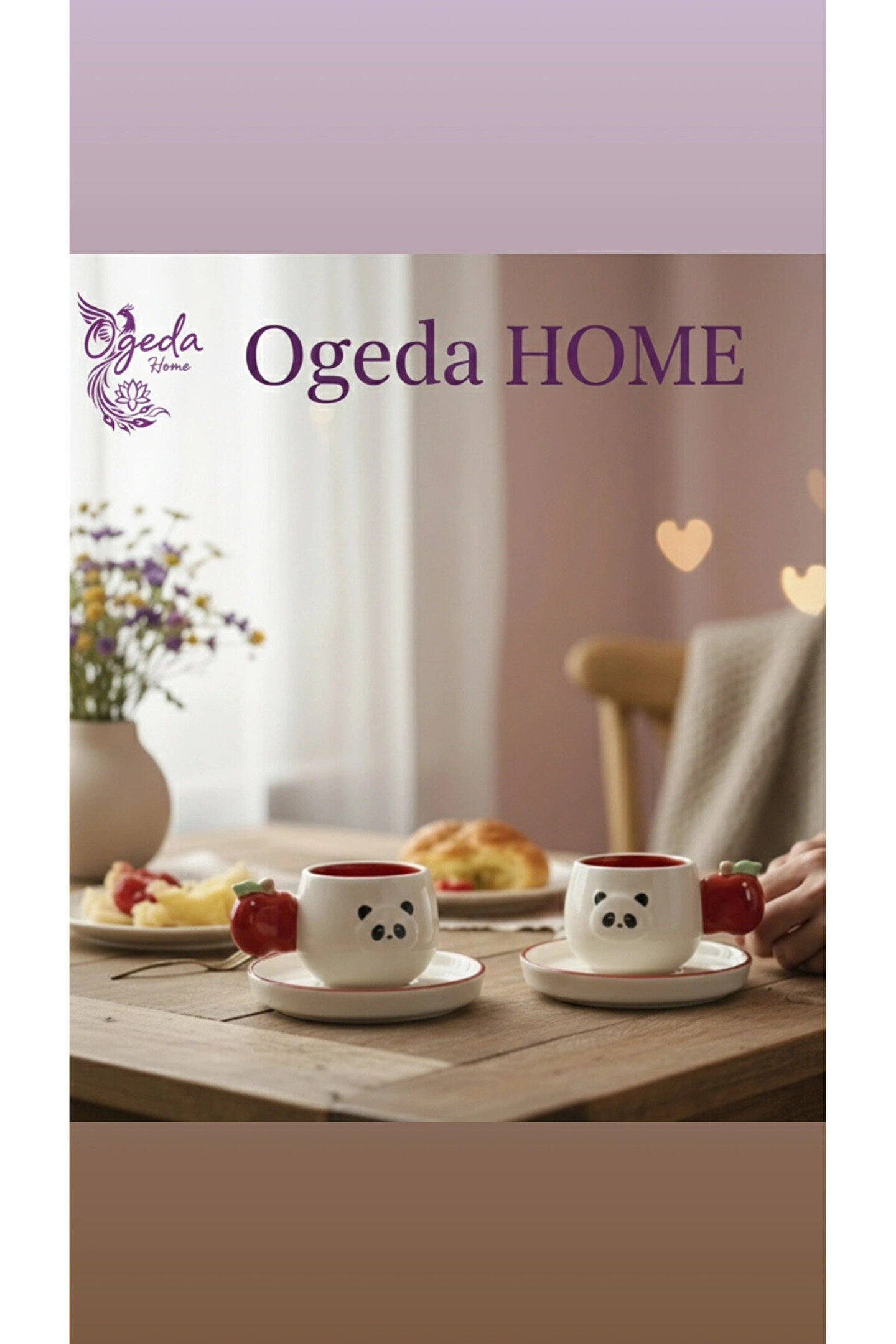 Panda Figürlü 2’li Fincan Seti–Elma Kulplu Seramik Kahve Fincanı–Fincan Takımı–Hediye Fincan