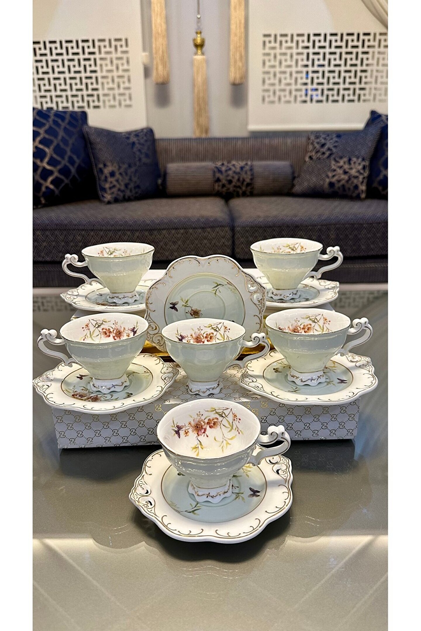 Lacivert Gold Desenli Lüks 6’lı Porselen Kahve Fincan Takımı