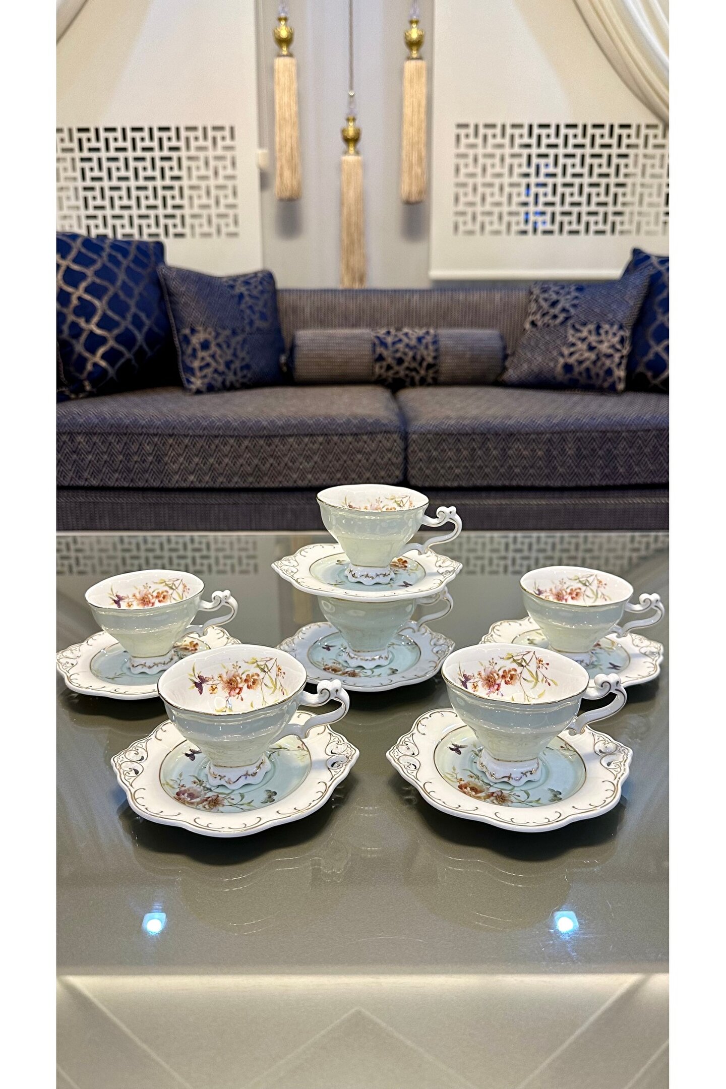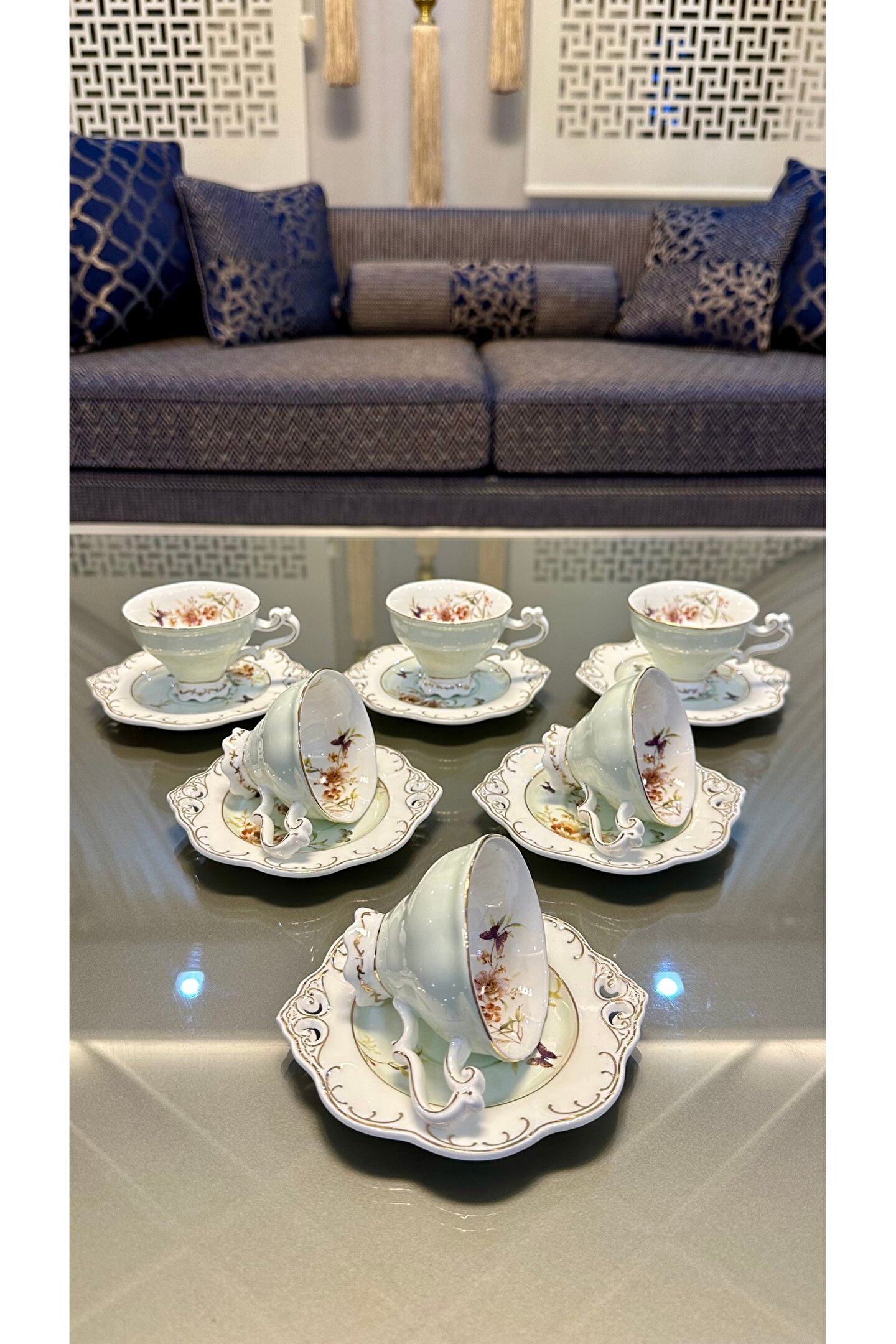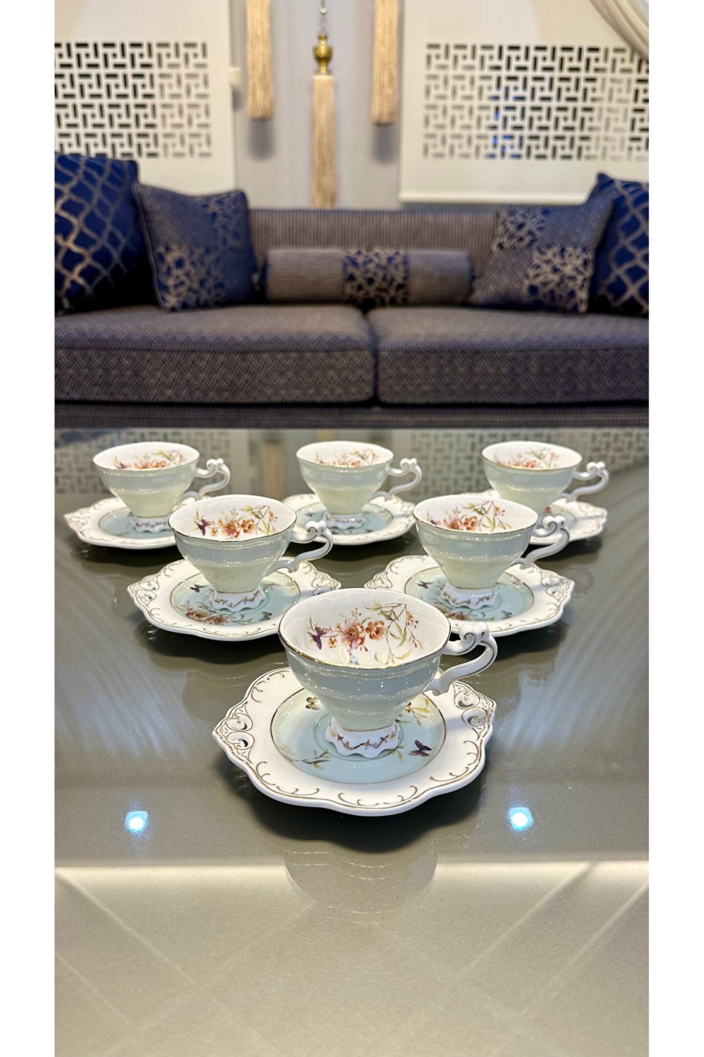 KOSOVA Marka 6 Kişilik Ayaklı Su Yeşili Güllü Kahve Sunumlarınıza Şıklık Katacak Kahve Fincan Takımı 90 ml Almaktadır