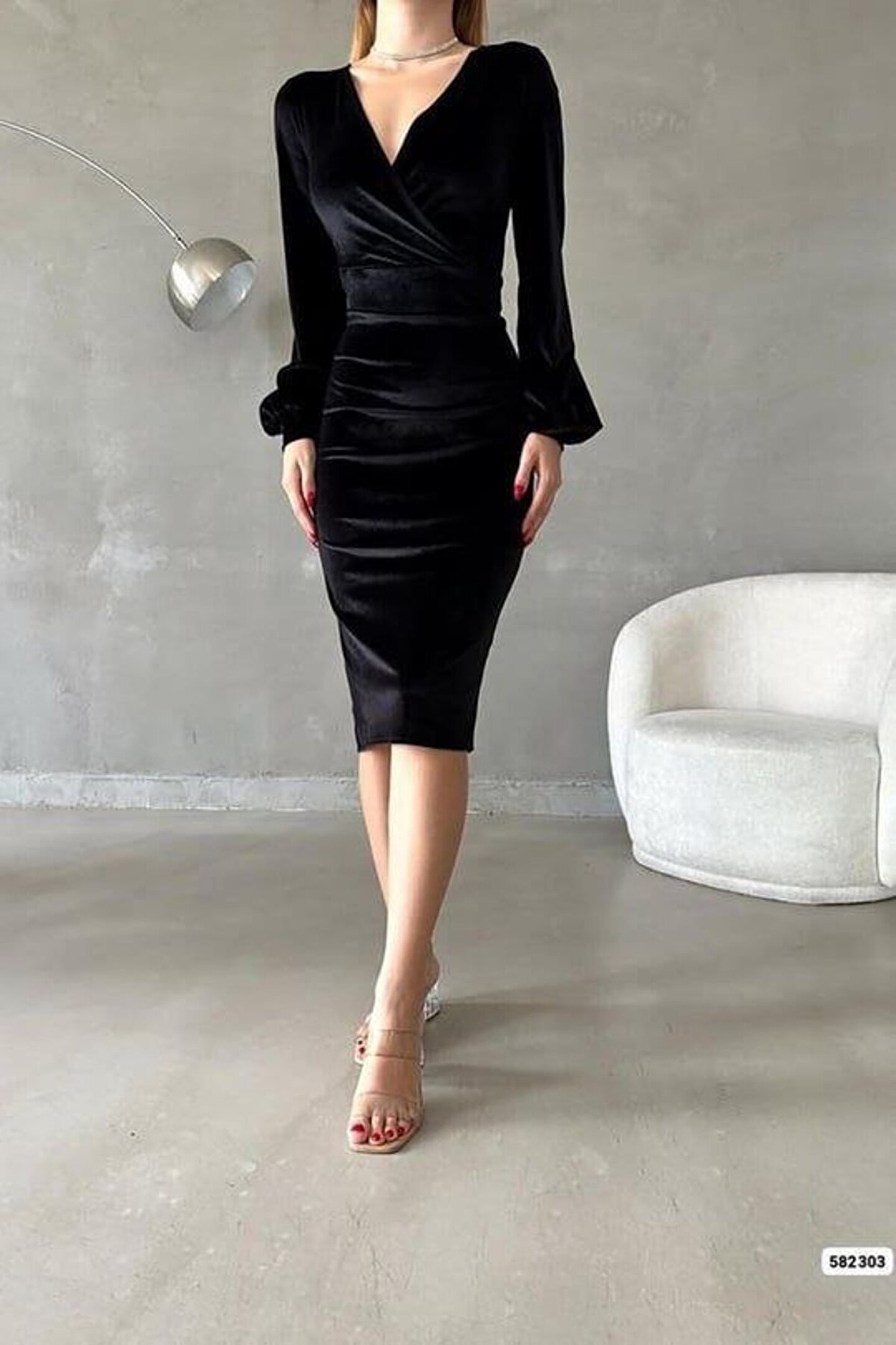 Kadın Kadife Kumaş Kruvaze Yaka Balon Kol Ve Yırtmaç Detaylı Midi Boy Elbise