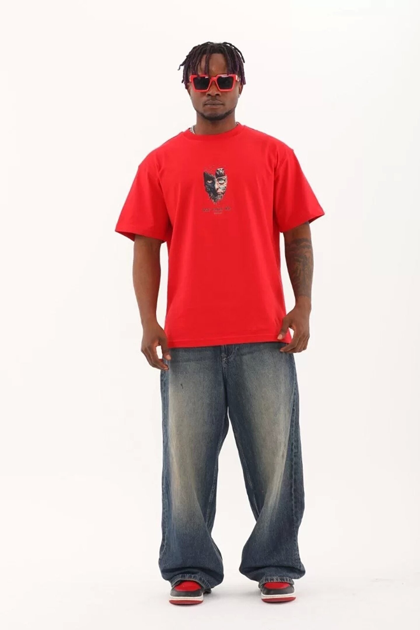 KOZMERA BUTİK Unisex Oversize Baskılı Bisiklet Yaka T-Shirt - Kırmızı