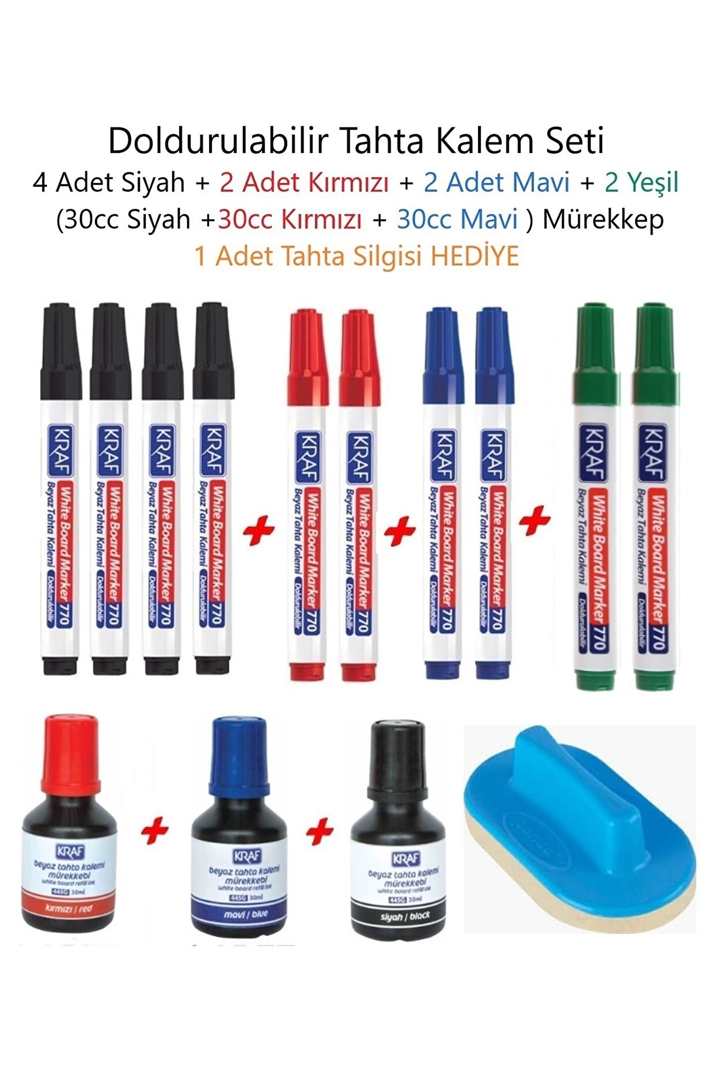 2 x Kırmızı Kraf 770 Doldurulabilir Tahta Kalemi ; 2 x Mavi Kraf 770 Doldurulabilir Tahta Kalemi ; 4 x Siyah Kraf 770 Doldurulabilir Tahta Kalemi ; 2 x Yeşil Kraf 770 Doldurulabilir Tahta Kalemi ; 1 x Siyah Tahta Mürekkebi 30cc ; 1 x Mavi Tahta Mürekkebi 30cc ; 1 x Kırmızı Tahta Mürekkebi 30cc ; 1 x Plastik Keçeli Tahta Silgisi ; Ürün Özellikleri ; Okul ve dershane sınıflarında, toplantı ve seminer odalarında kullanılan beyaz yazı tahtaları üzerinde, yazı yazmak, grafik çizmek ve işaretleme yapabilirsiniz. ; Emaye,cam ve melamin gibi tüm gözeneksiz yüzeylerden kuru bir silgi ve bez yardımıyla kolayca silinebilir. ; Hızlı kuruyan ve ışığa dayanıklı mürekkep özelliğine sahiptir. ; Kalem kapağı açık olarak birkaç gün bırakılsa bile kurumaz. ; Çizgi kalınlığı: 1.5-3mm. Yuvarlak uç. ; Cap-Off özelliğine sahip mürekkebi sayesinde kalem kapaği altı hafta açık bırakılsa bile kurumaz. ;