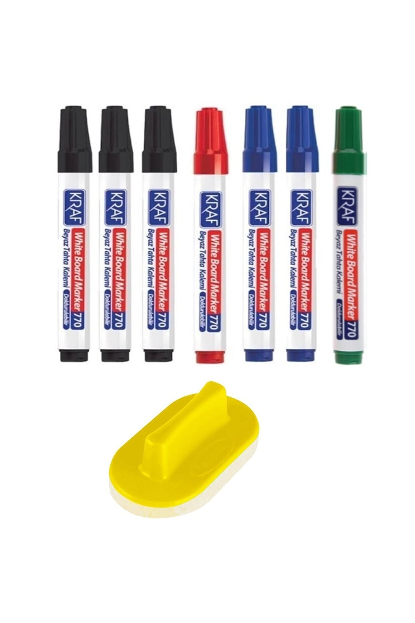 Doldurulabilir 7 Kalem + 1 Tahta Silgisi, ; Paket İçeriği 3 Adet Siyah Doldurulabilir Tahta Kalemi ; 2 Adet Mavi Doldurulabilir Tahta Kalemi ; 1 Adet Kırmızı Doldurulabilir Tahta Kalemi ; 1 Adet Yeşil Doldurulabilir Tahta Kalemi ; 1 Adet Tahta Silgisi ; Ürün Özellikleri Okul ve dershane sınıflarında, toplantı ve seminer odalarında kullanılan beyaz yazı tahtaları üzerinde, yazı yazmak, grafik çizmek ve işaretleme yapabilirsiniz. ; Emaye,cam ve melamin gibi tüm gözeneksiz yüzeylerden kuru bir silgi ve bez yardımıyla kolayca silinebilir. ; Hızlı kuruyan ve ışığa dayanıklı mürekkep özelliğine sahiptir. ; Kalem kapağı açık olarak birkaç gün bırakılsa bile kurumaz. ; Çizgi kalınlığı: 1.5-3mm. Yuvarlak uç. ; Cap-Off özelliğine sahip mürekkebi sayesinde kalem kapağı altı hafta açık bırakılsa bile kurumaz. ;