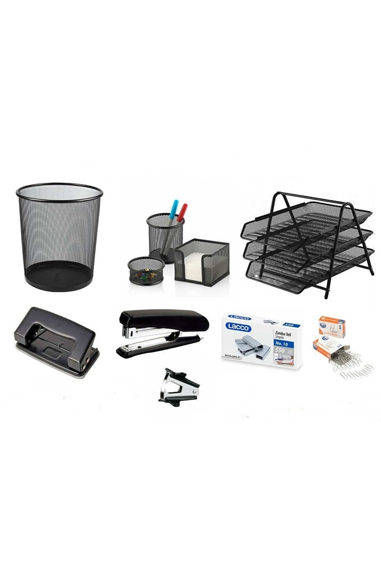 Kraf 8 Parça Masa Üstü Ofis Seti 8 PARÇA MASA ÜSTÜ OFİS SETİ 1 ADET EVRAK RAFI 3 LÜ RAYLI METAL 1 ADET METAL ÇÖP KOVASI 1 KUTU (1000'Lİ) ZIMBA TELİ NO:10 1 ADET 3 PARÇA KALEMLİK (KALEM KUTUSU,ATAŞLIK,KÜP BLOKLUK) 1 ADET ZIMBA MAKİNESİ (NO:10) 1 ADET DELGEÇ (10 SAYFA) 1 ADET ZIMBA TEL SÖKÜCÜ 1 KUTU 3 NO ATAŞ (1 KUTU DA 100 ADET ATAŞ);