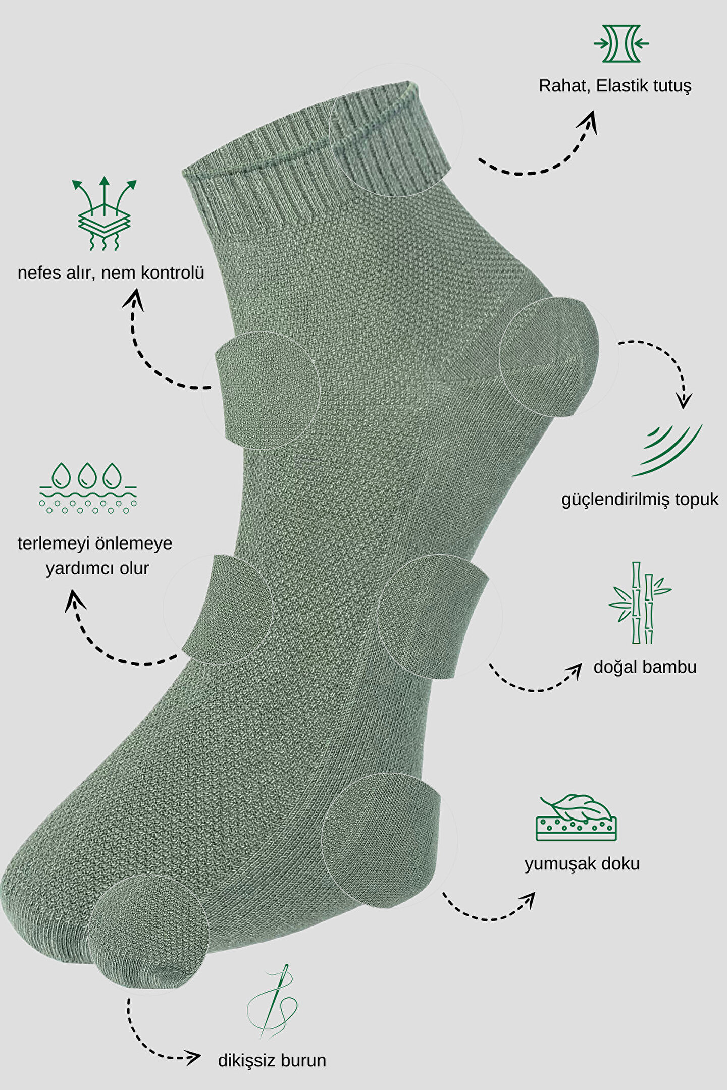 - Bambu materyali sayesinde ayaklarınız gün boyu nefes alır ve doğal bir yumuşaklık sunar; - Parfümlü yapısı ile hoş bir koku sağlar ve ayaklarınızın taze kalmasına yardımcı olur; - 30 derecede yıkama imkanı sunarak kolay bakım ve uzun ömürlü kullanım vaat eder; - Her yaş grubuna uygun tasarımıyla geniş bir kullanıcı yelpazesine hitap eder; - Young koleksiyonunun enerjik ve dinamik ruhunu yansıtan modern bir görünüm sunar; - Düz tasarımı ile sade ve şık bir stil oluştururken, lacose kabartma deseniyle dikkat çekici detaylar ekler; - Kaçmaya dayanıklı yapısı sayesinde sık kullanımda bile formunu korur ve dayanıklılık sağlar; - Lastikli tasarımı ile kolay giyilip çıkartılabilir ve mükemmel uyum sağlar; - Kısa silueti, rahat hareket etme özgürlüğü sunarken, düz deseniyle her türlü kıyafetle uyumlu bir görünüm kazandırır.; - Jakar dokuma tipi, dayanıklılığı arttırarak ürünün formunu uzun süre korumasına yardımcı;