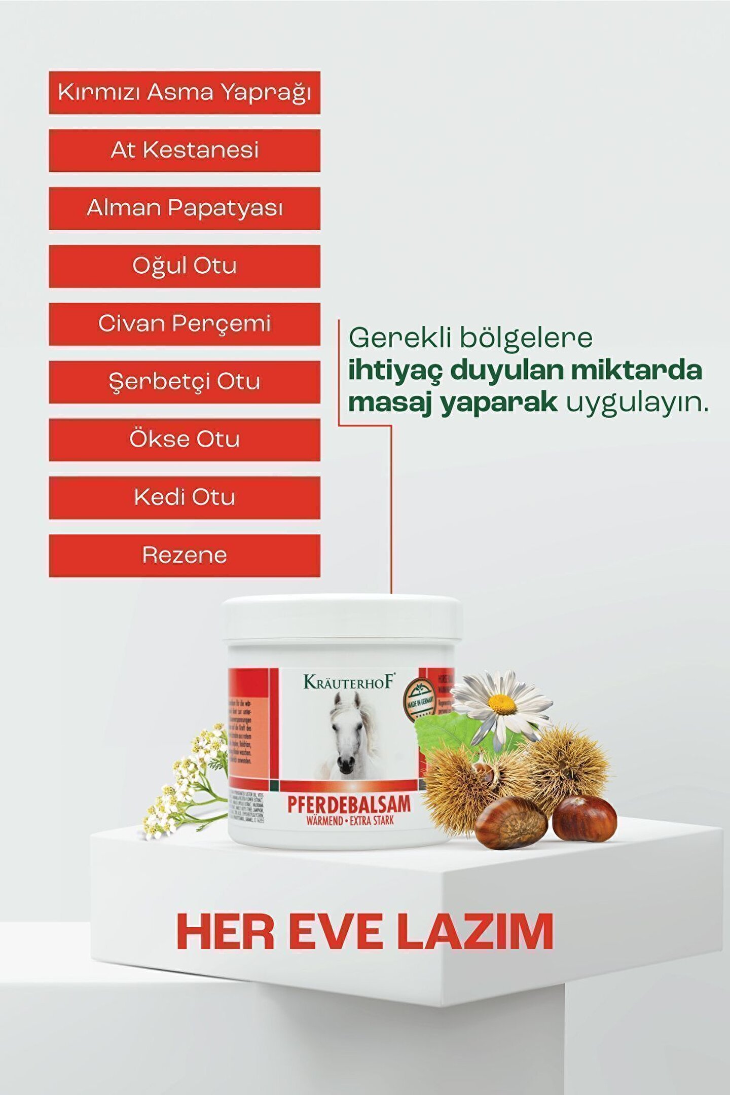 Krauterhof At kestanesi Masaj Jeli ; yapılacak masajla adalelerin rahatlamasına gevşetilmesine, sakinleştirilmesine yardımcı olur. Kırmızı asma yaprağı, at kestanesi, alman papatyası, oğul otu, civan perçemi, şerbetçi otu, ökse otu, kedi otu, rezene içerir. Öneri: Spor öncesi de kullanılabilen Krauterhof At kestanesi masaj jeli kullanım esnasında ısınma hissi oluşturur.