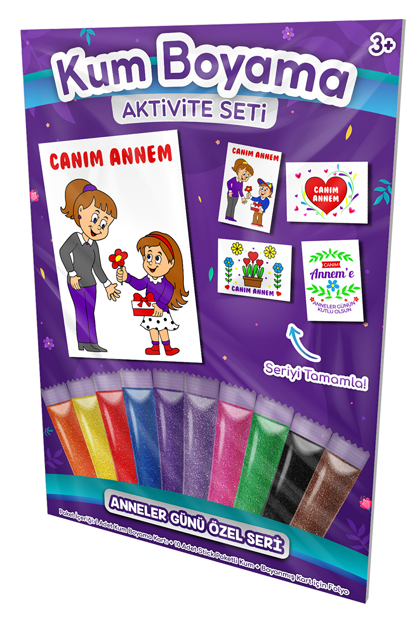 Kum Boyama : Kendinden yapışkanlı ve resimli kartların, renkli kumlarla boyama tekniğidir.; Kartın üzerindeki resim, bir şablon şeklinde, yarı kesik parçalar halindedir.; Sıra ile parçalar kaldırılarak, her kaldırma işleminden sonra renkli kum serpilmek suretiyle boyama yapılır ve tamamlanır.; 3 yaş üzeri uygundur.; Ürünümüz CE belgelidir.; Ayrıca, Avrupa Oyuncak Standartı EN-71,72,73 e uygundur.; Paket İçeriği : * 1 Adet Kum Boyama Kartı ( 23,5cm x 33,0cm, yaklaşık A4 ).; * 10 Adet ( renk ) şeffaf Stick Paketli Renkli Kum ( yaklaşık 7'şer gram ).; * 1 adet Boyanmış Kart için şeffaf Folyo.; * Kürdan.